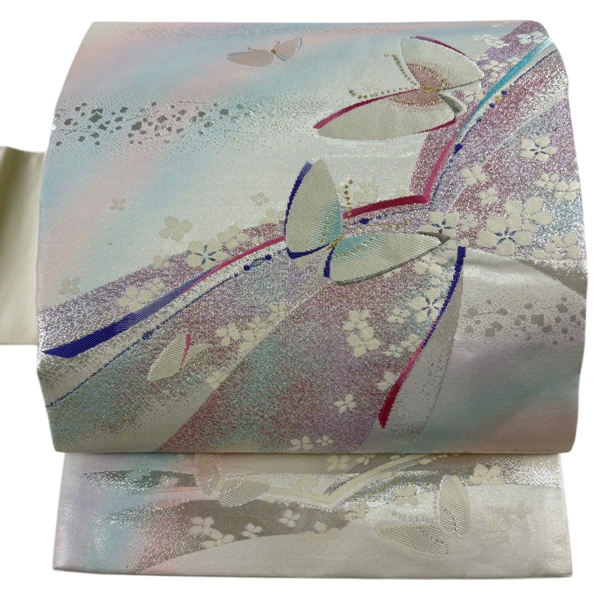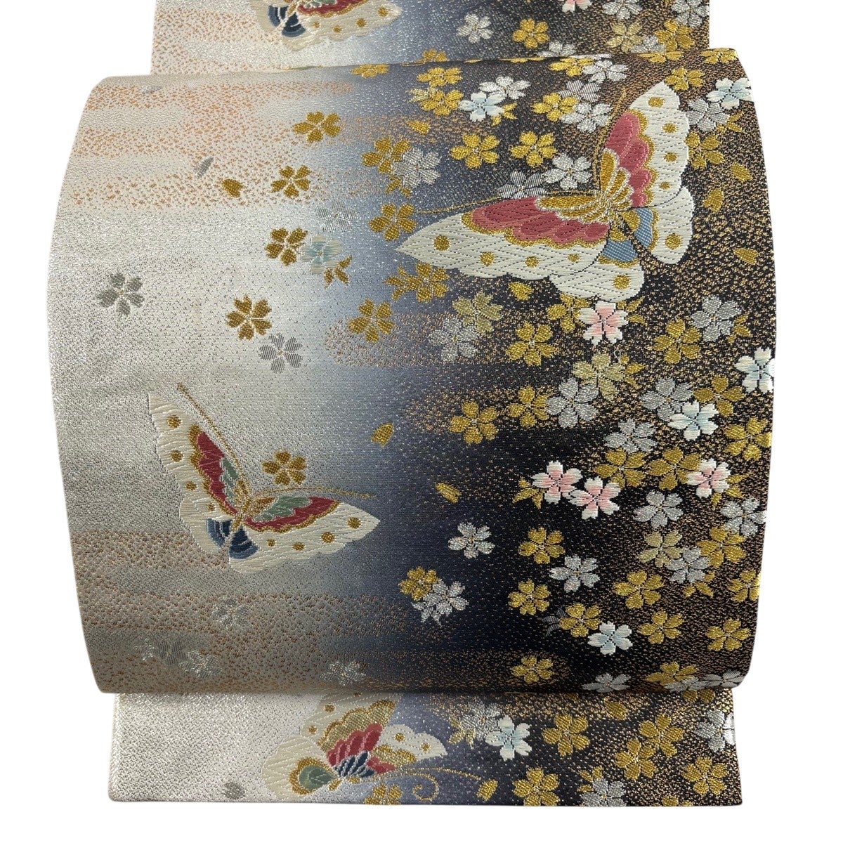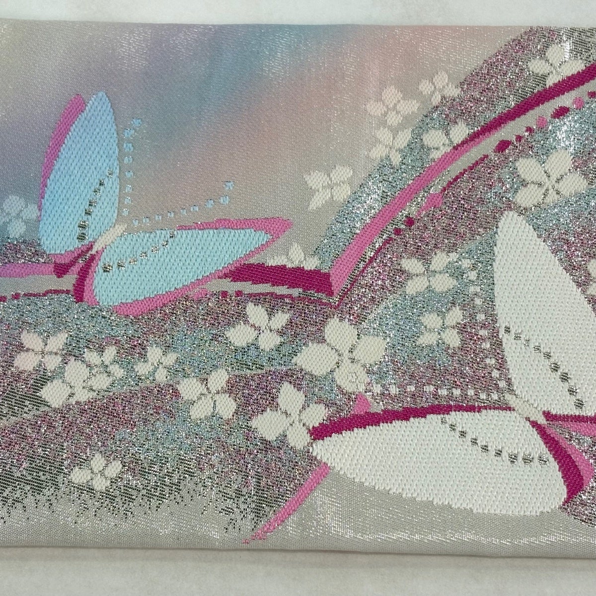 30%OFF 袋帯 秀品 蝶 桜 唐織 箔 銀色 六通 正絹 K30