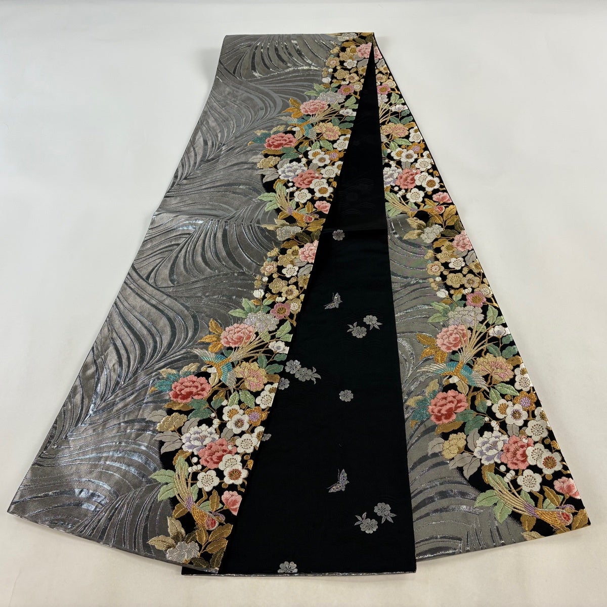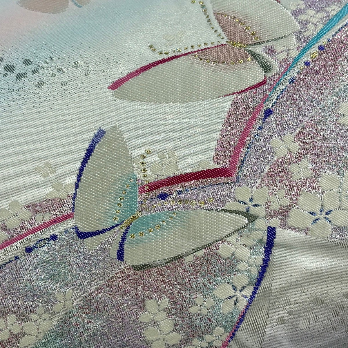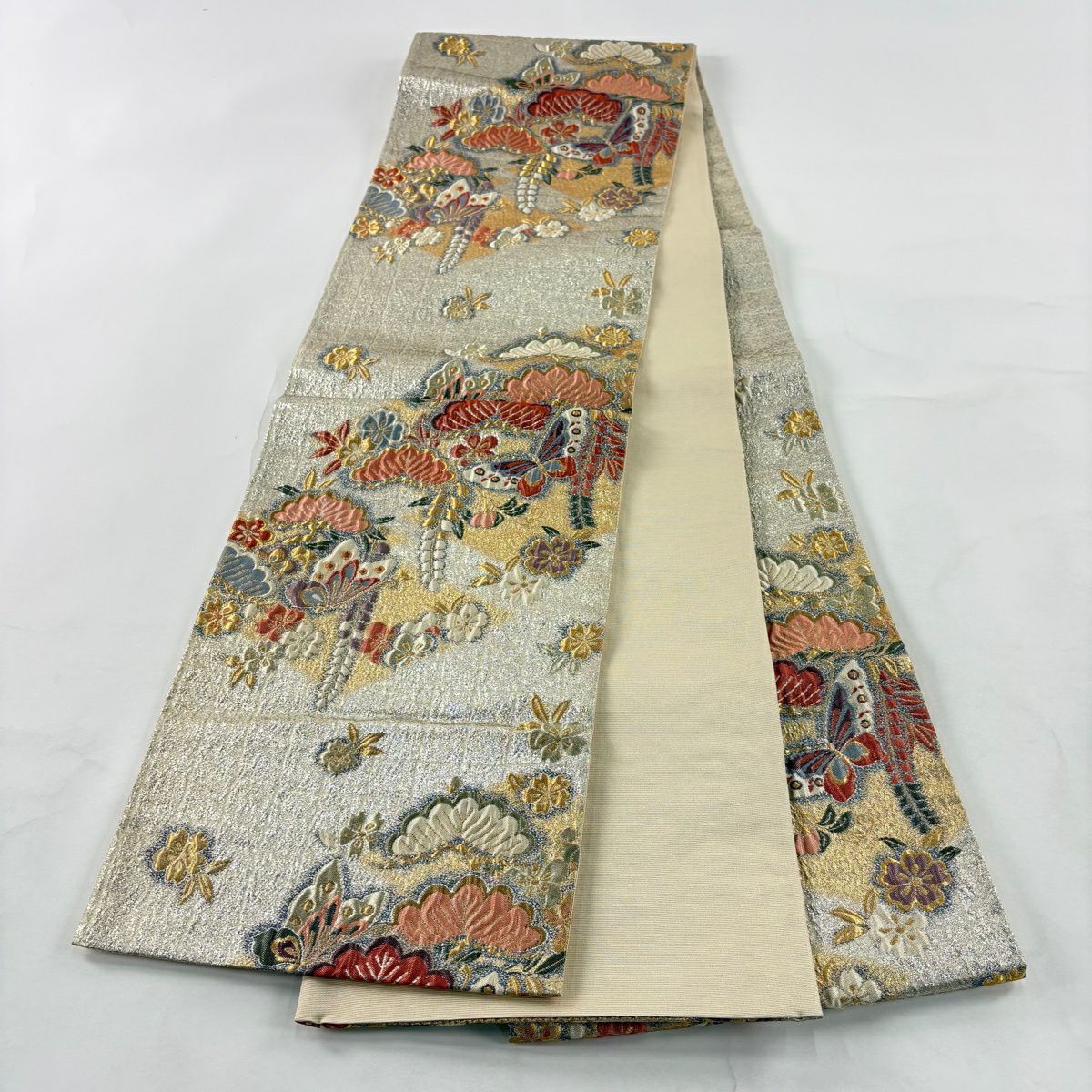 30%OFF 袋帯 秀品 蝶 桜 唐織 箔 銀色 六通 正絹 K30