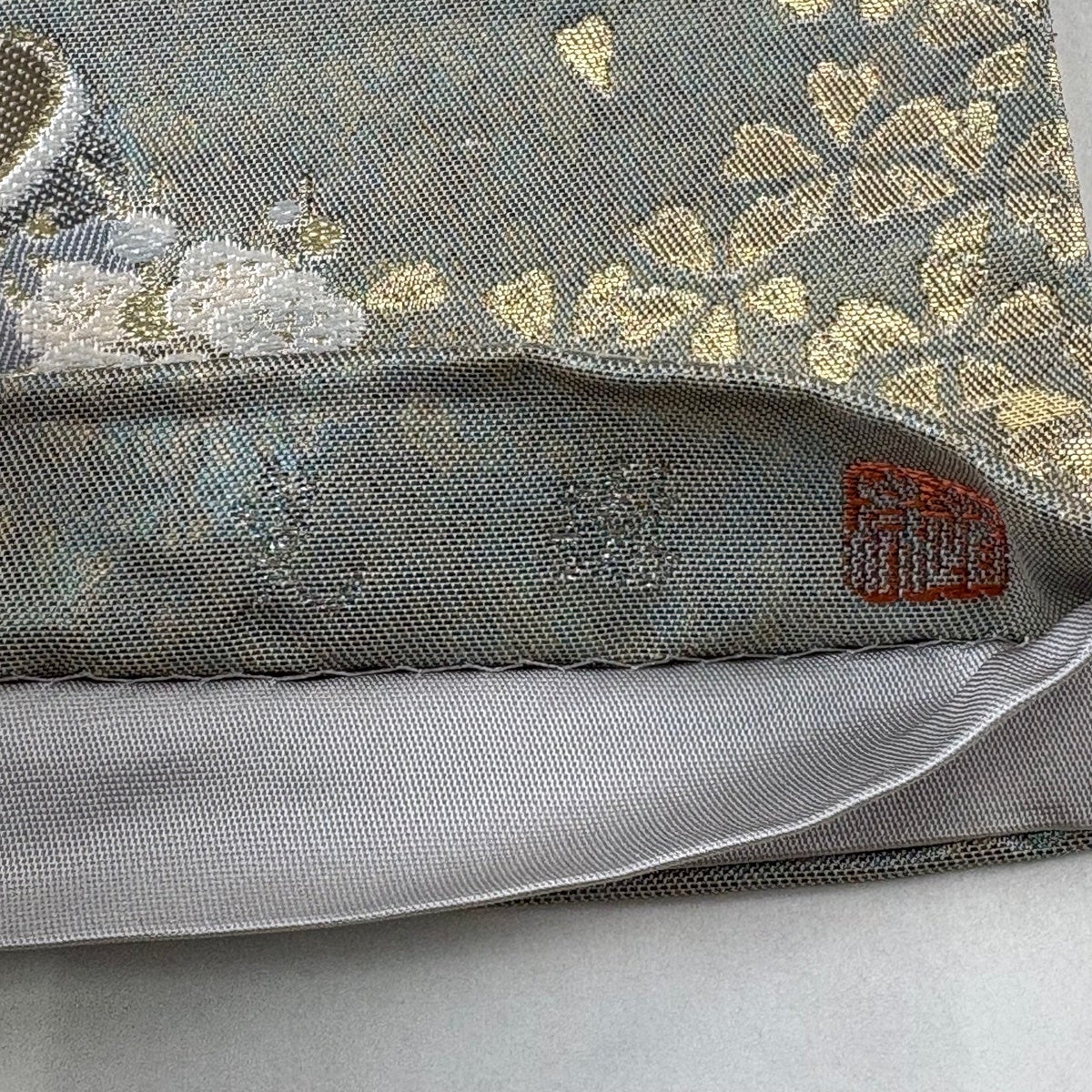 袋帯 秀品 落款あり 桜 かんざし 金銀糸 箔 銀色 お太鼓柄 正絹