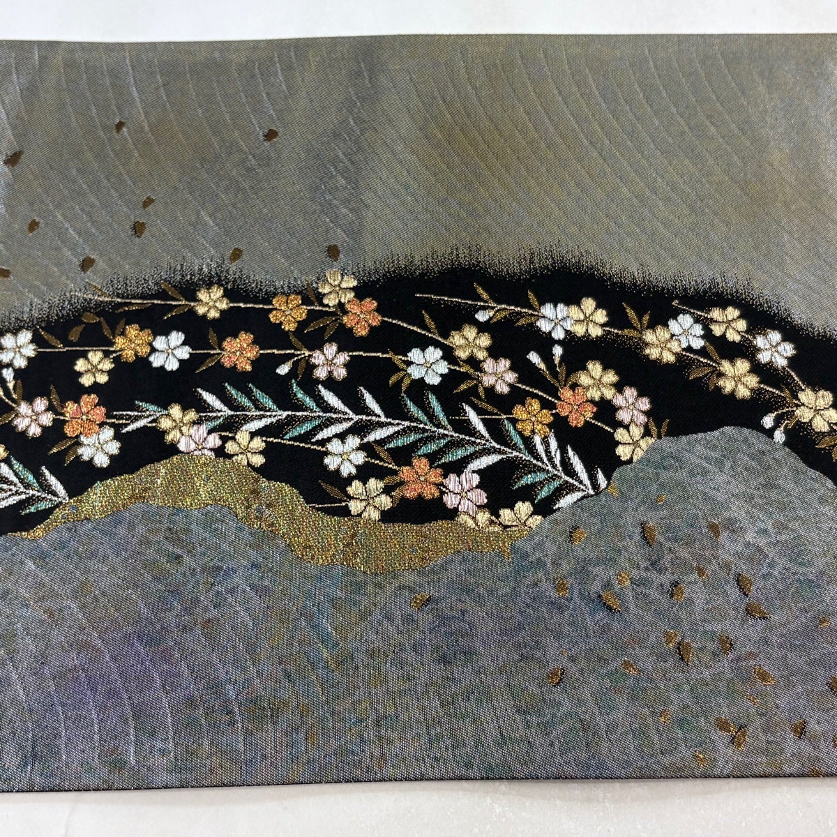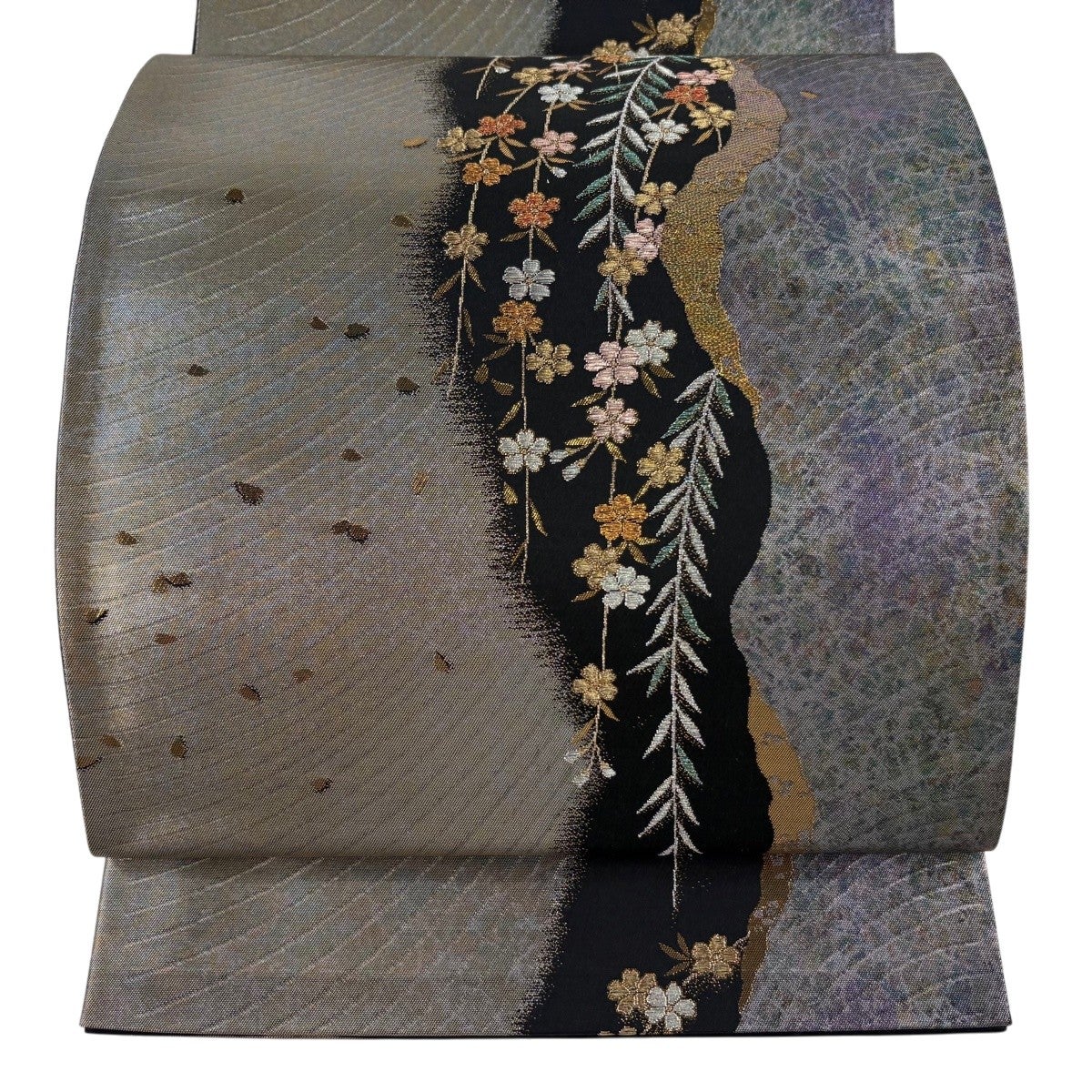 【美品】 袋帯 秀品 枝垂れ桜 花びら 金銀糸 箔 銀色 六通 正絹