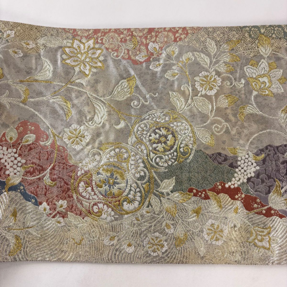 50%OFF 袋帯 名品 草花 霞 箔 銀色 六通 正絹 K50