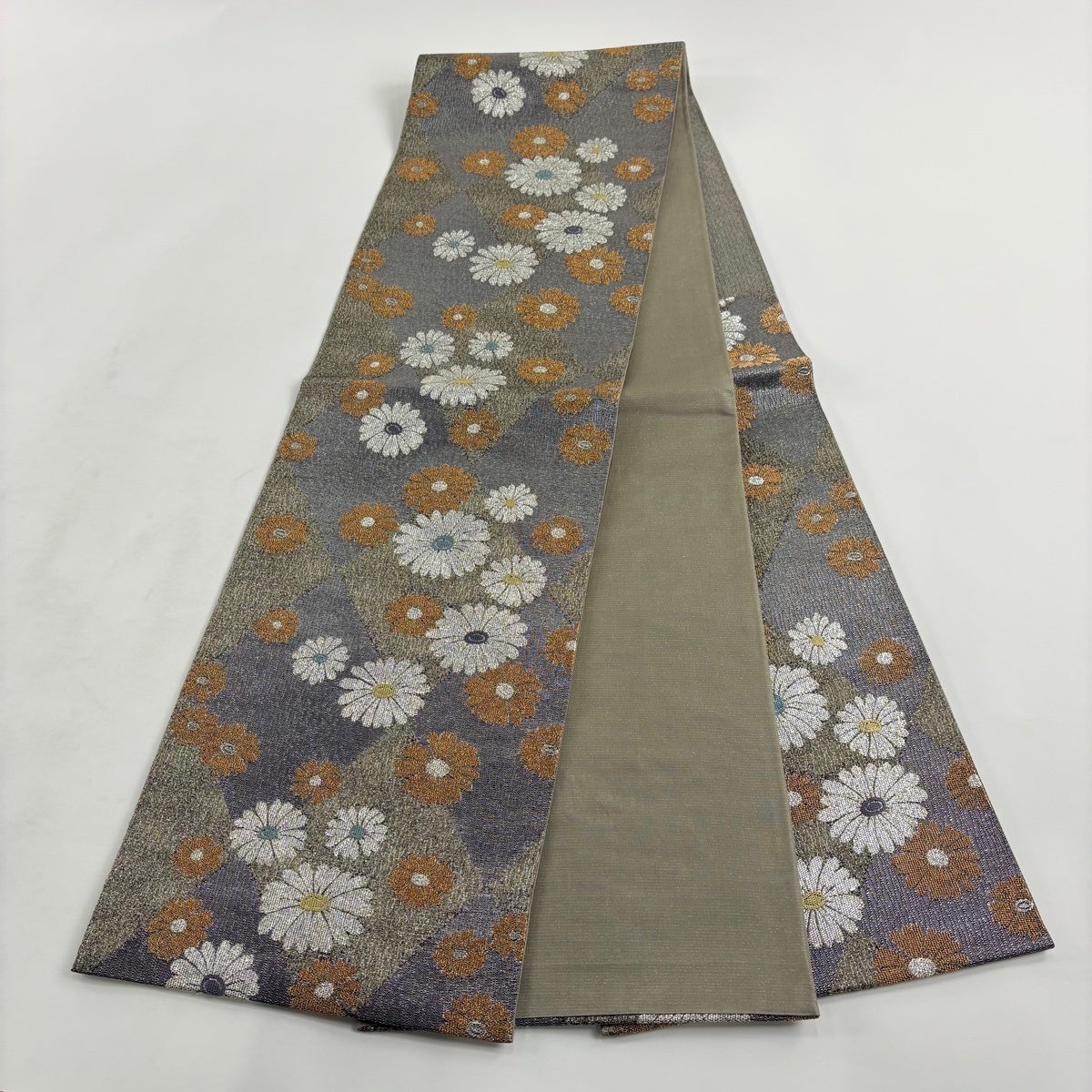 50%OFF 袋帯 秀品 菊 梅 銀糸 金彩 銀色 お太鼓柄 正絹 K50