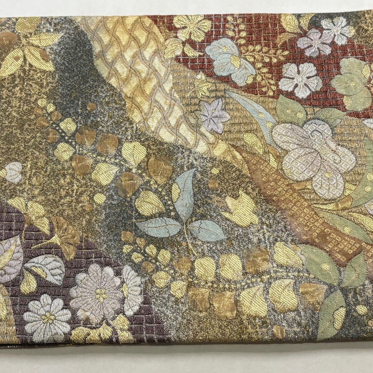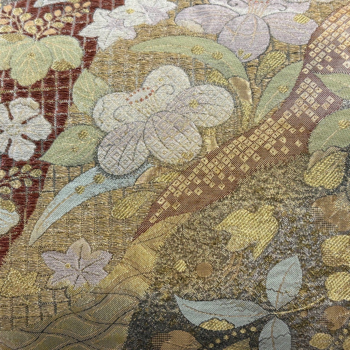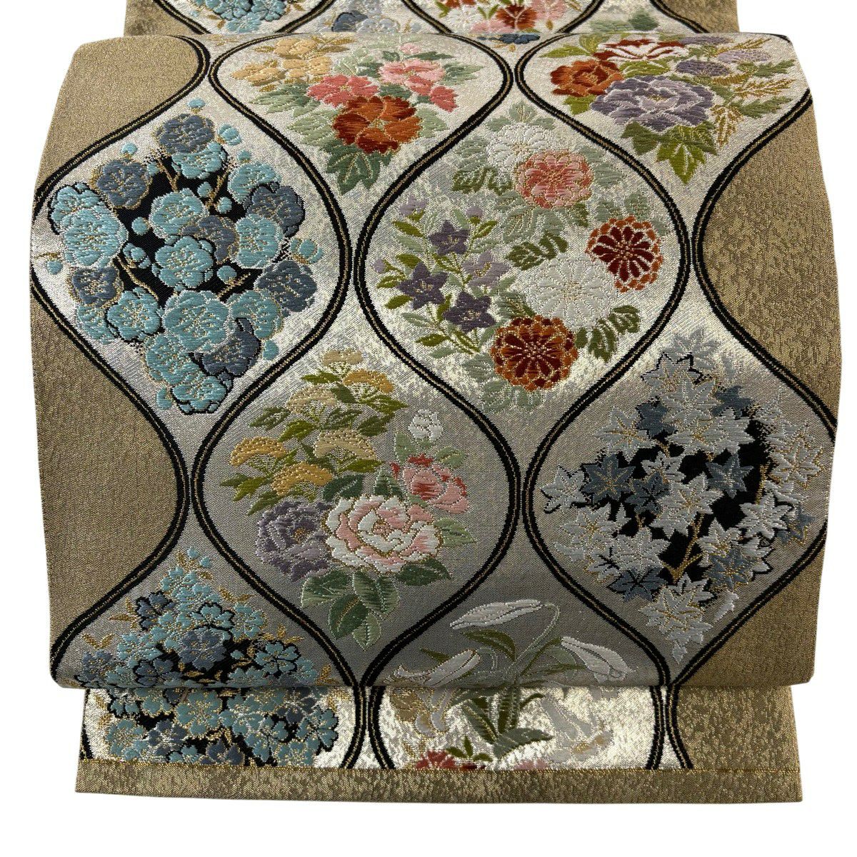 50%OFF 袋帯 秀品 扇面 草花 箔 金糸 銀色 六通 正絹 K50