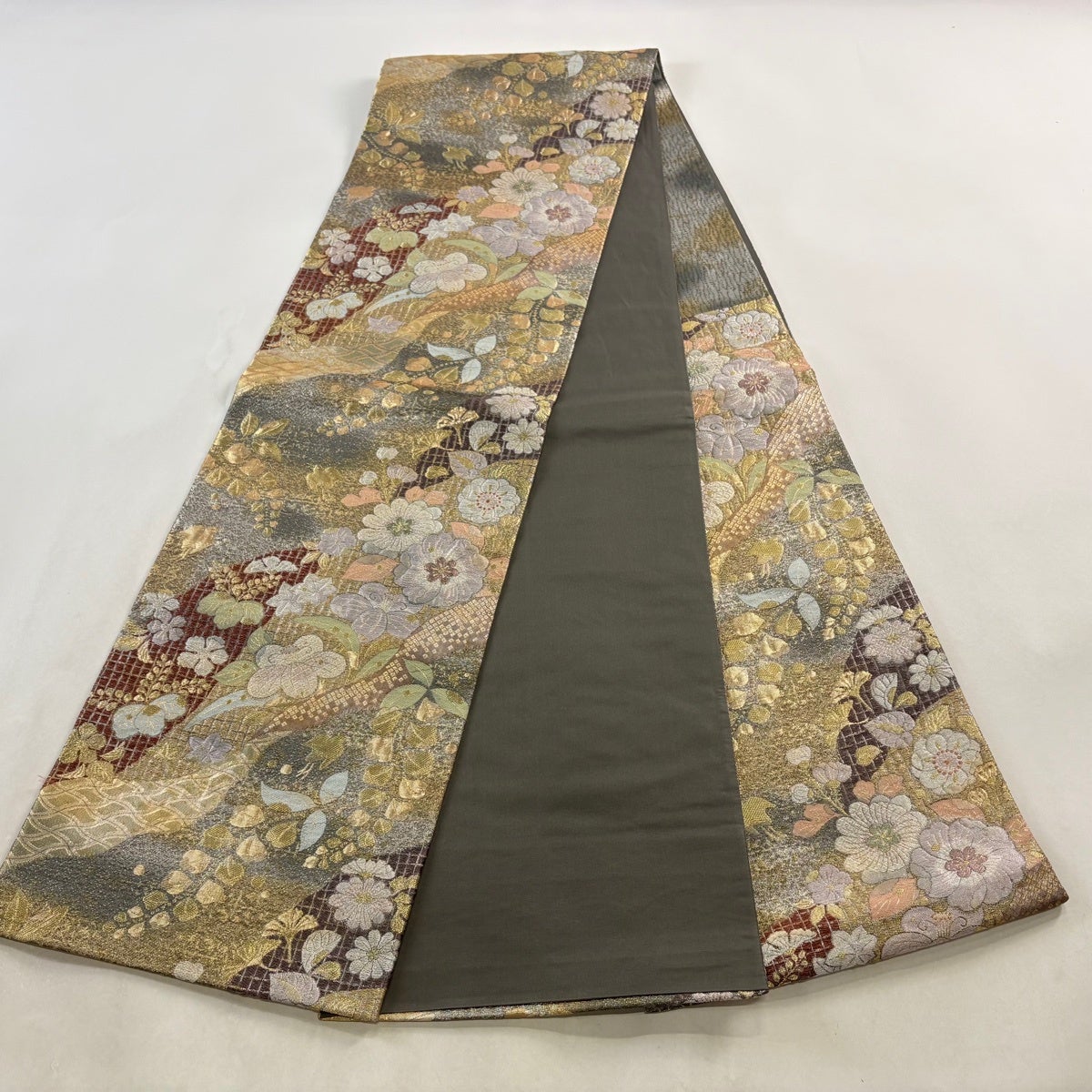 50%OFF 袋帯 秀品 草花 流水 金糸 箔 銀色 六通 正絹 K50
