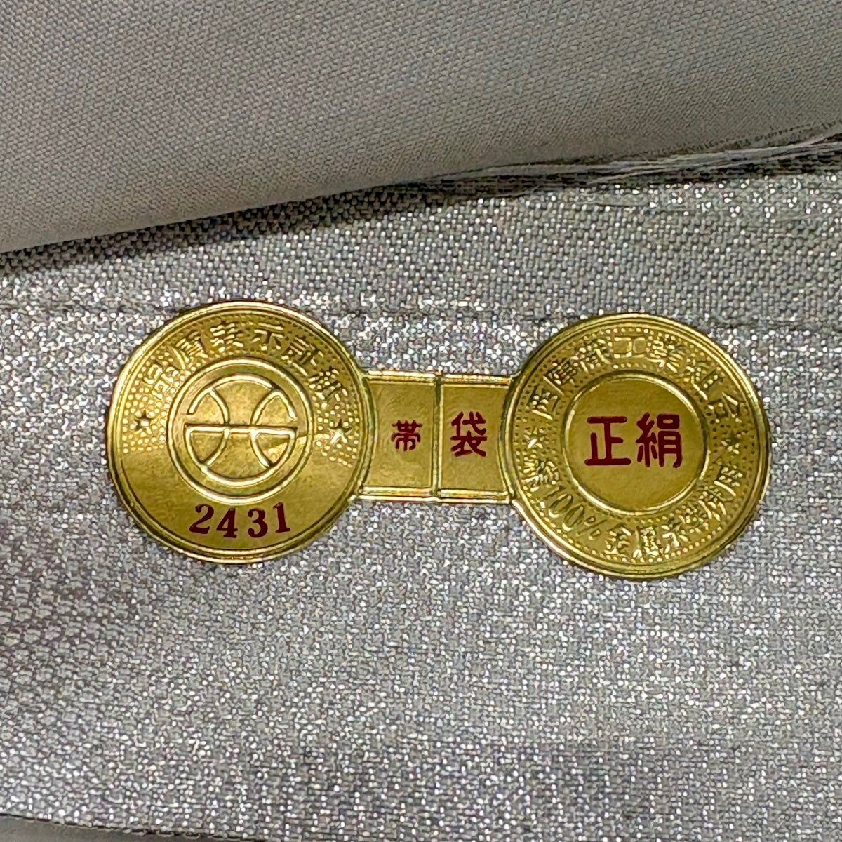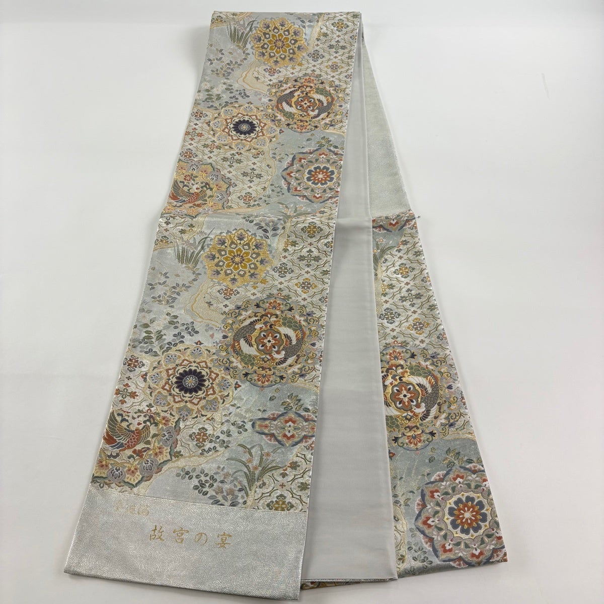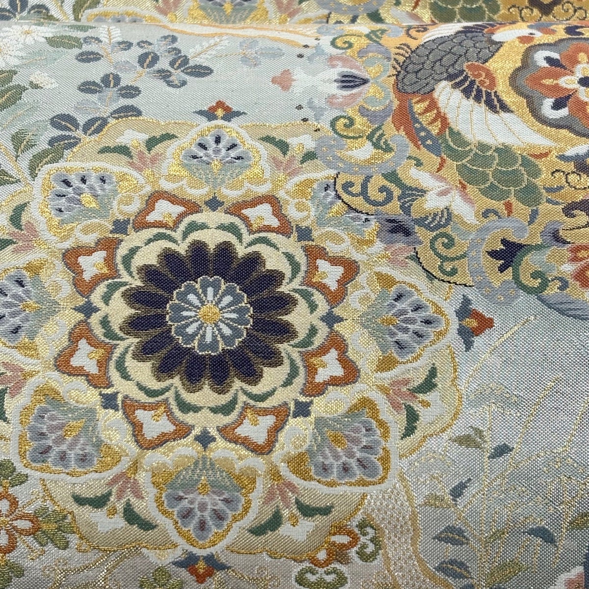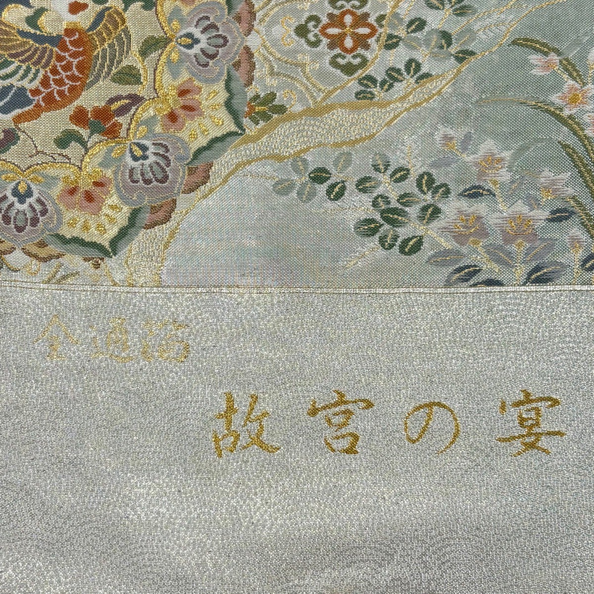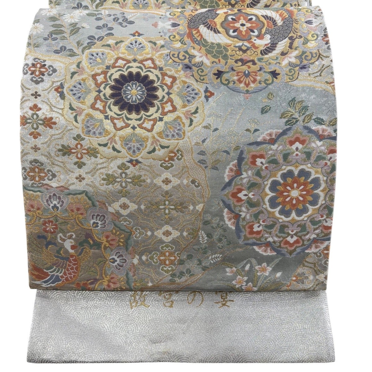 【美品】 袋帯 秀品 証紙あり 華文 向かい鳥 金糸 箔 銀色 六通 正絹