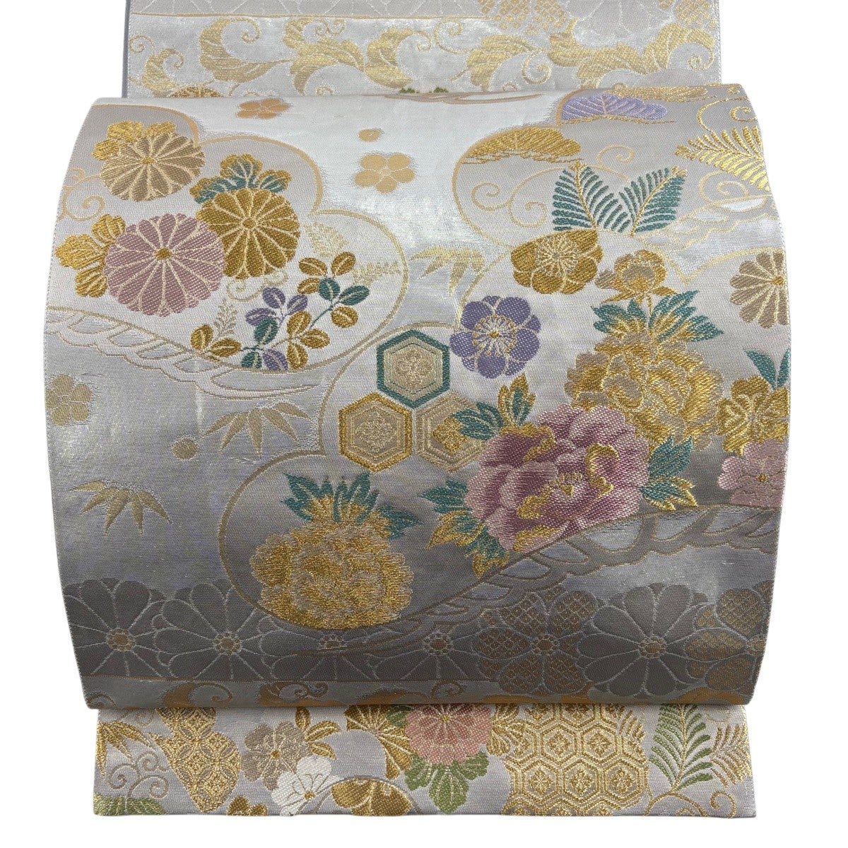 50%OFF 袋帯 秀品 菊 松 金彩 螺鈿 銀色 お太鼓柄 正絹 K50