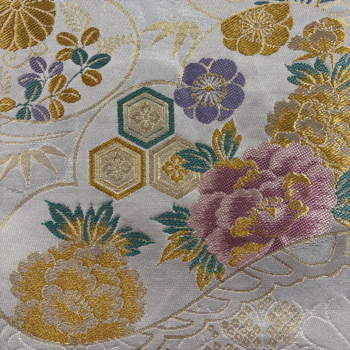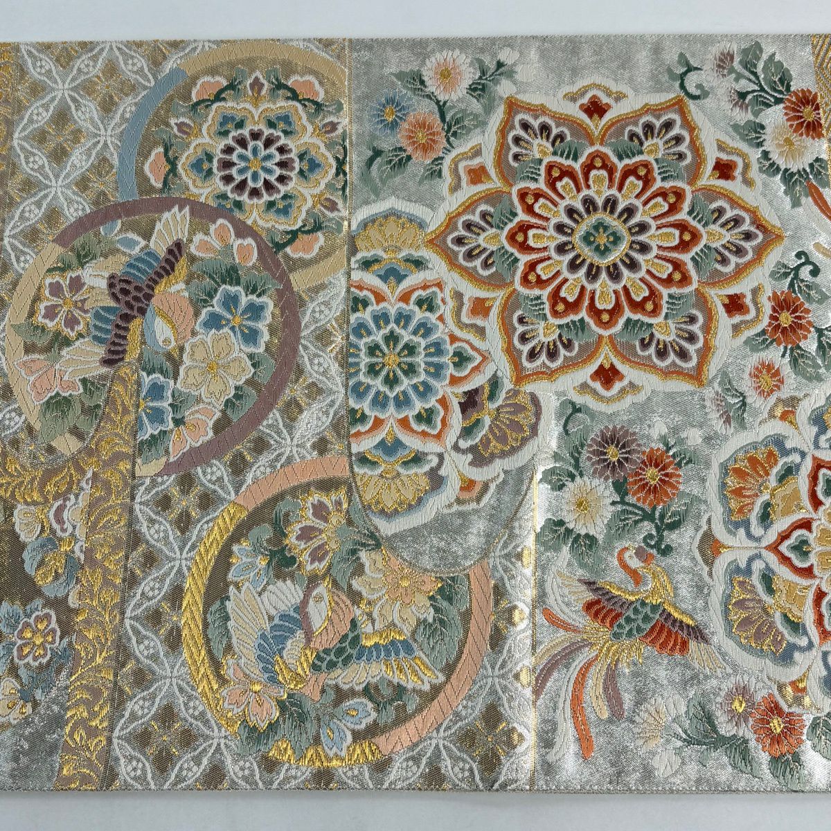 50%OFF 袋帯 秀品 菱 花鳥 刺繍 金糸 銀色 六通 正絹 K50