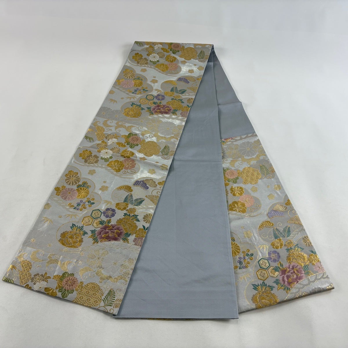 50%OFF 袋帯 名品 花菱 立涌 金銀糸 銀色 お太鼓柄 正絹 K50