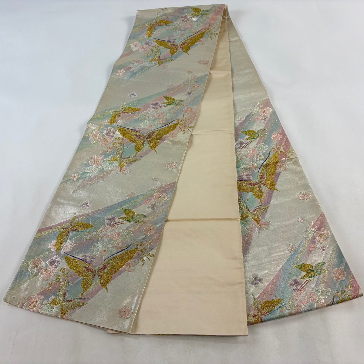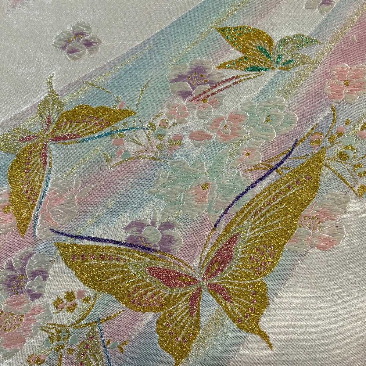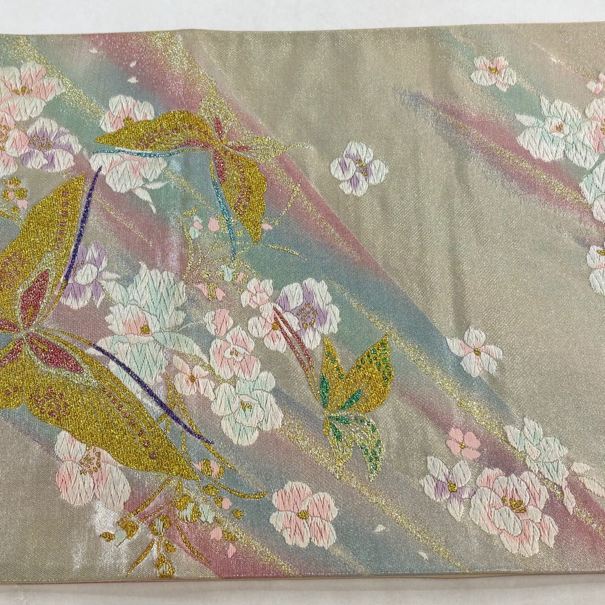 【美品】 袋帯 秀品 振袖向き 花 蝶 金糸 箔 銀色 六通 正絹