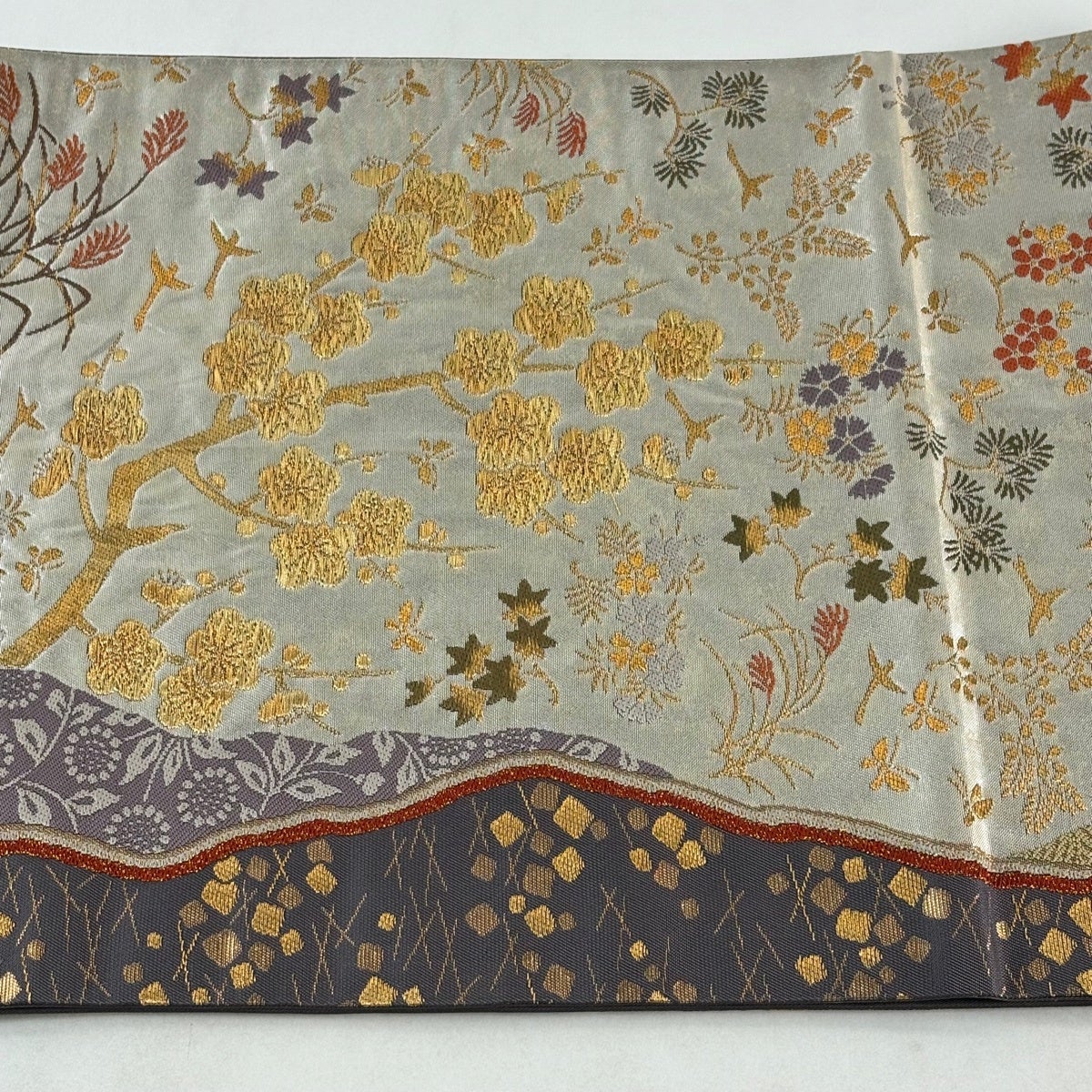 【在庫一掃】 【美品】 袋帯 秀品 草花 色紙 螺鈿箔 箔 銀色 お太鼓柄 正絹