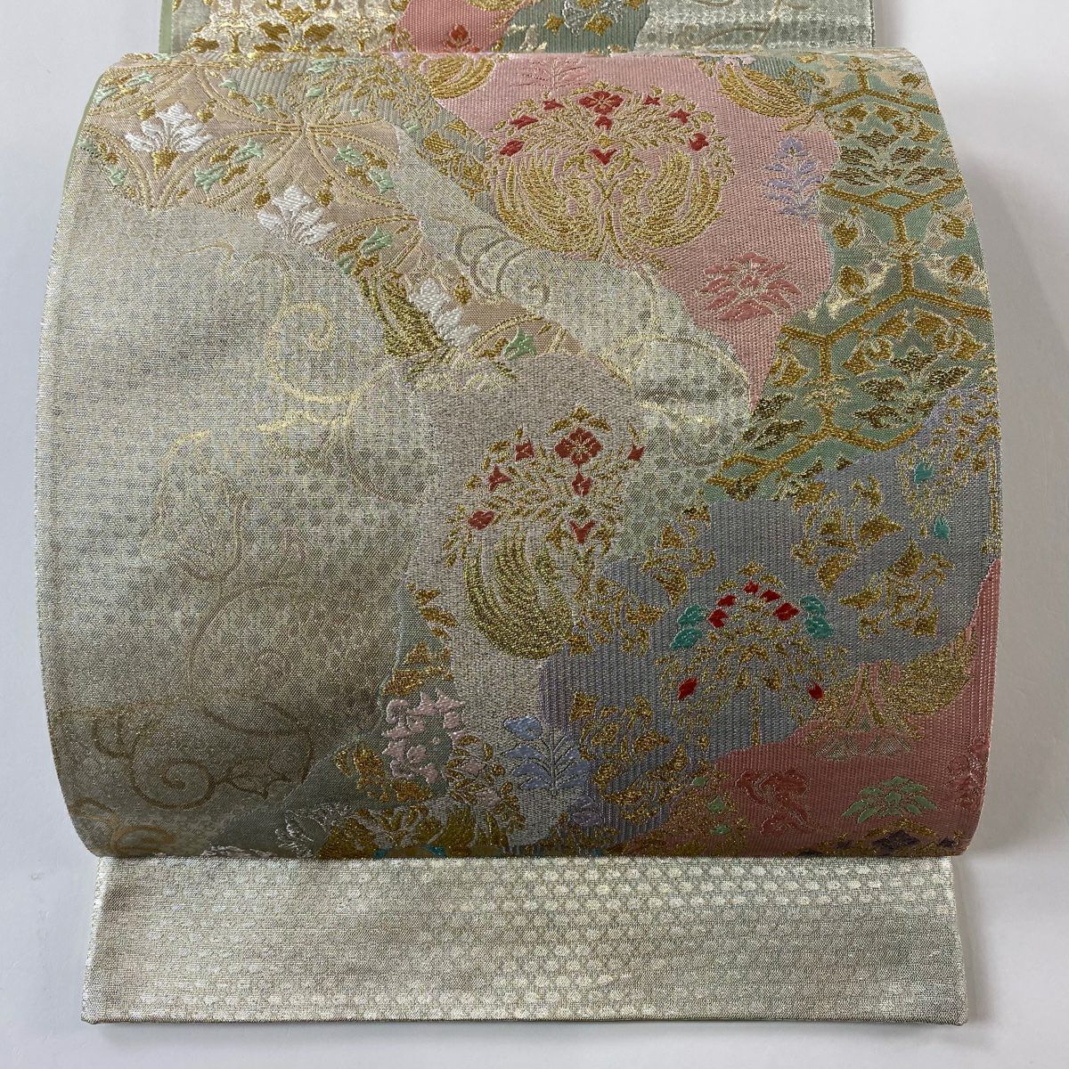 【在庫一掃】 袋帯 秀品 関西仕立て 花 破れ色紙 金銀糸 刺繍 銀色 六通 正絹