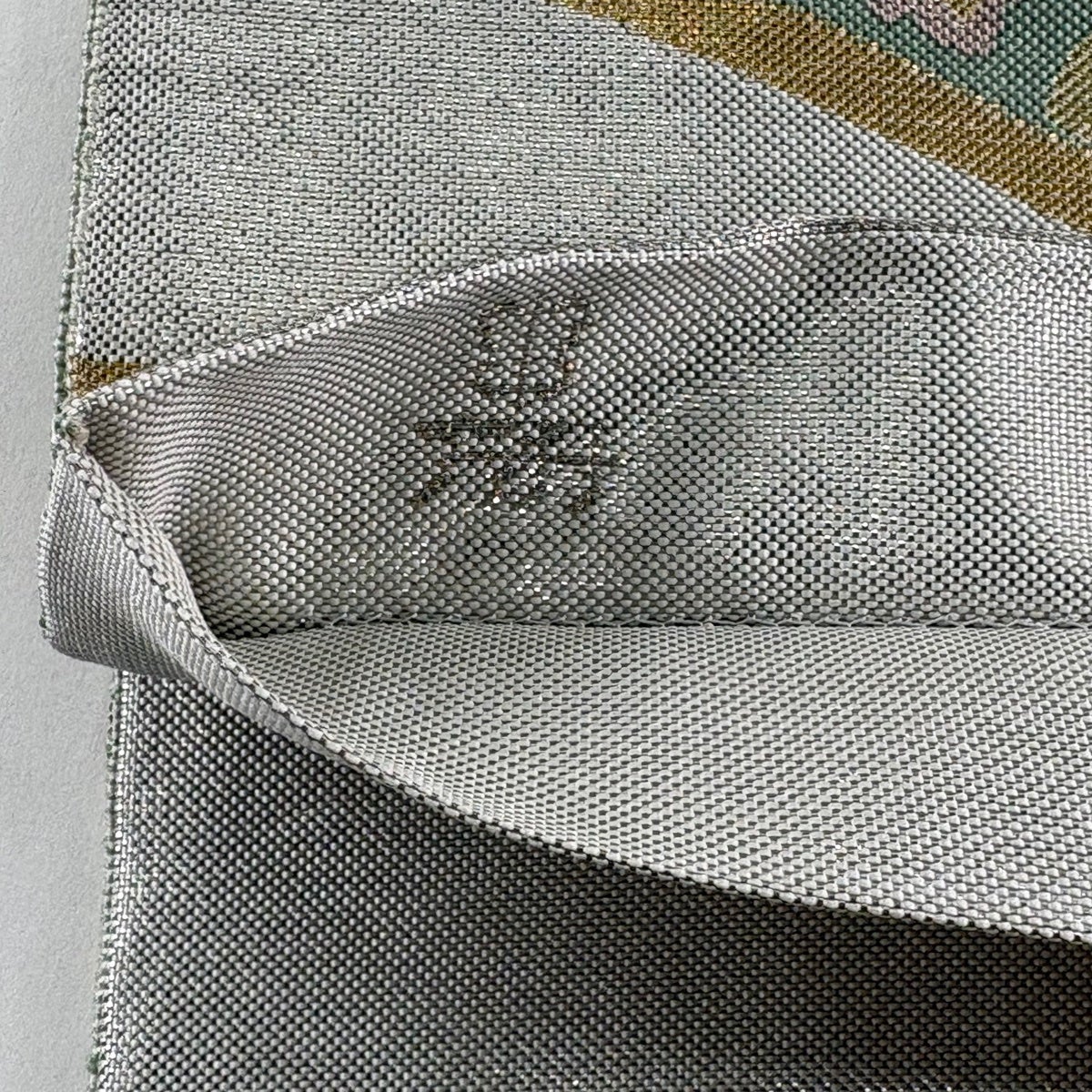 【美品】 袋帯 逸品 長嶋成織物 落款あり 瀞銀錦 由水十久 童 草花 箔 銀色 お太鼓柄 正絹