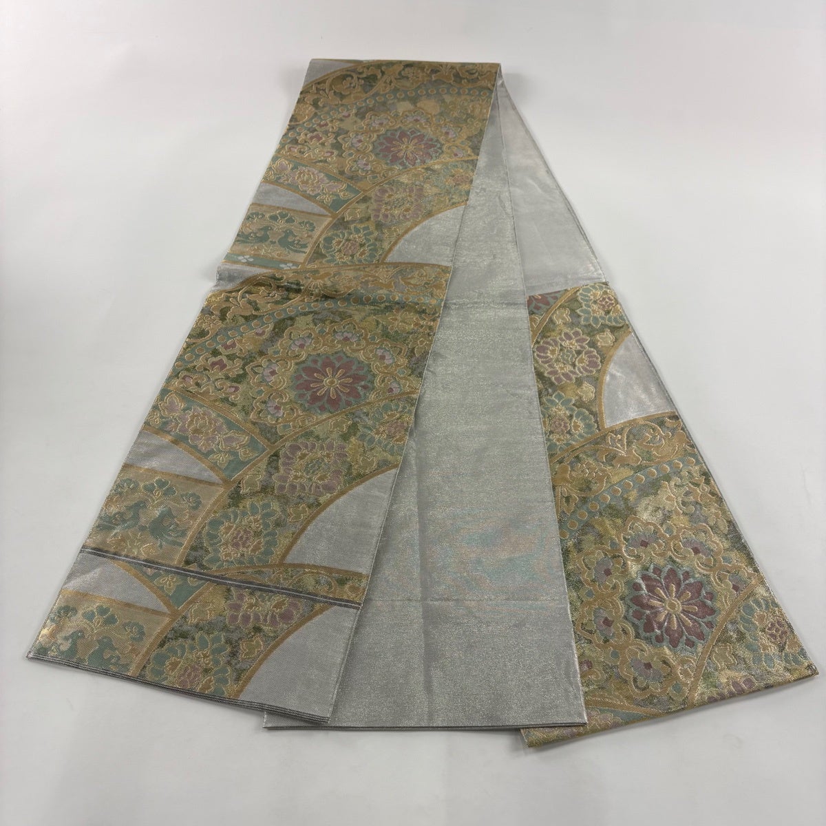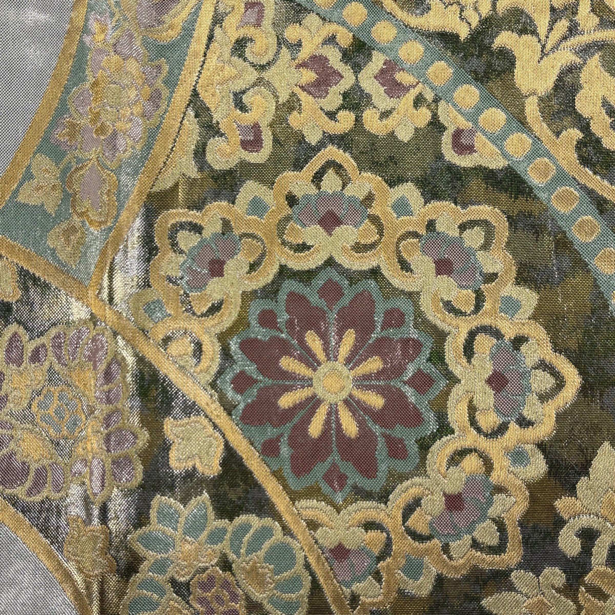【美品】 袋帯 逸品 桝屋高尾 落款あり 名物裂文桧垣 ねん金綴錦 金銀糸 銀色 六通 正絹