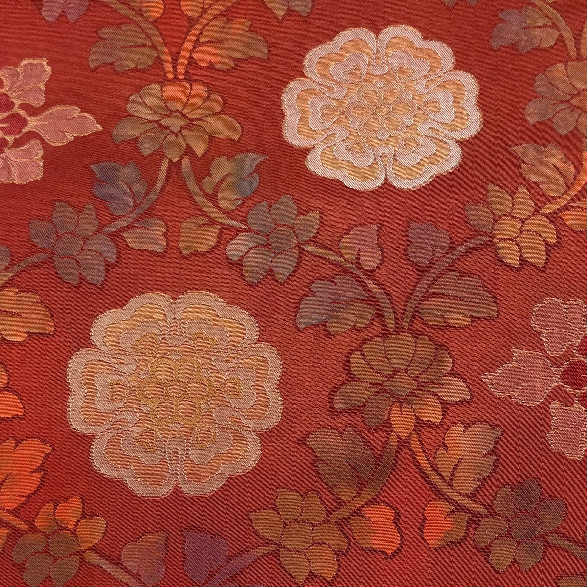 開き名古屋帯 秀品 落款あり 関西仕立て 紬地 花器 草花 えんじ色 正絹