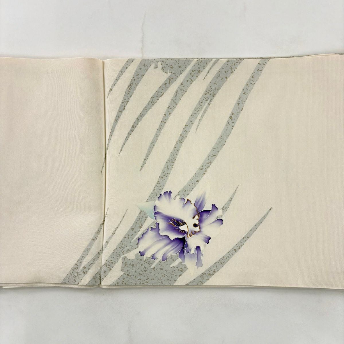 50%OFF 開き名古屋帯 名品 落款あり 蘭 シルエット 金彩 クリーム 正絹 K50