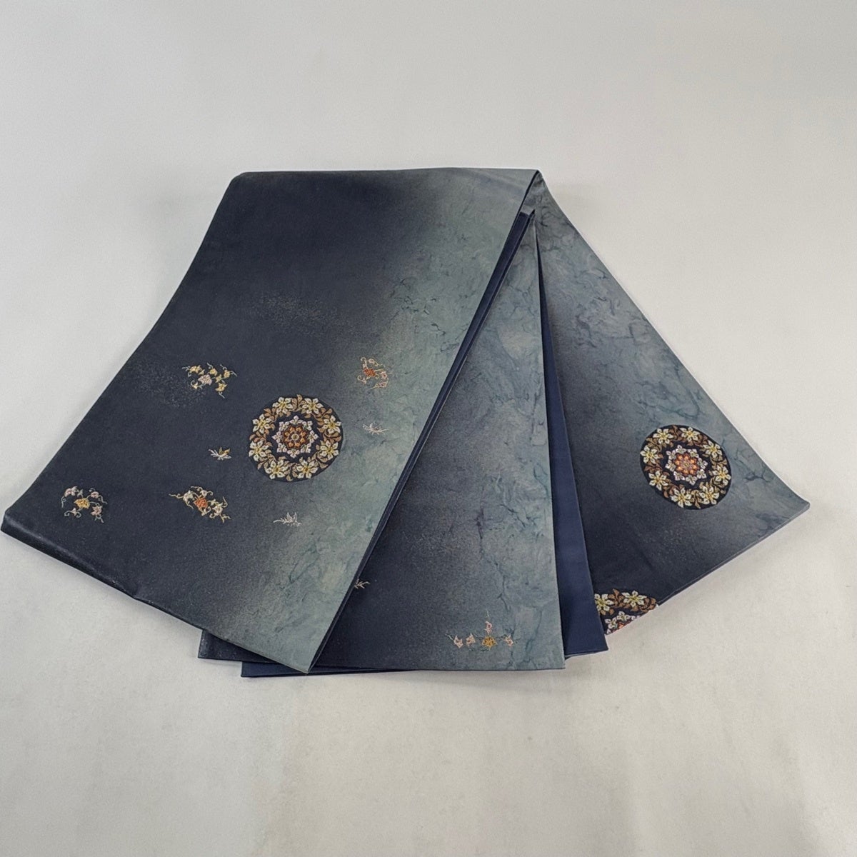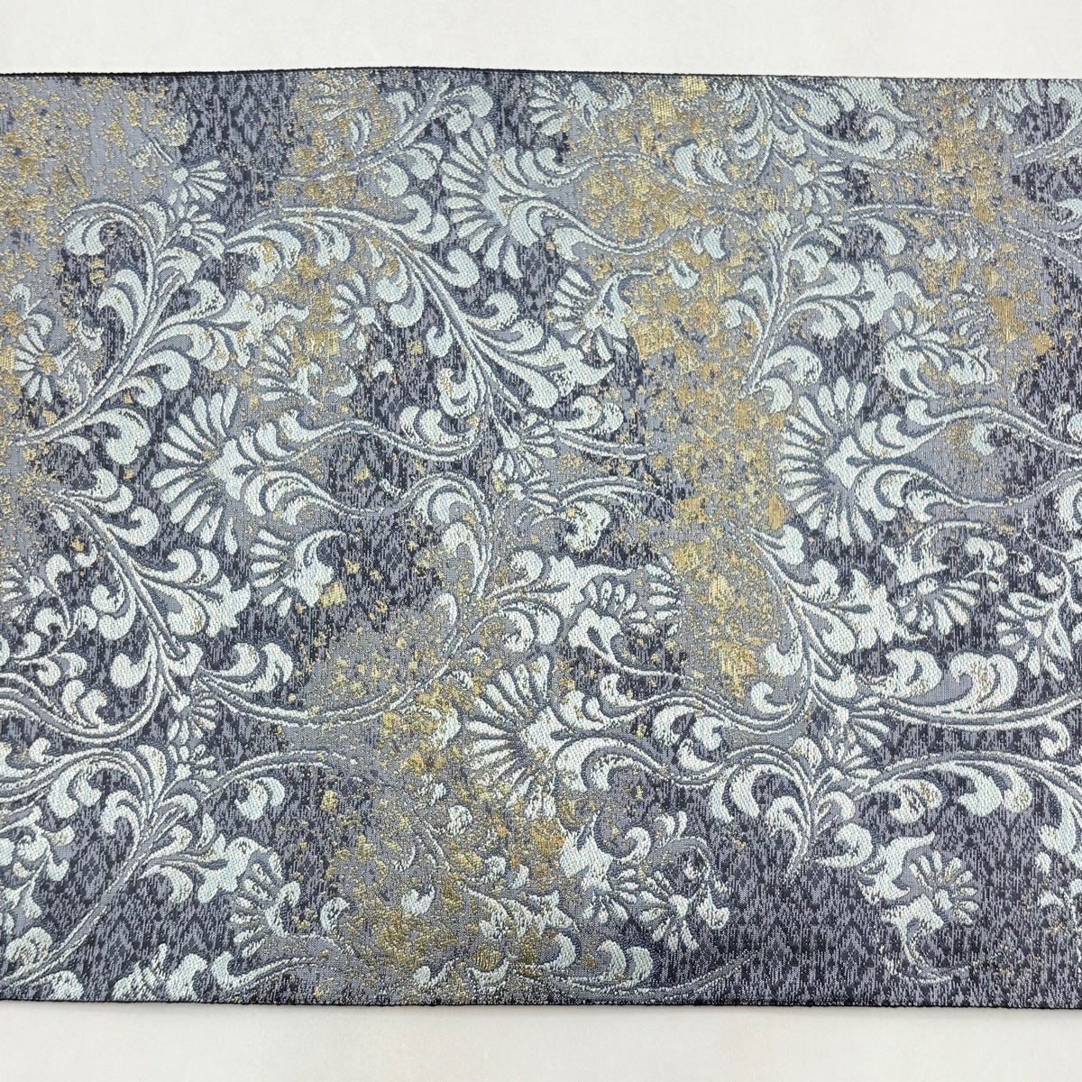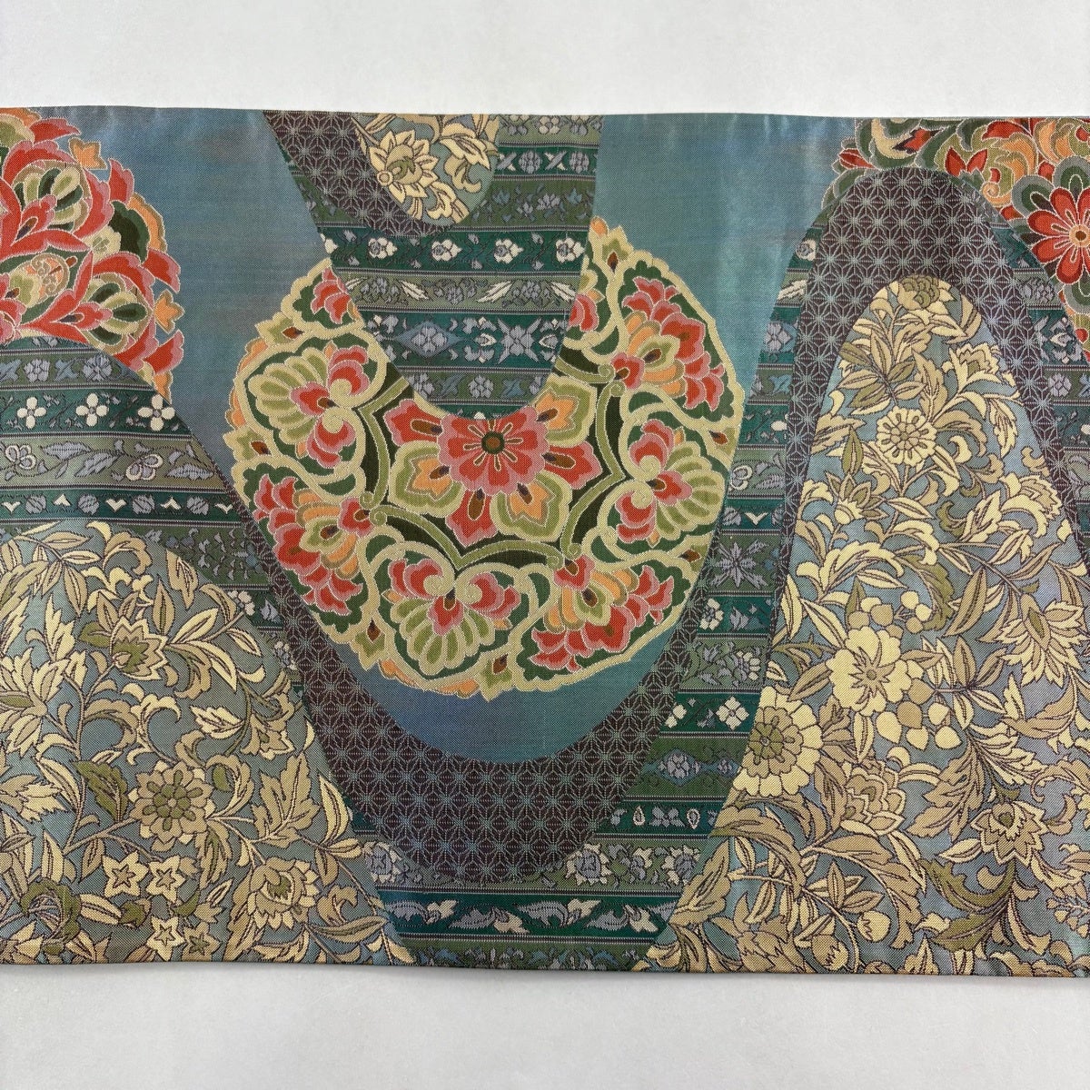 名古屋帯 秀品 華文 花唐草 金彩 刺繍 青灰色 正絹