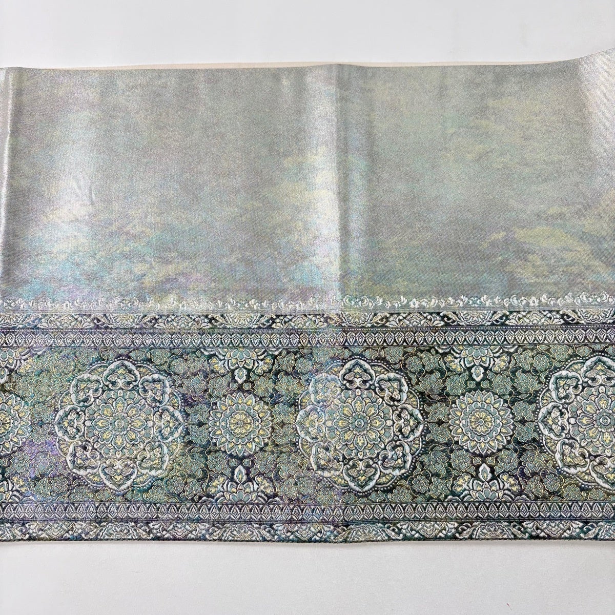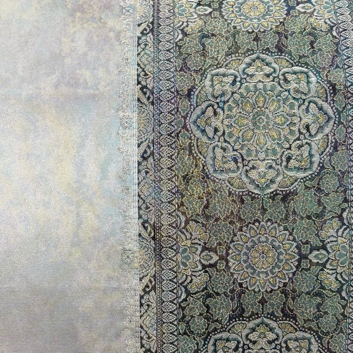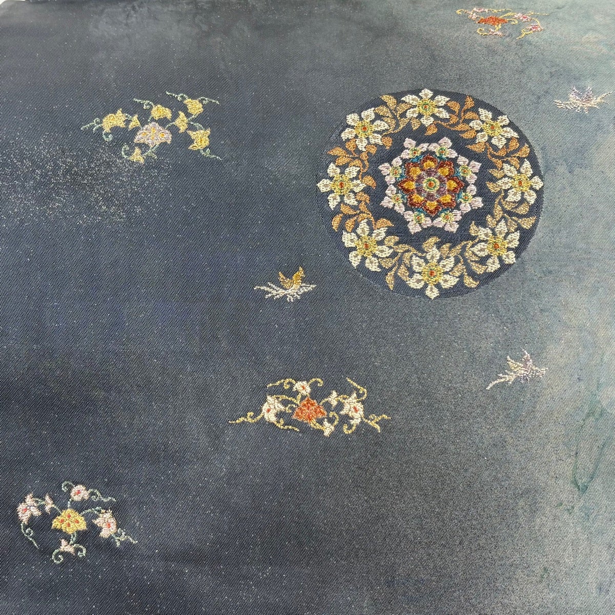 名古屋帯 秀品 華文 花唐草 金彩 刺繍 青灰色 正絹