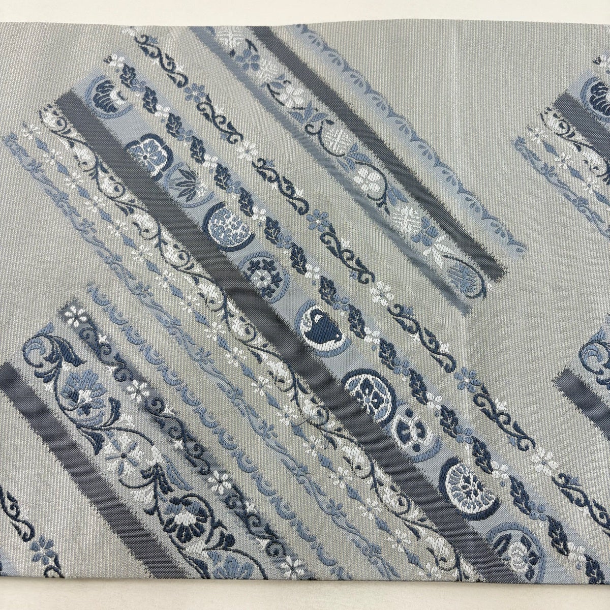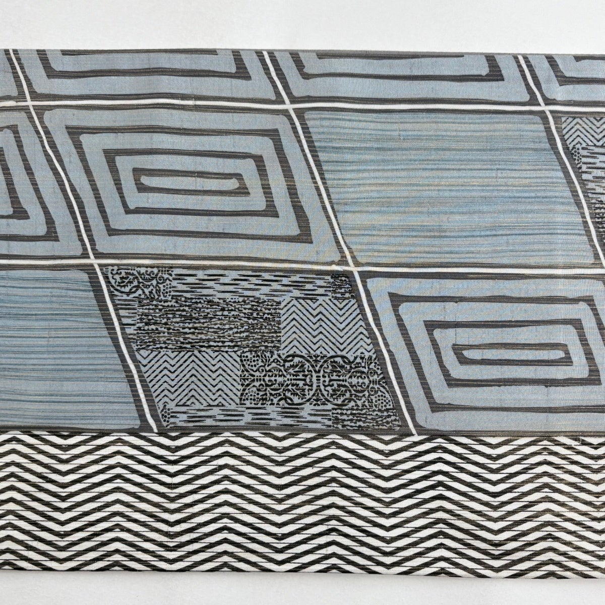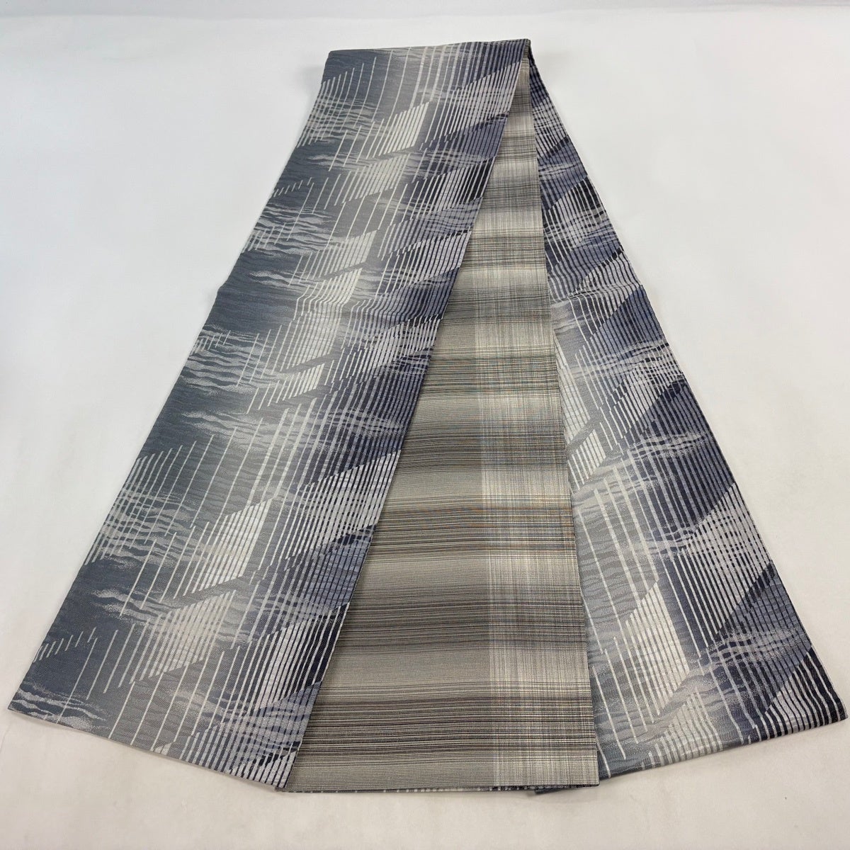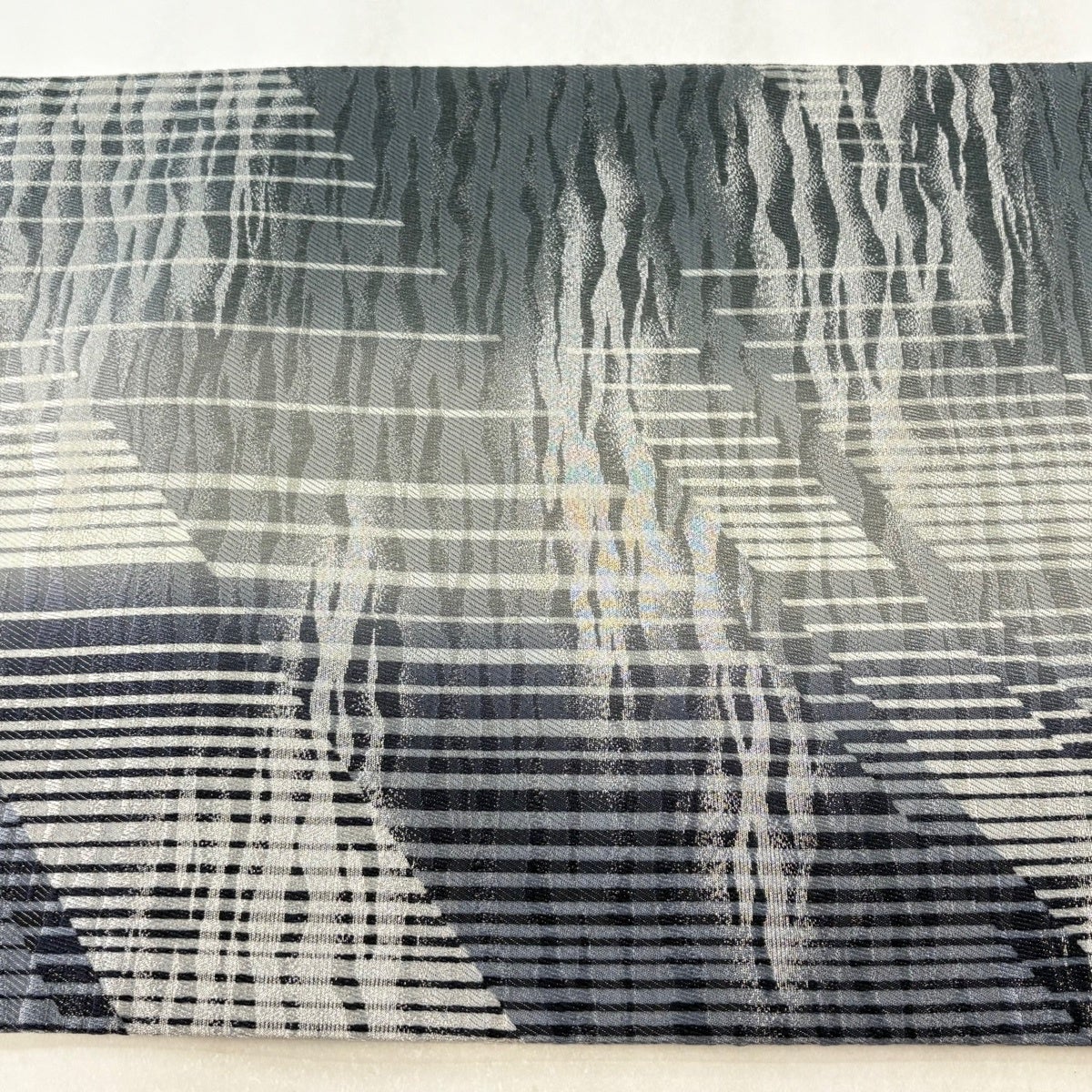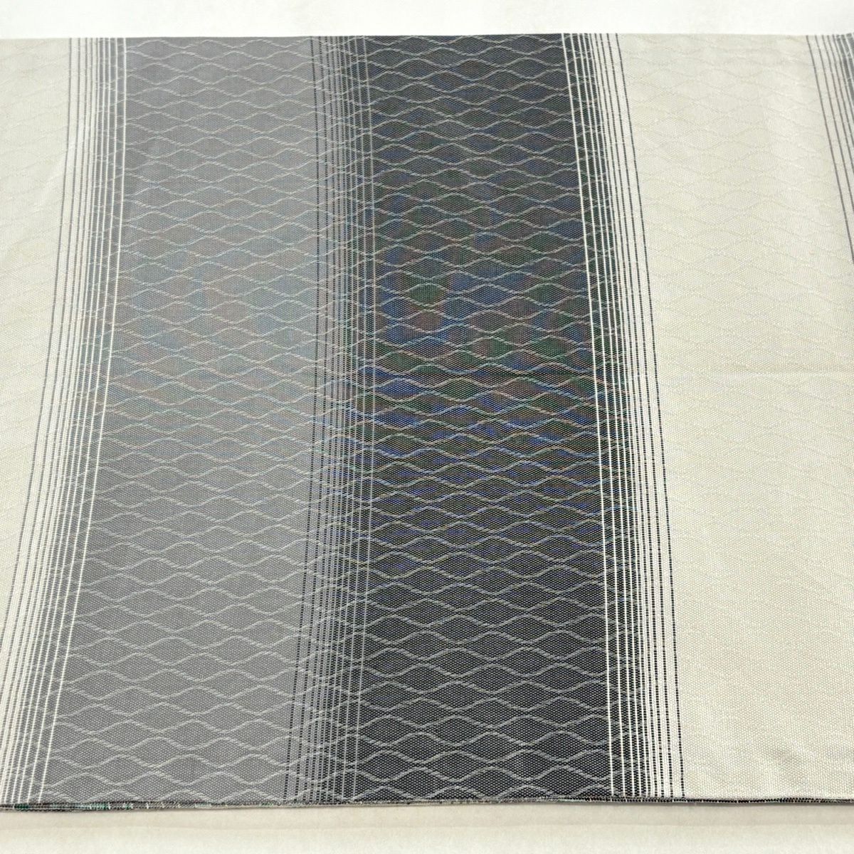 【美品】 袋帯 名品 縞 幾何学模様 青灰色 全通 正絹