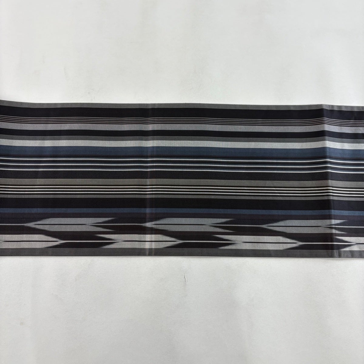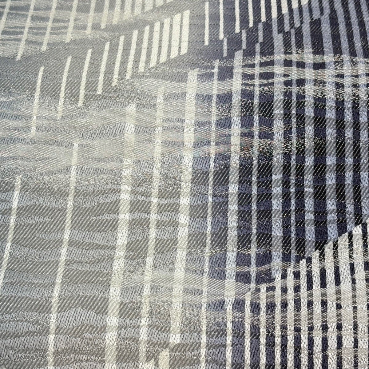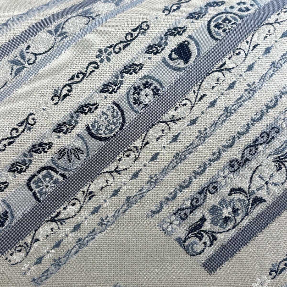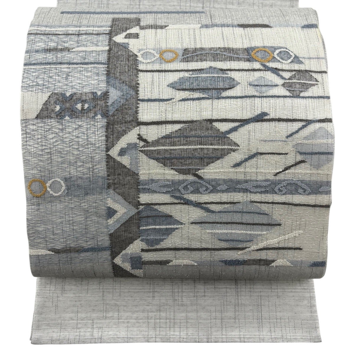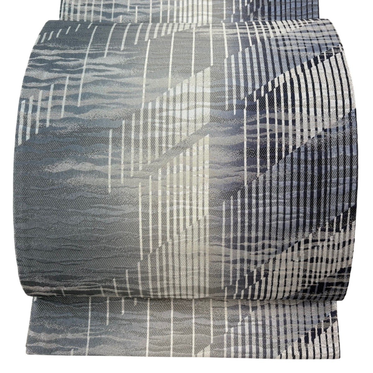 【美品】 袋帯 名品 縞 幾何学模様 青灰色 全通 正絹