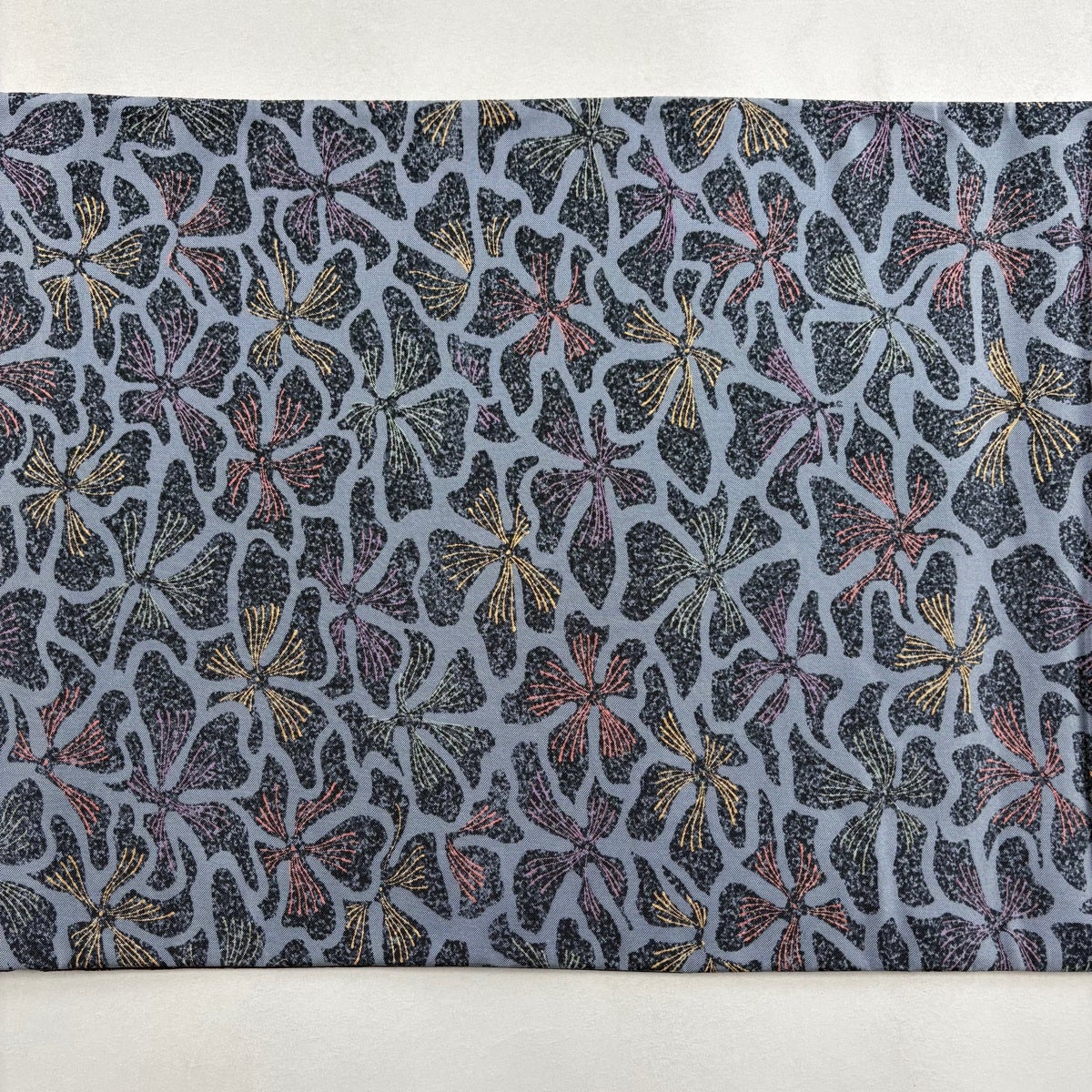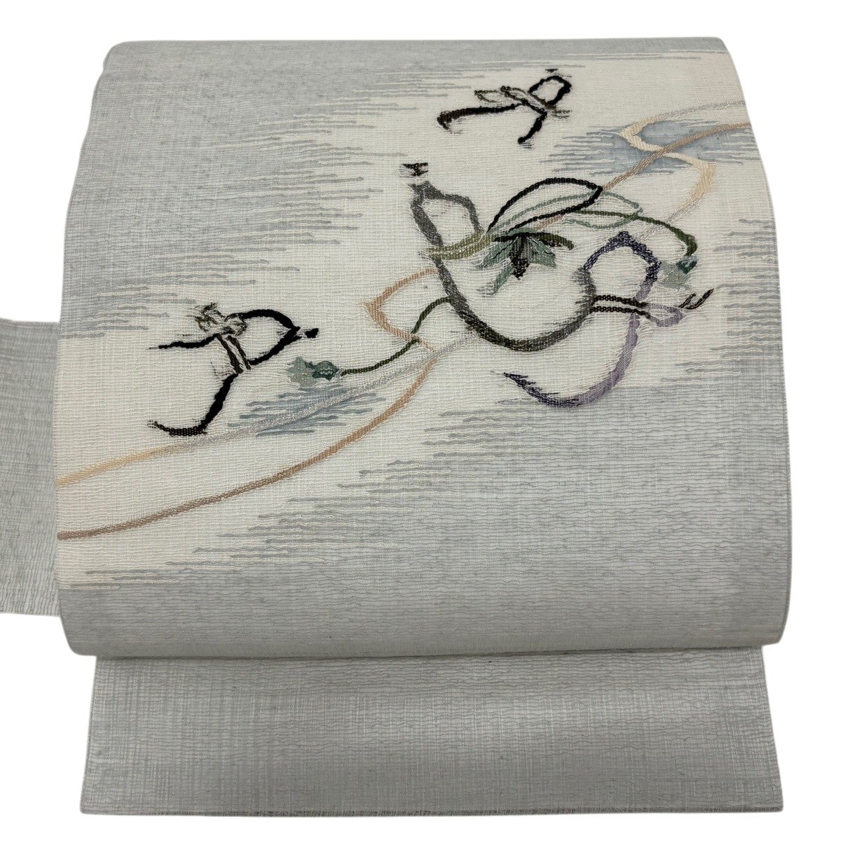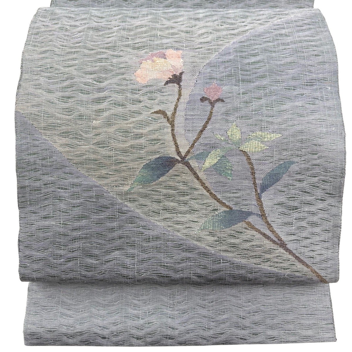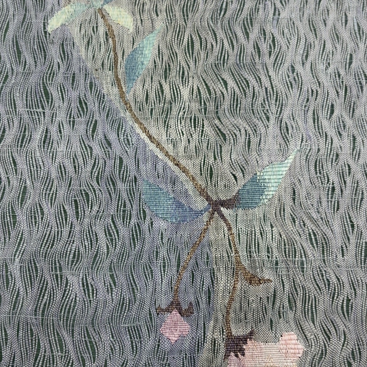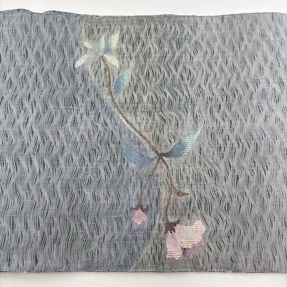 袋帯 秀品 紬地 草花 花唐草 青灰色 六通 正絹
