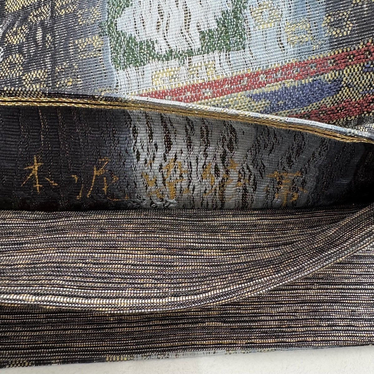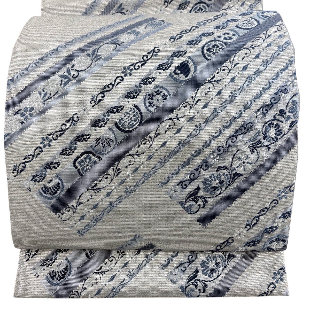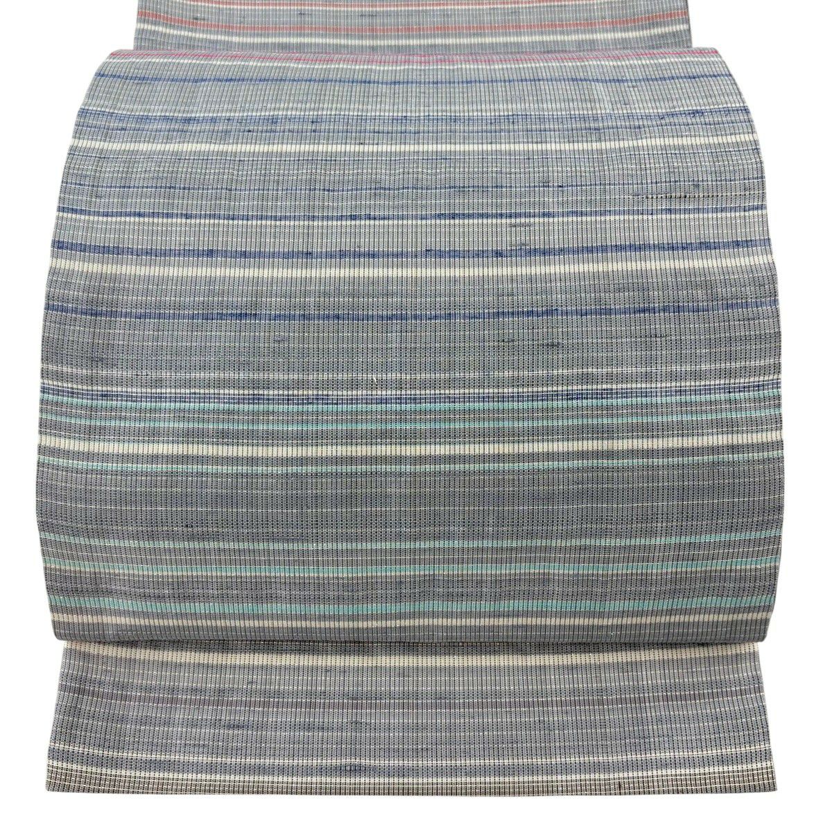 袋帯 秀品 落款あり 縞 銀通し 青灰色 六通 正絹