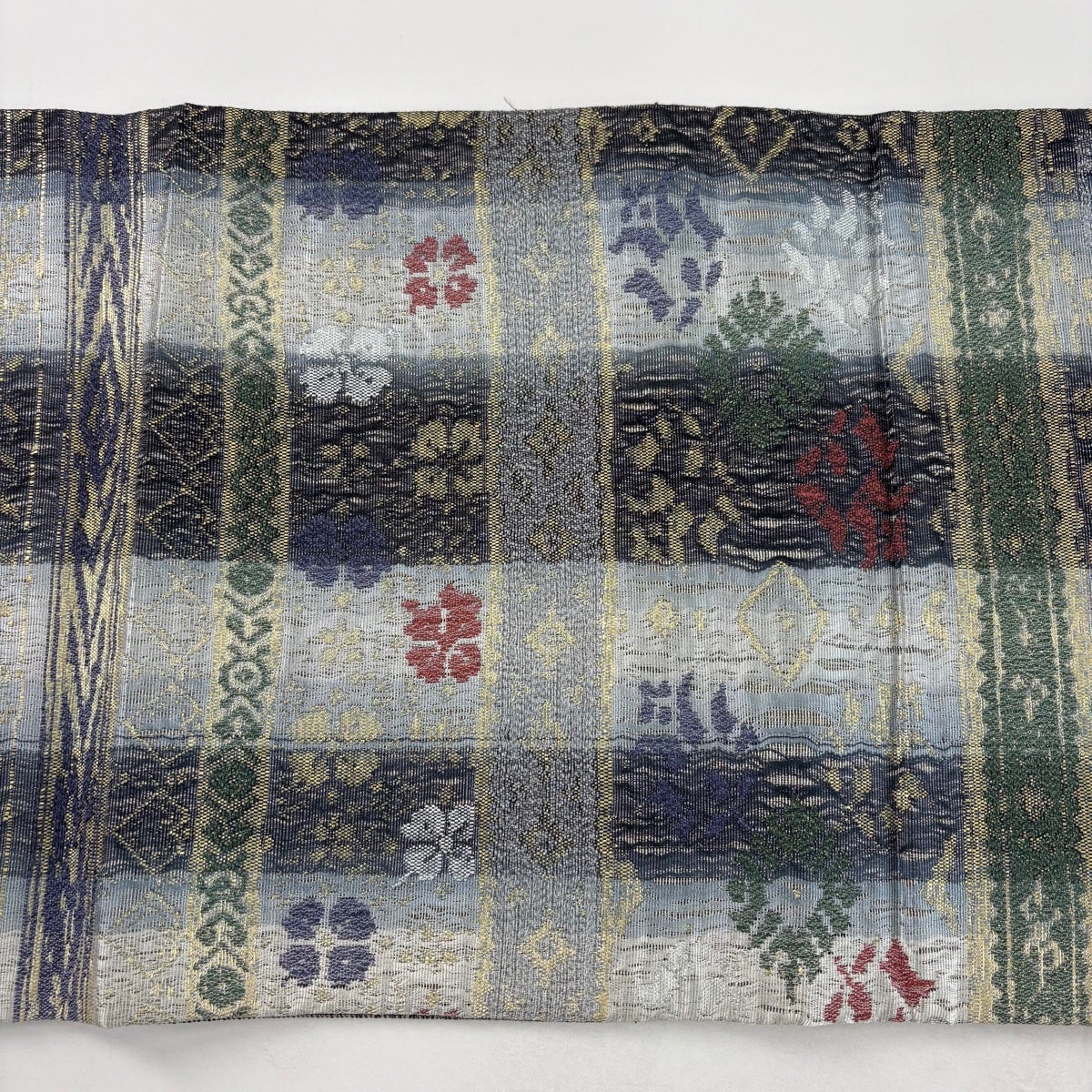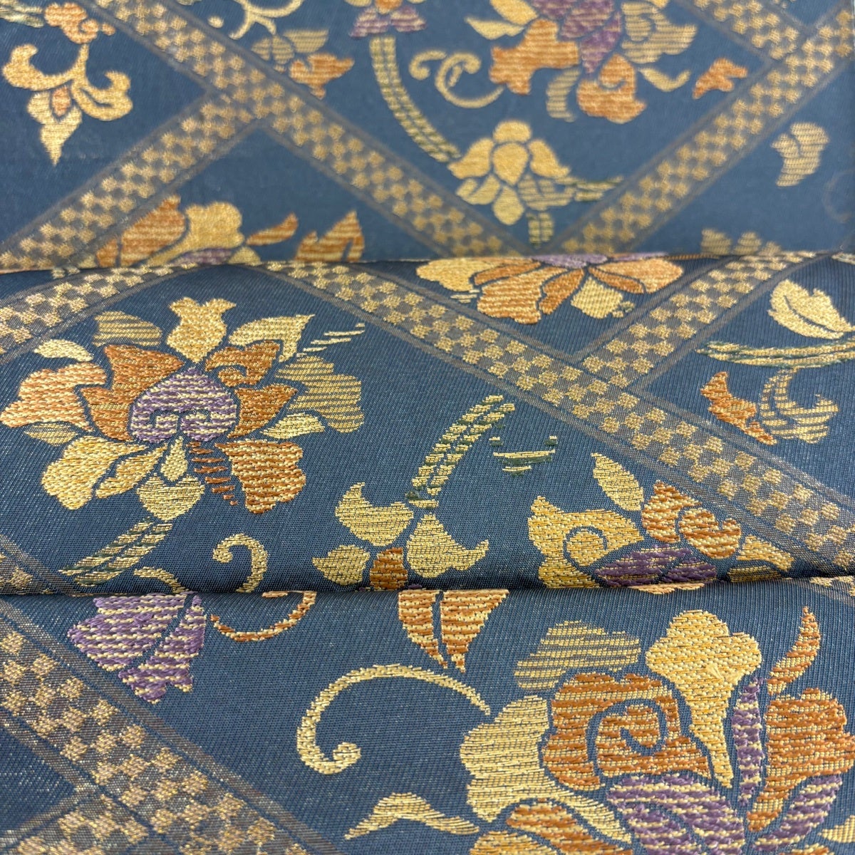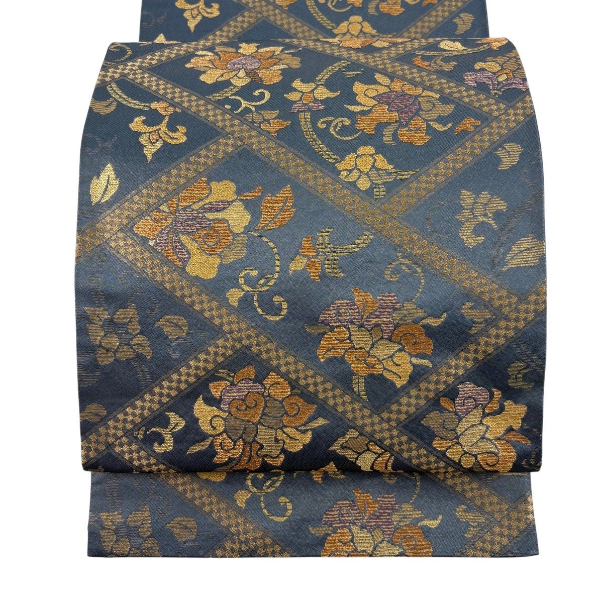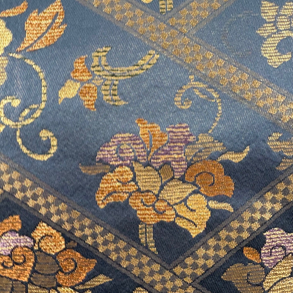袋帯 秀品 草花 華文 金糸 箔 青灰色 六通 正絹
