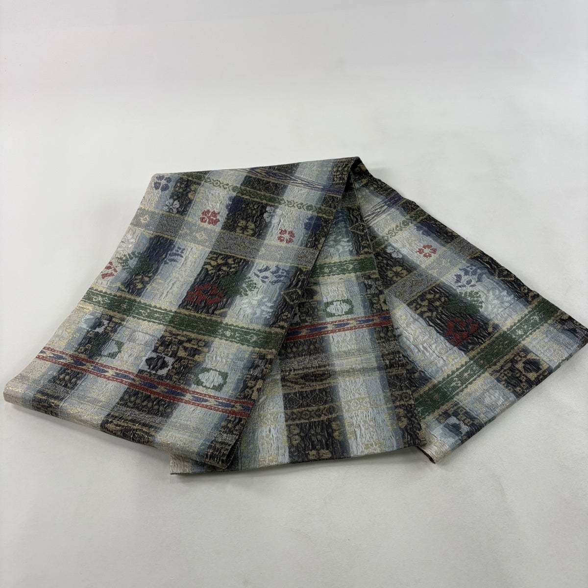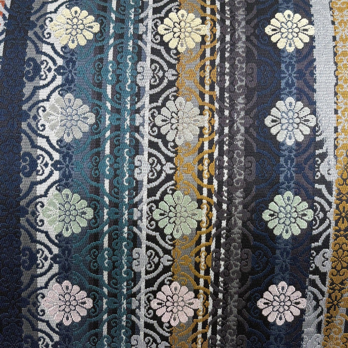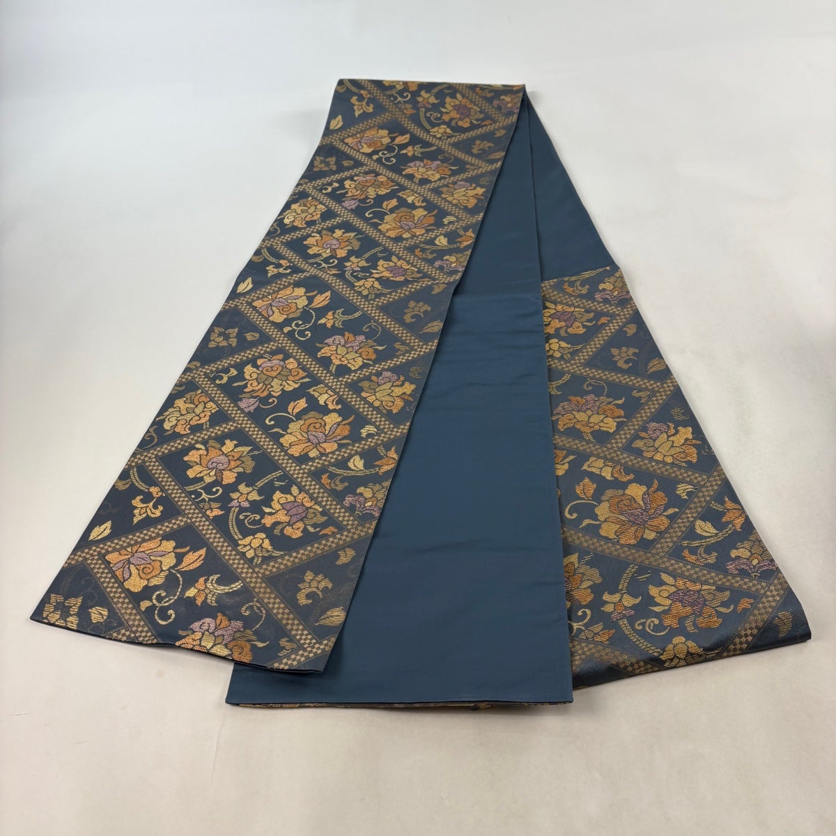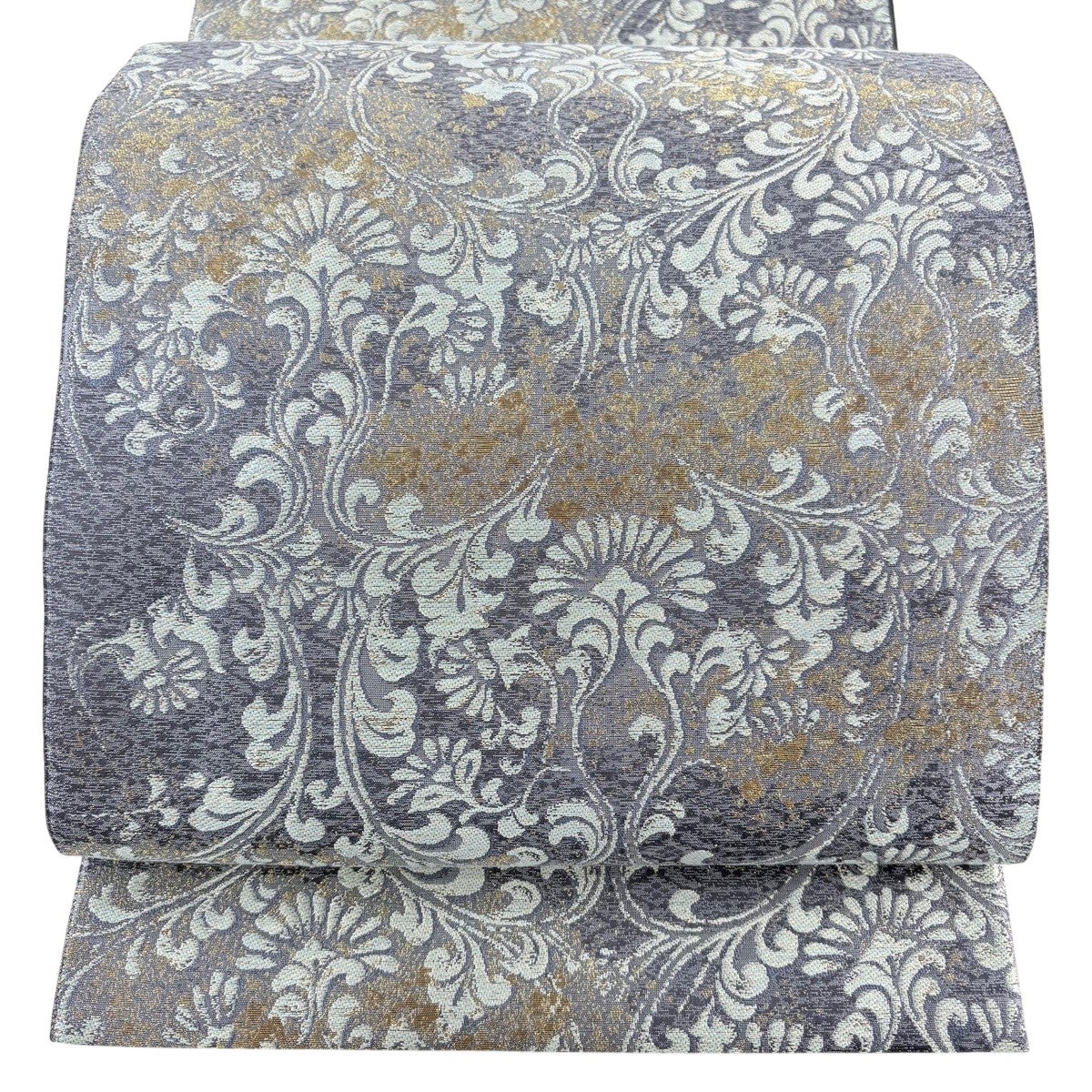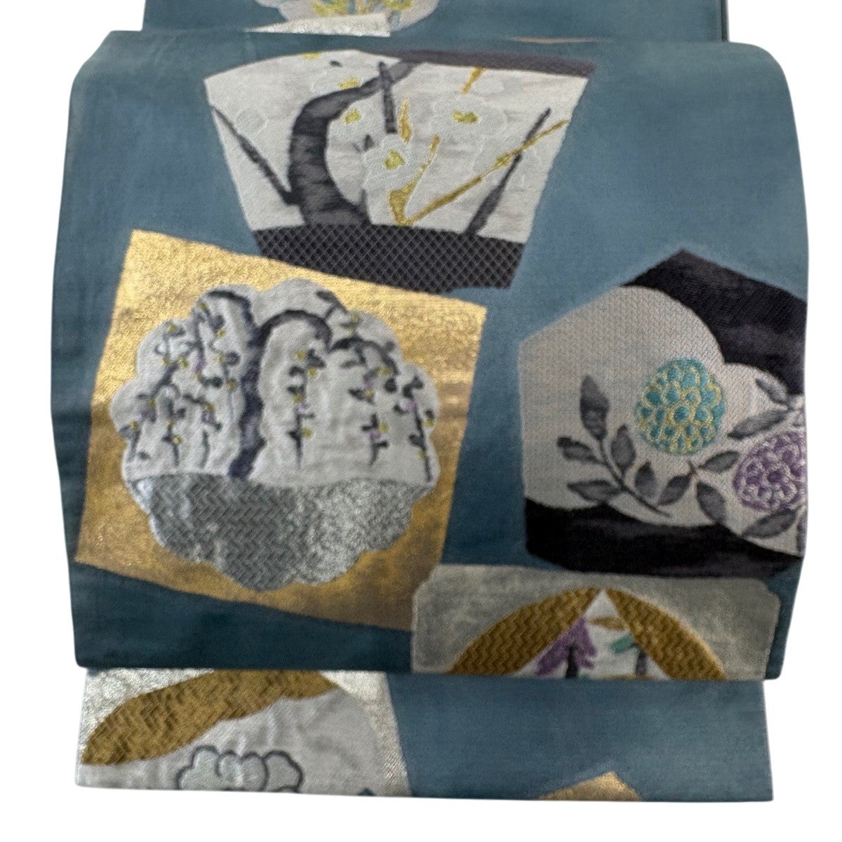 袋帯 秀品 草花 華文 金糸 箔 青灰色 六通 正絹