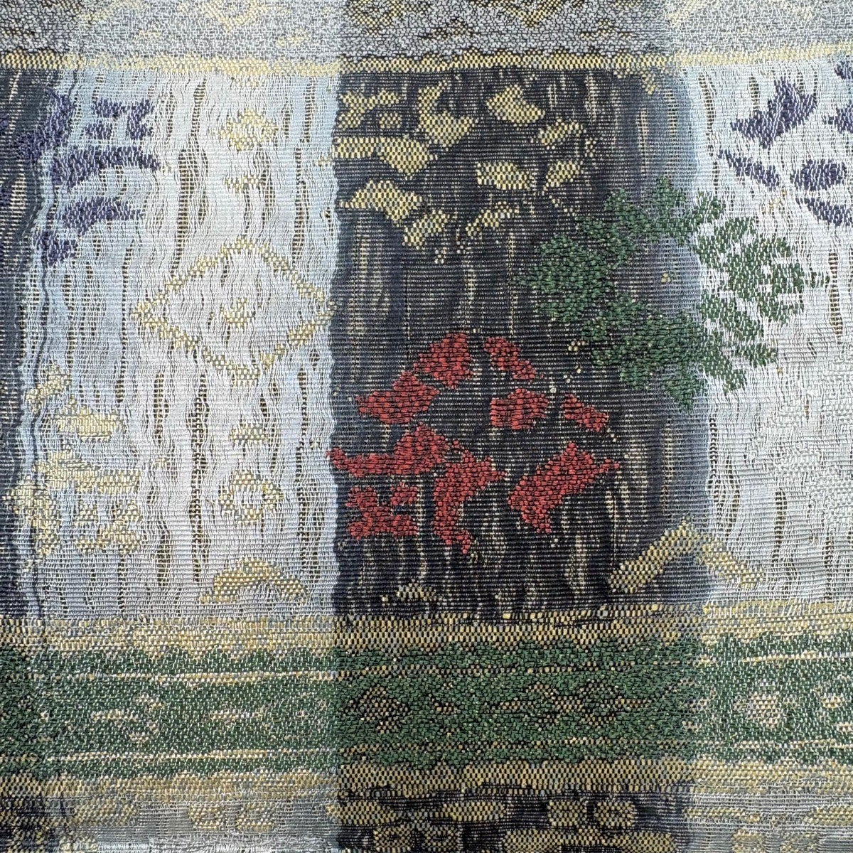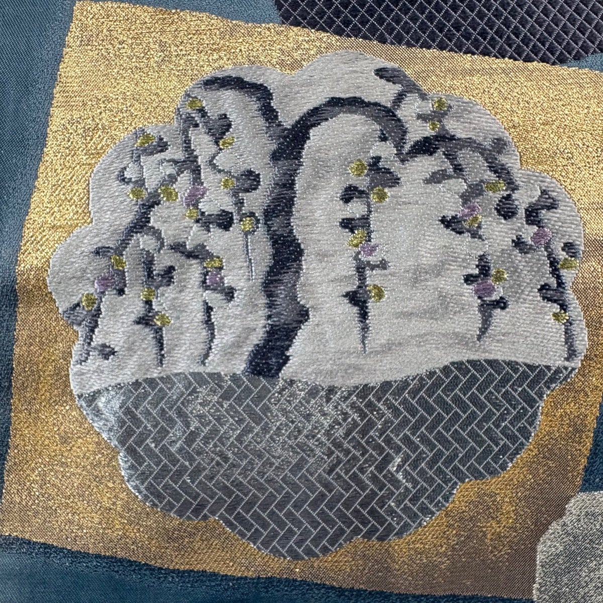 袋帯 名品 草花 樹木 金糸 箔 青灰色 六通 正絹