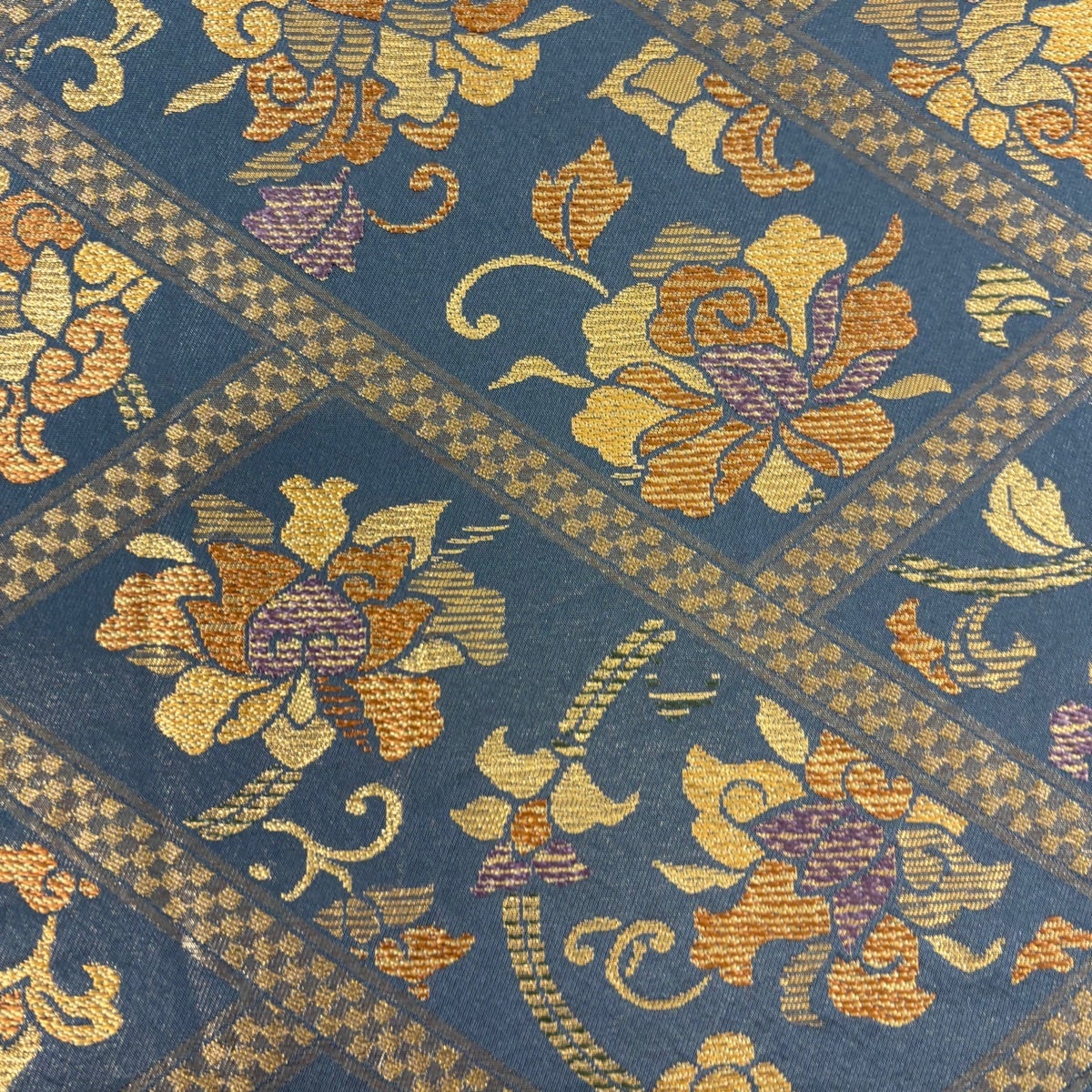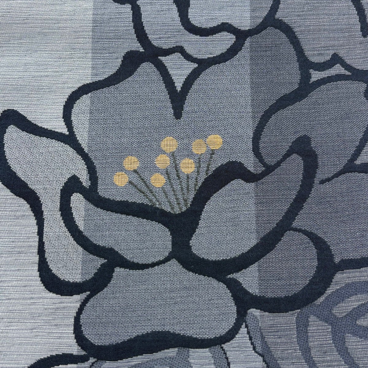 袋帯 秀品 夏帯 芝 花 金糸 青灰色 お太鼓柄 正絹