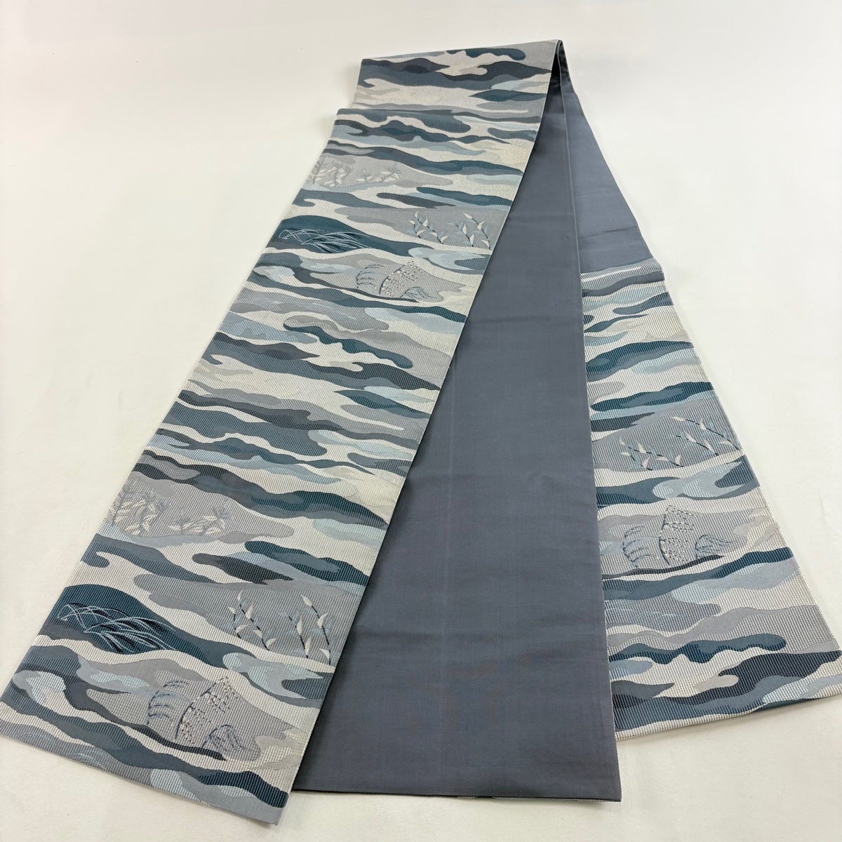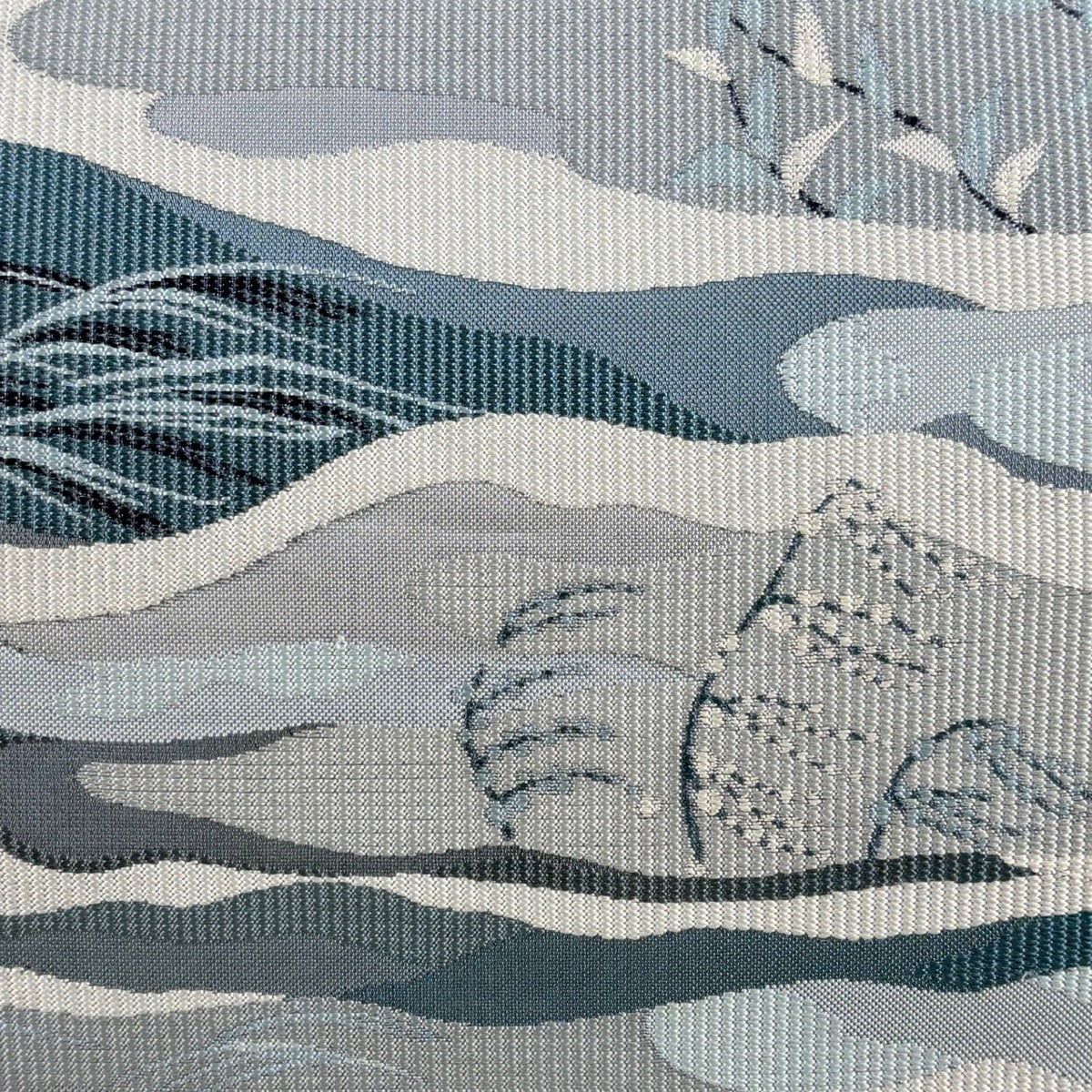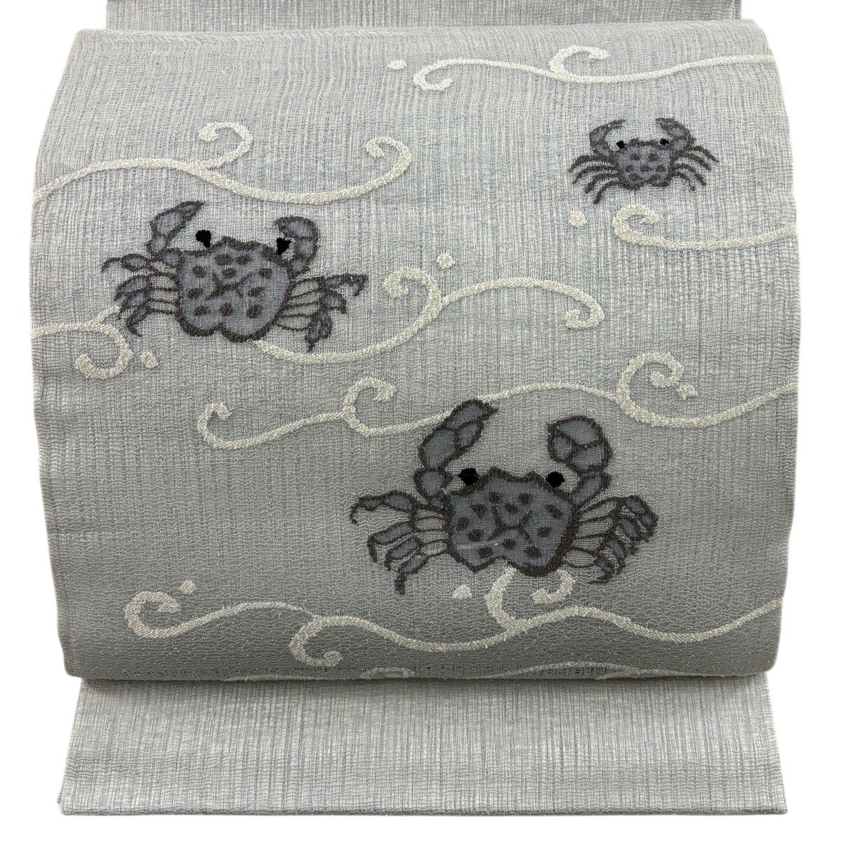 袋帯 秀品 夏帯 蟹 波 箔 青灰色 お太鼓柄 正絹