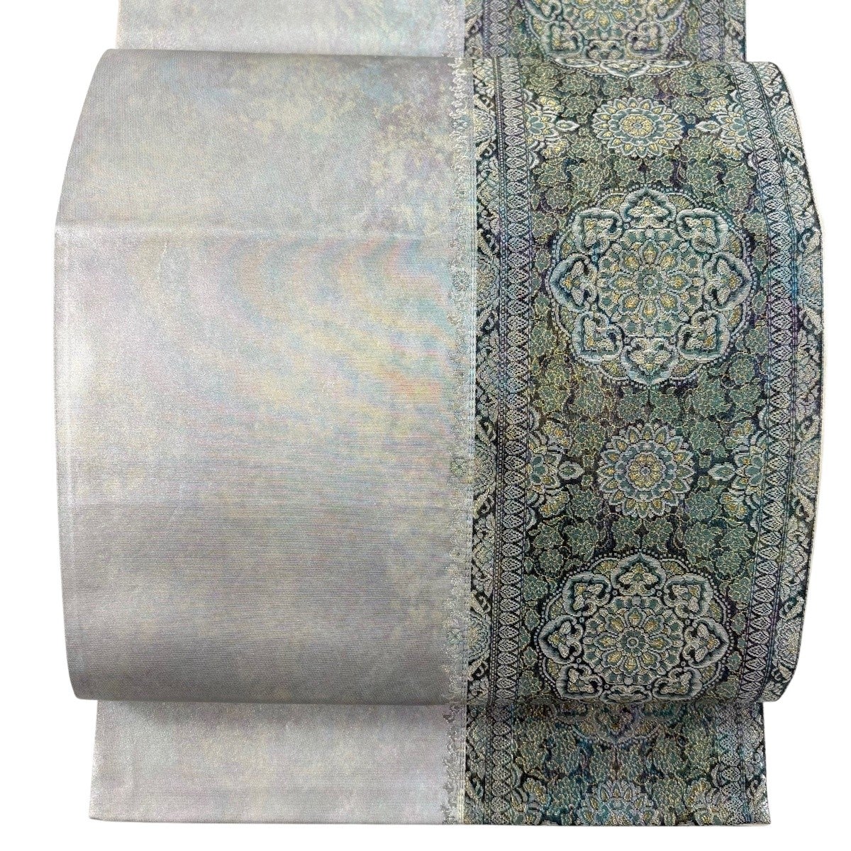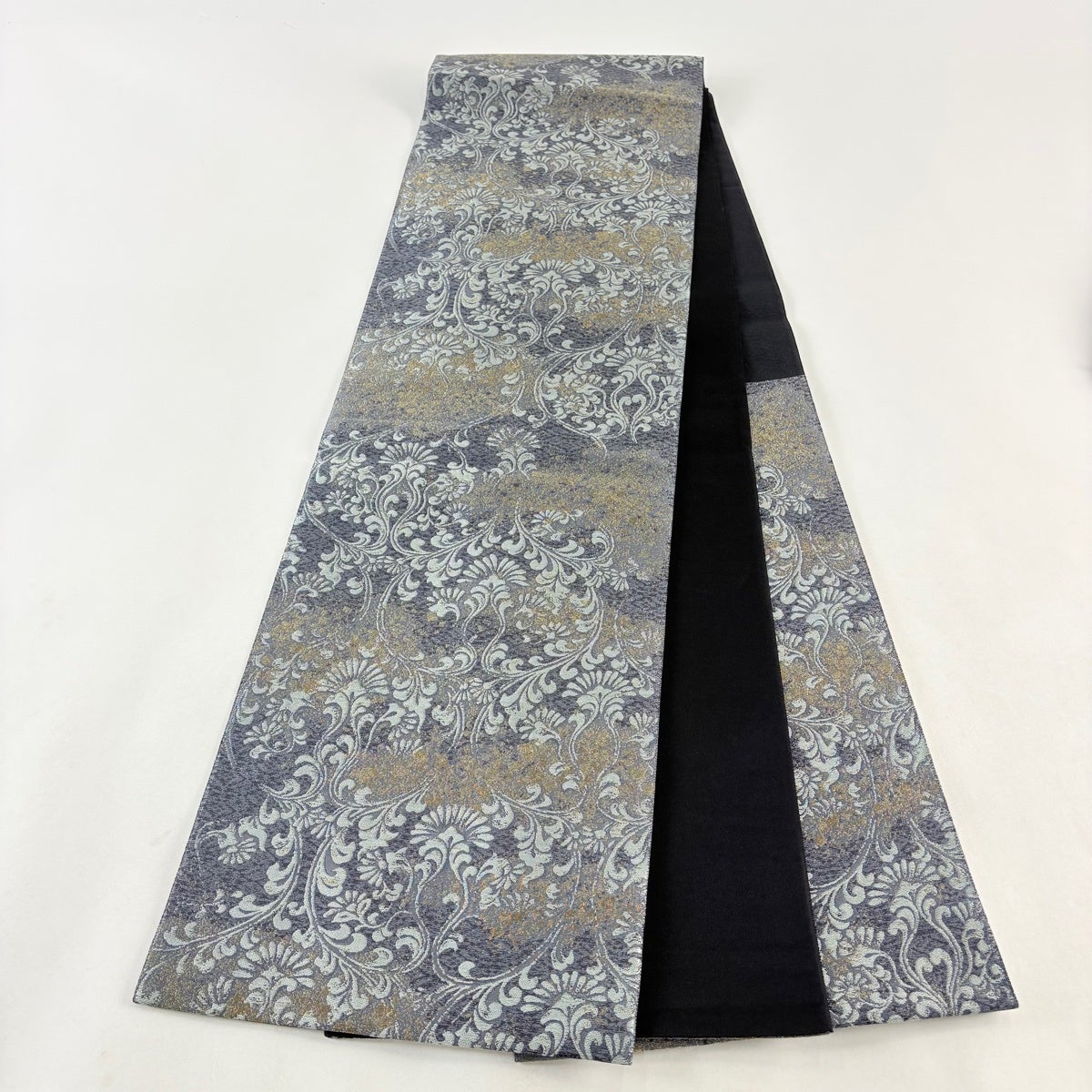 袋帯 秀品 華文 花唐草 箔 金銀糸 青灰色 六通 正絹