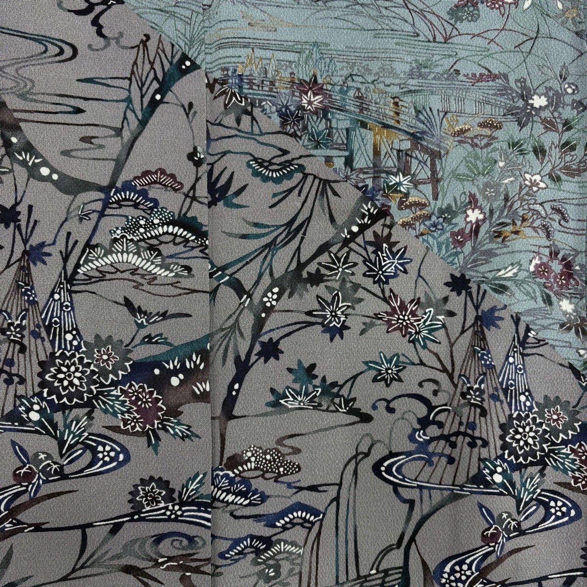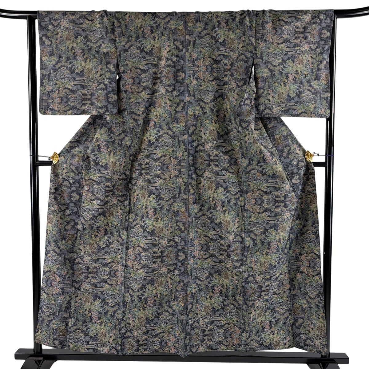 付下げ 身丈161.5cm 裄丈64.5cm M 袷 流水 松 縮緬 青灰色 正絹 秀品