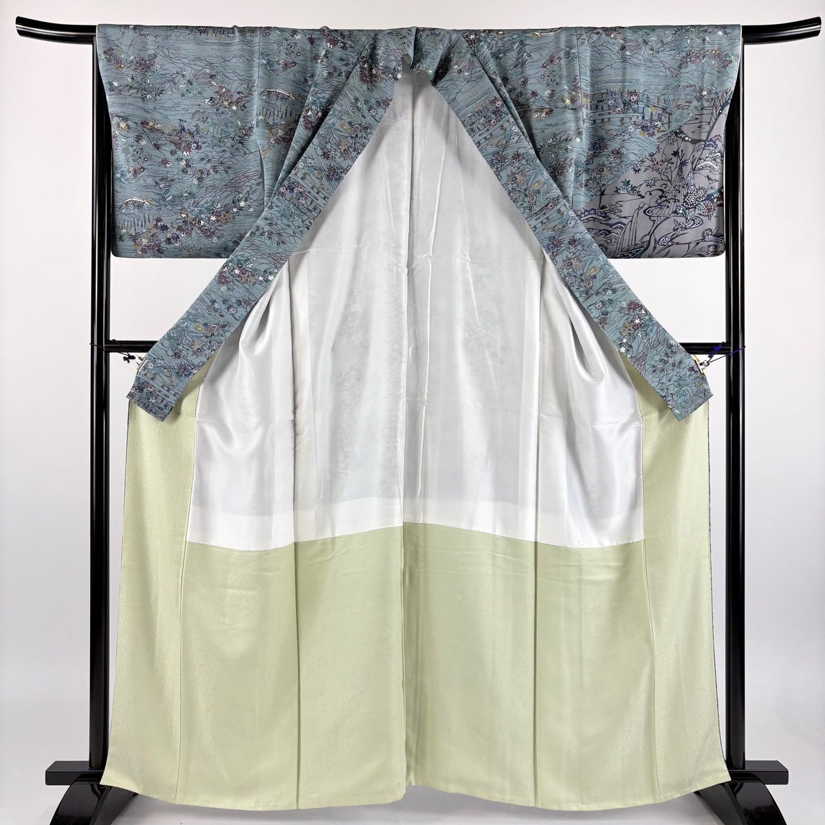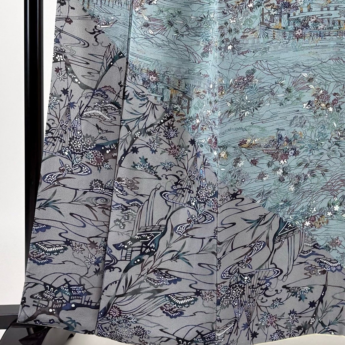 訪問着 身丈156cm 裄丈67cm M 袷 草花 建物 ぼかし 青灰色 正絹 秀品