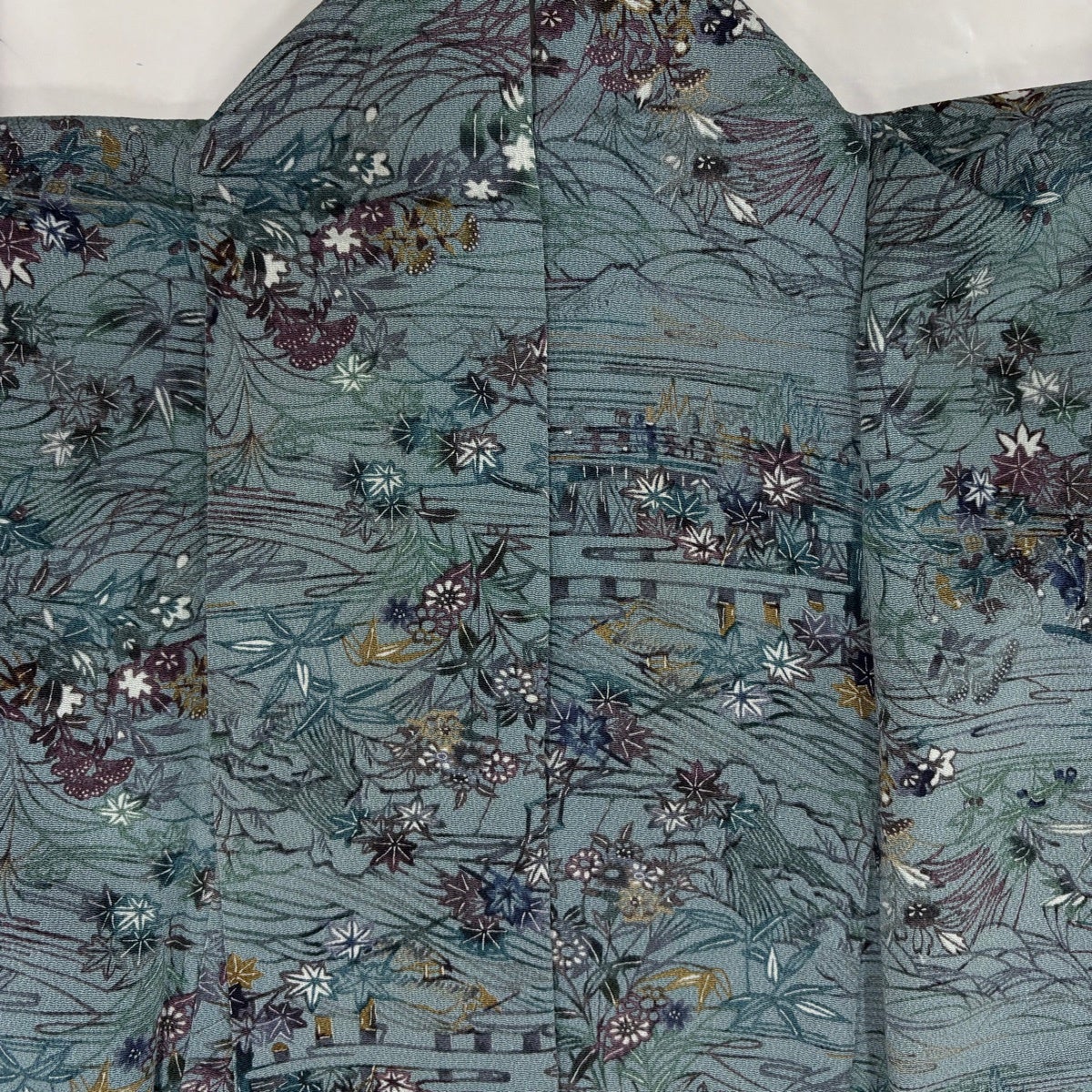 小紋 身丈151cm 裄丈60.5cm S 袷 松竹梅 楓 縮緬 青灰色 正絹 秀品