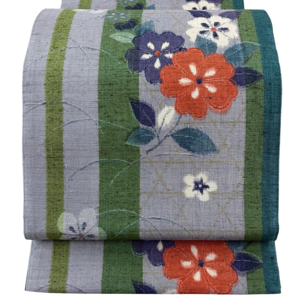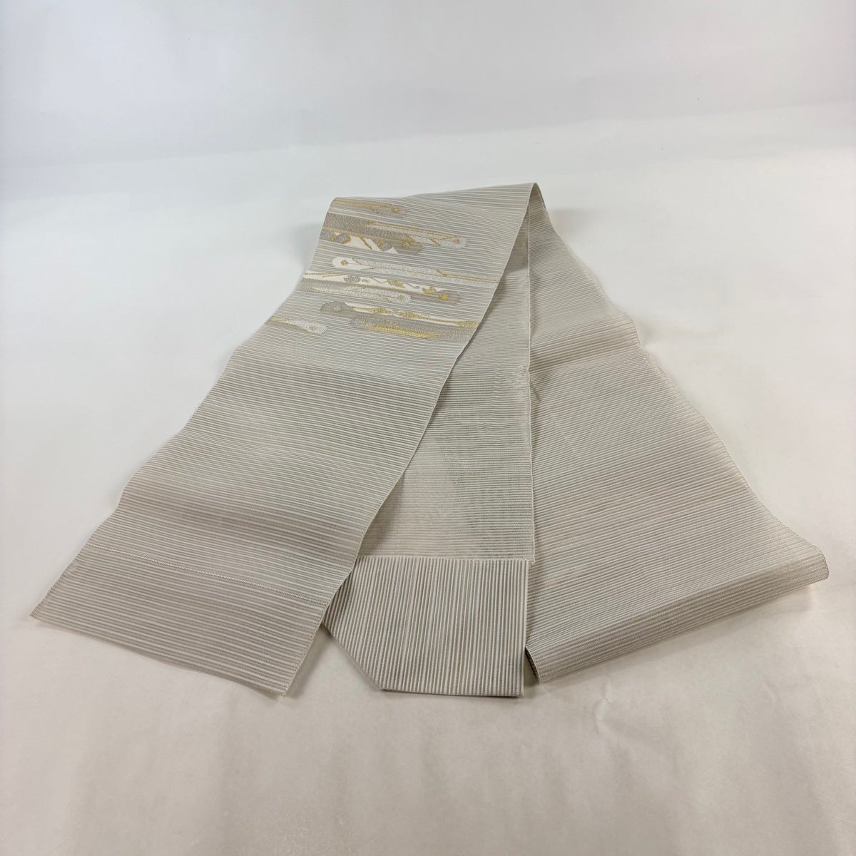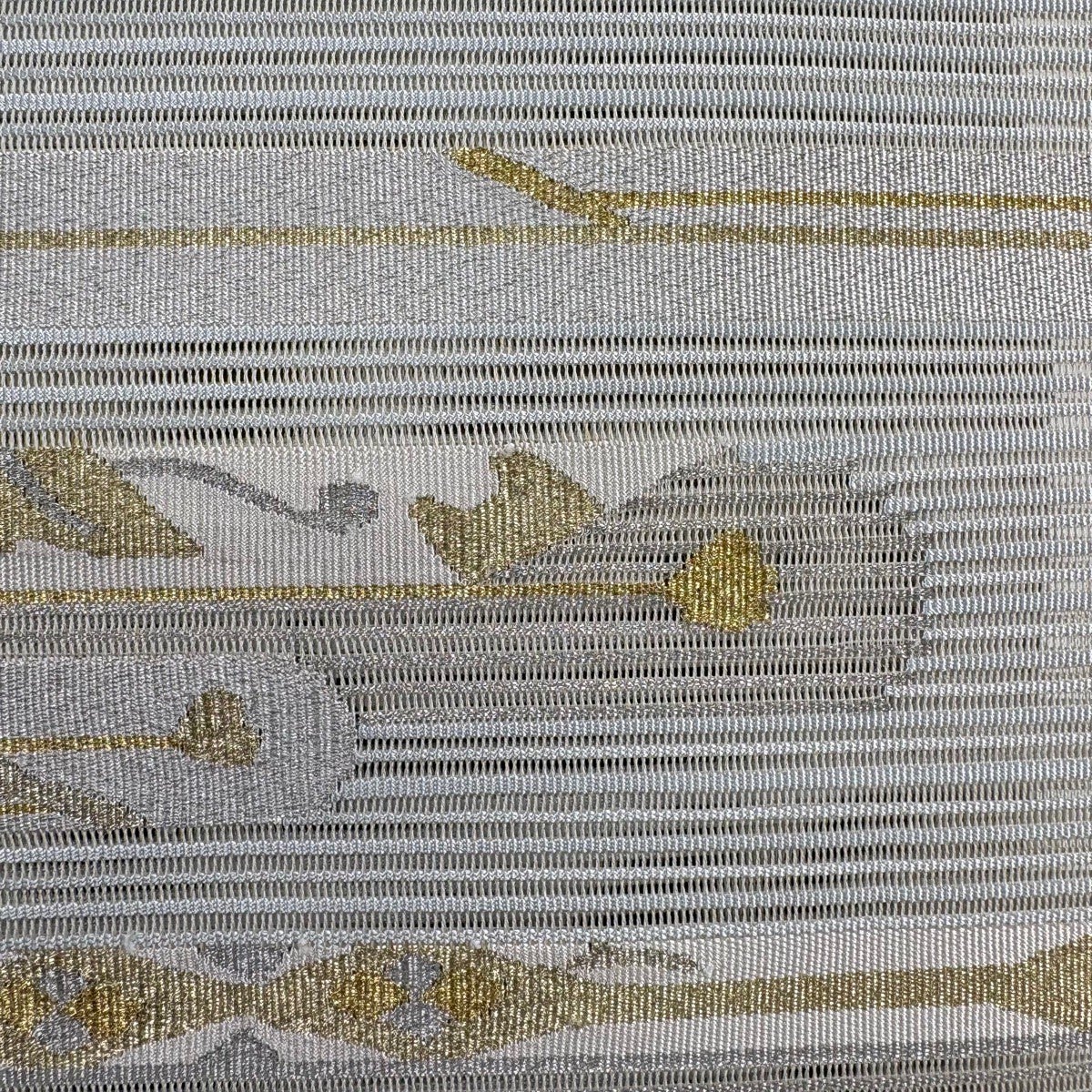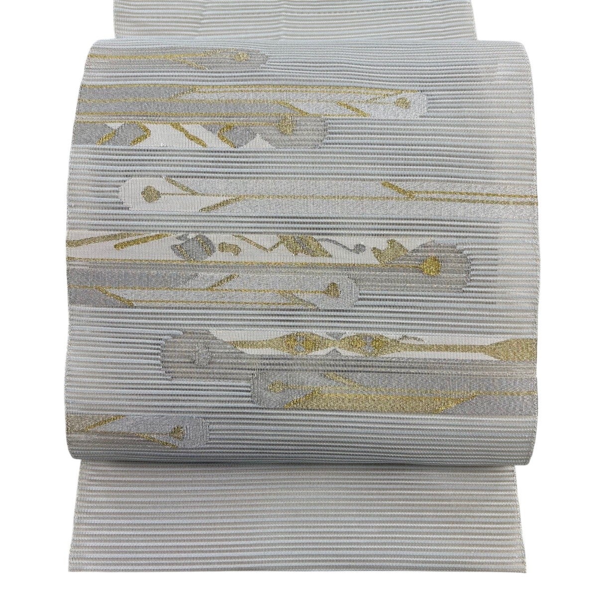 名古屋帯 秀品 夏帯 絽 八寸名古屋帯 松葉仕立て 縞 幾何学模様 金銀糸 青灰色 正絹