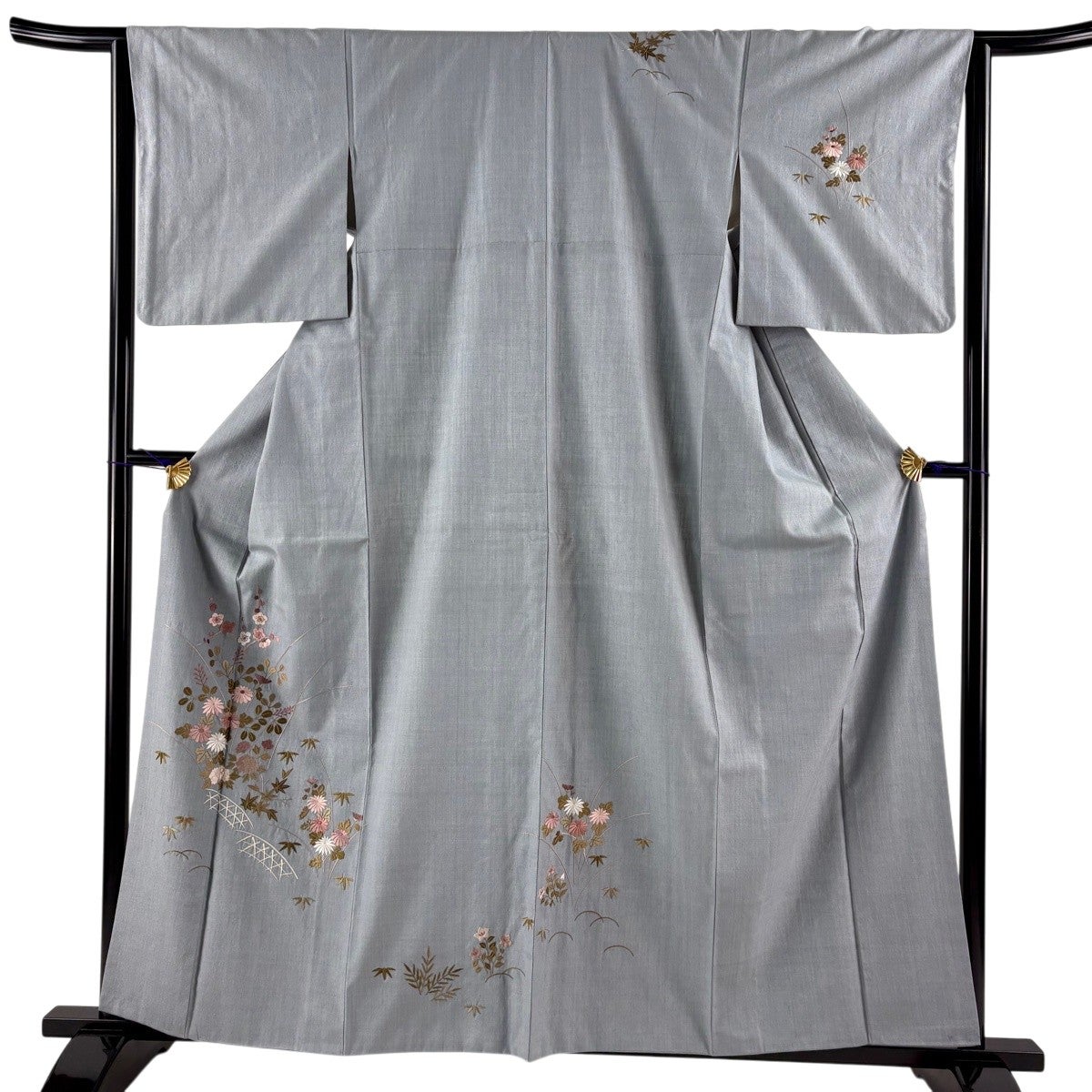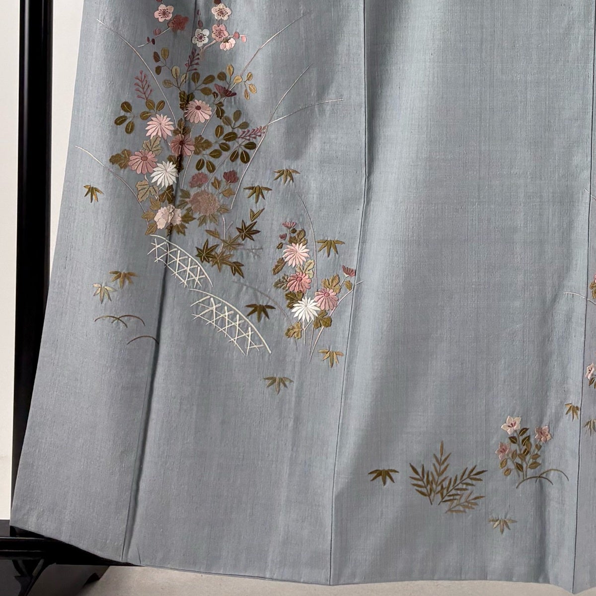 付下げ 身丈159cm 裄丈64cm M 袷 枝花 地紋 青灰色 正絹 秀品 一つ紋