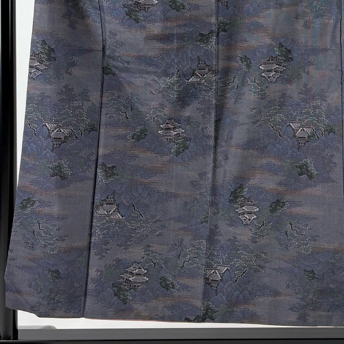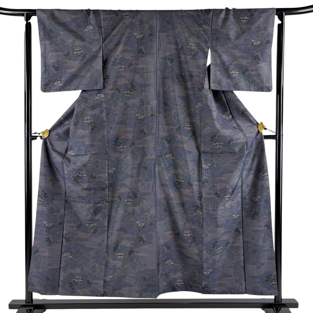 訪問着 身丈152cm 裄丈65cm M 絽袷 建物 樹木 金彩 青灰色 正絹 名品