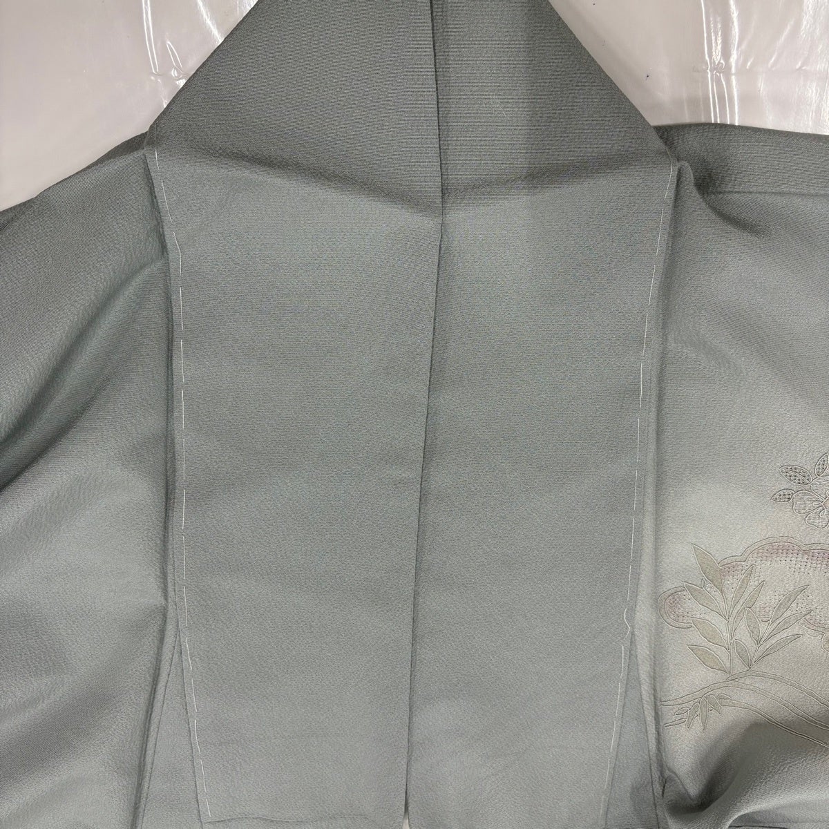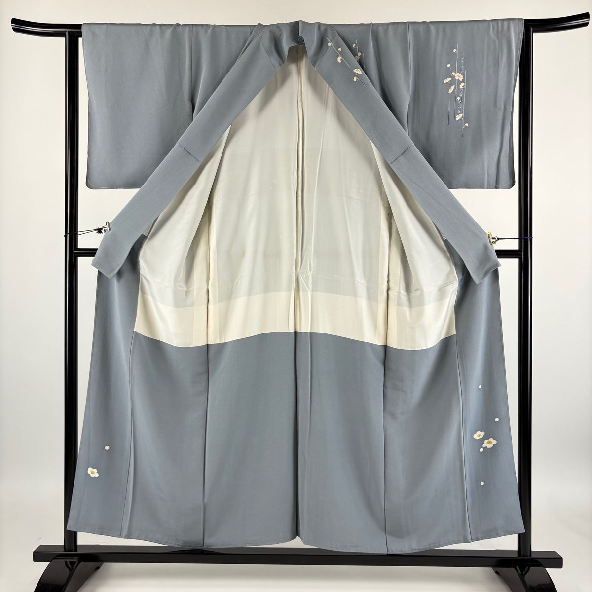 付下げ 身丈157.5cm 裄丈64cm M 袷 花車 梅 刺繍 金糸 青灰色 正絹 秀品 一つ紋