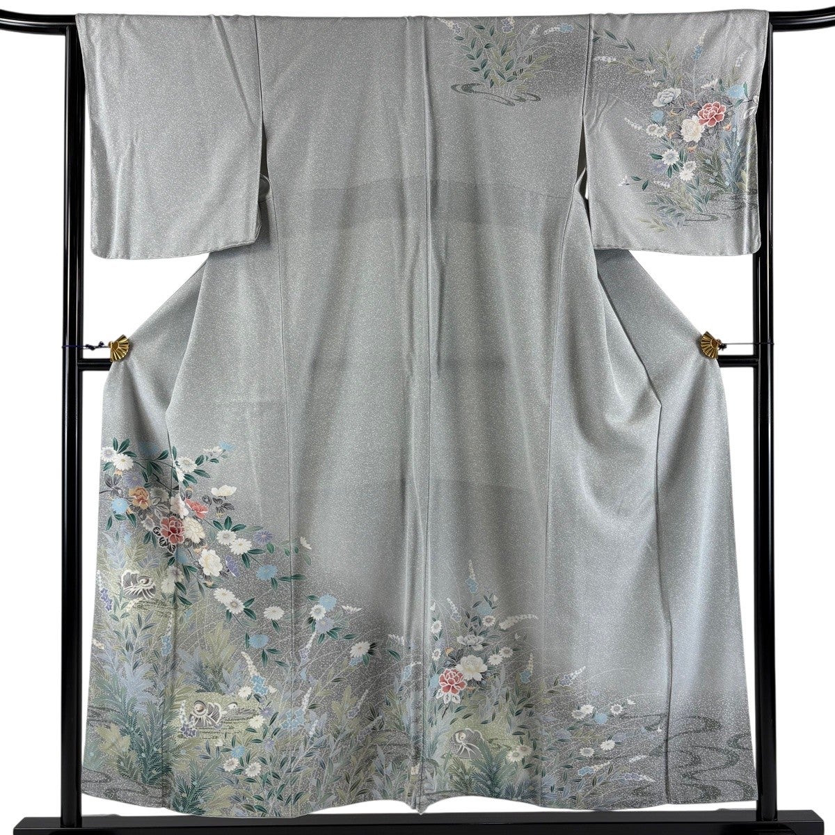 訪問着 身丈165cm 裄丈70cm L 袷 草花 束ね熨斗 金糸 金彩 青灰色 正絹 秀品 一つ紋