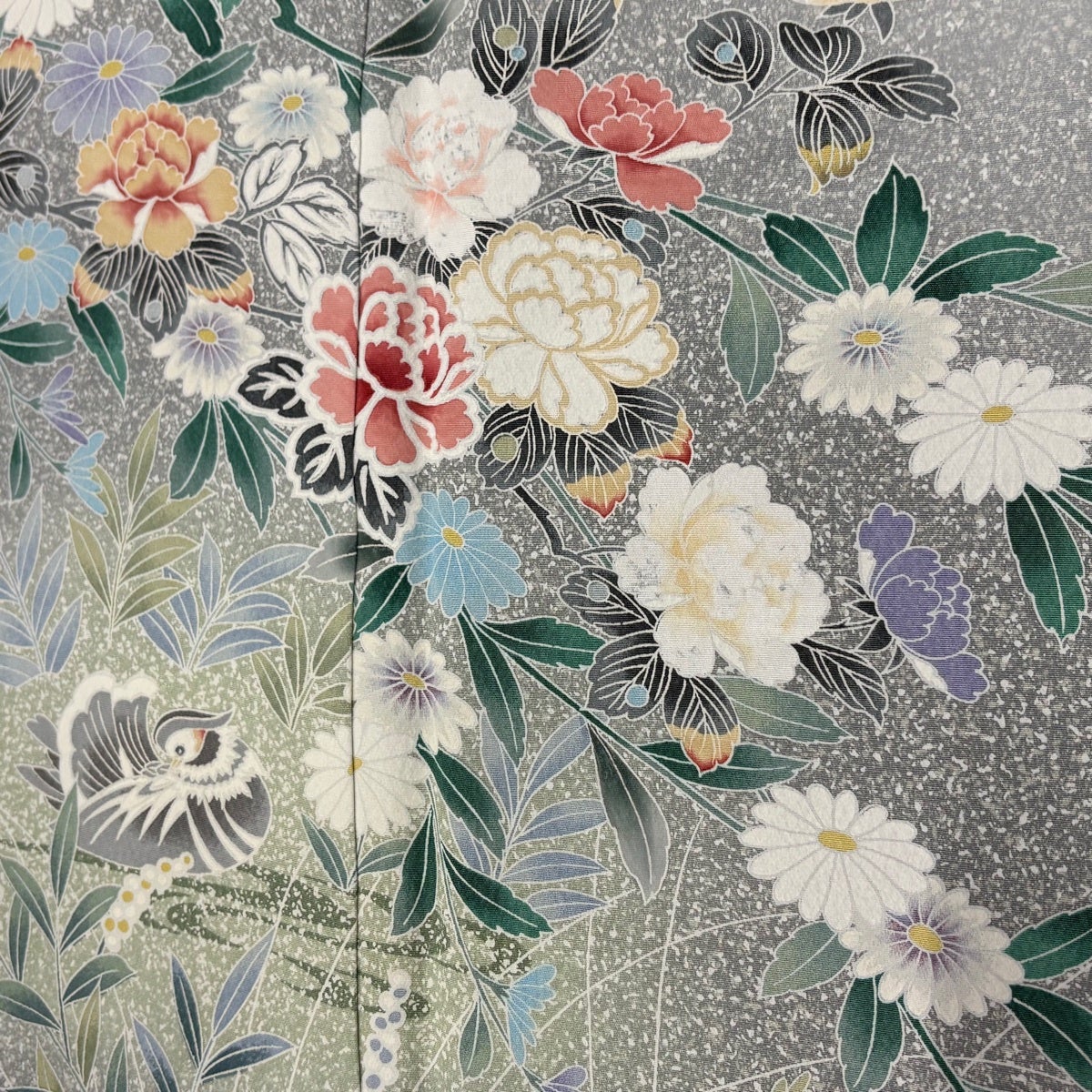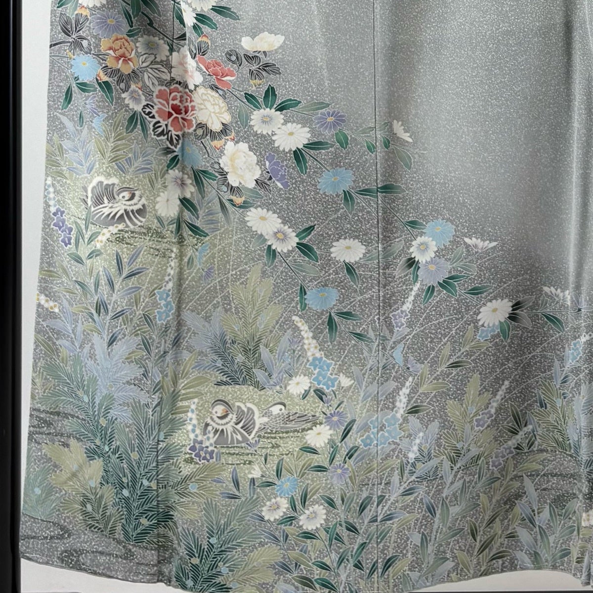 【美品】 訪問着 身丈153.5cm 裄丈66cm M 袷 草花 鴛鴦 ぼかし 青灰色 正絹 秀品