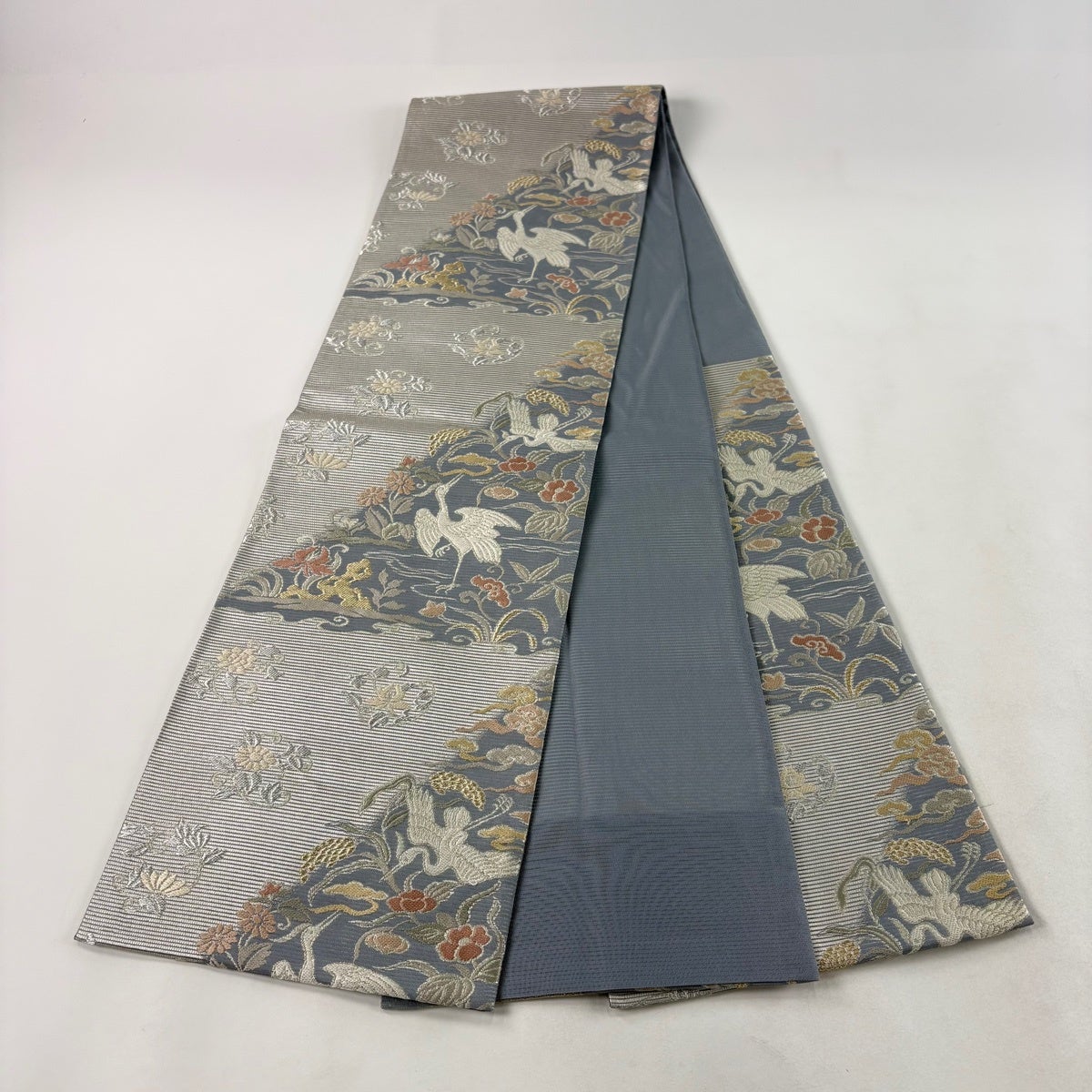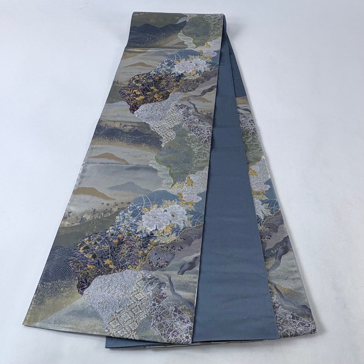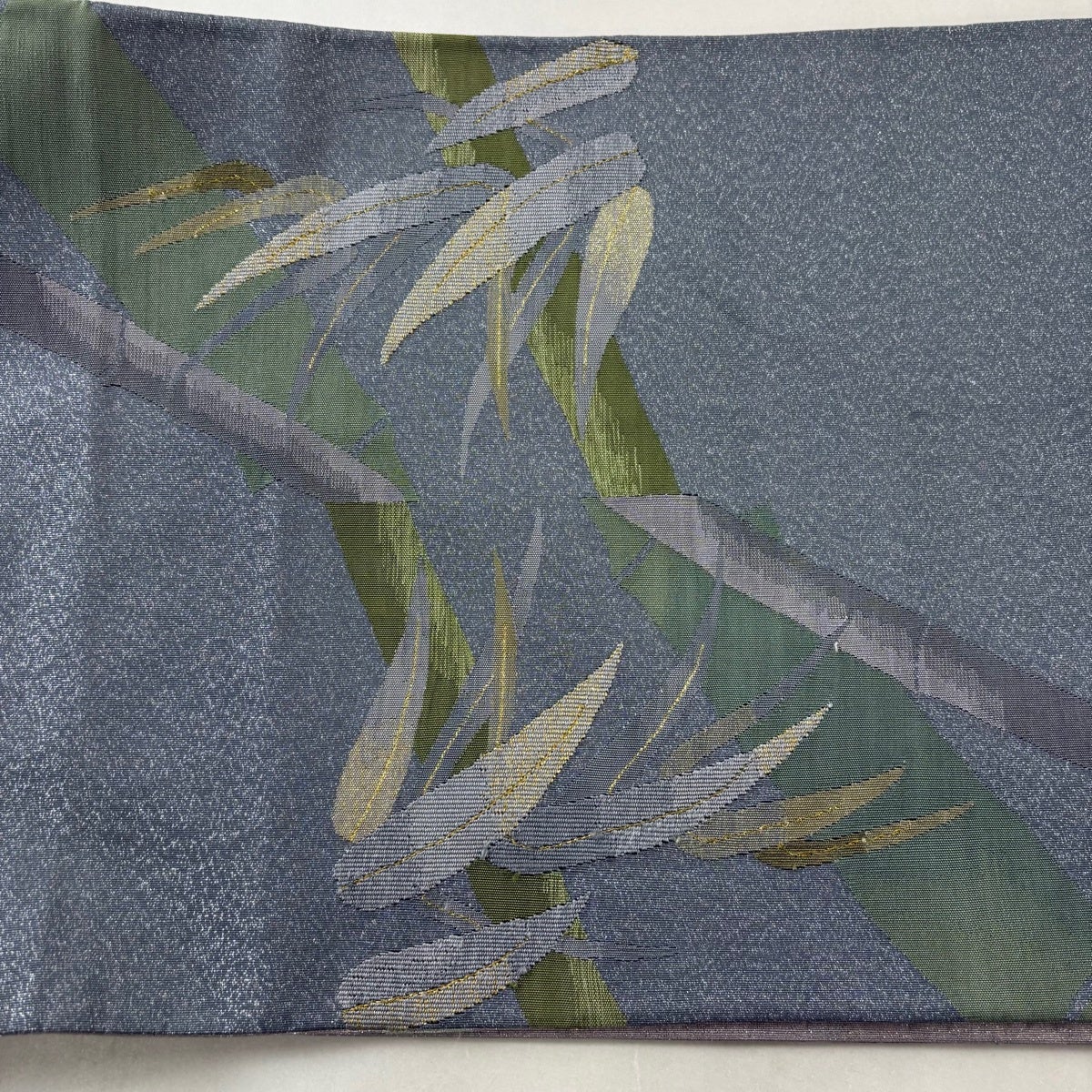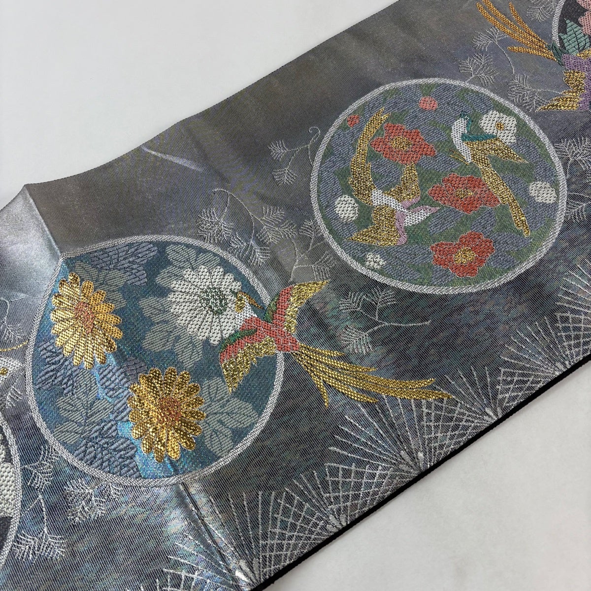 名古屋帯 名品 松葉仕立て 八寸名古屋帯 華文 草花 金銀糸 青灰色 正絹