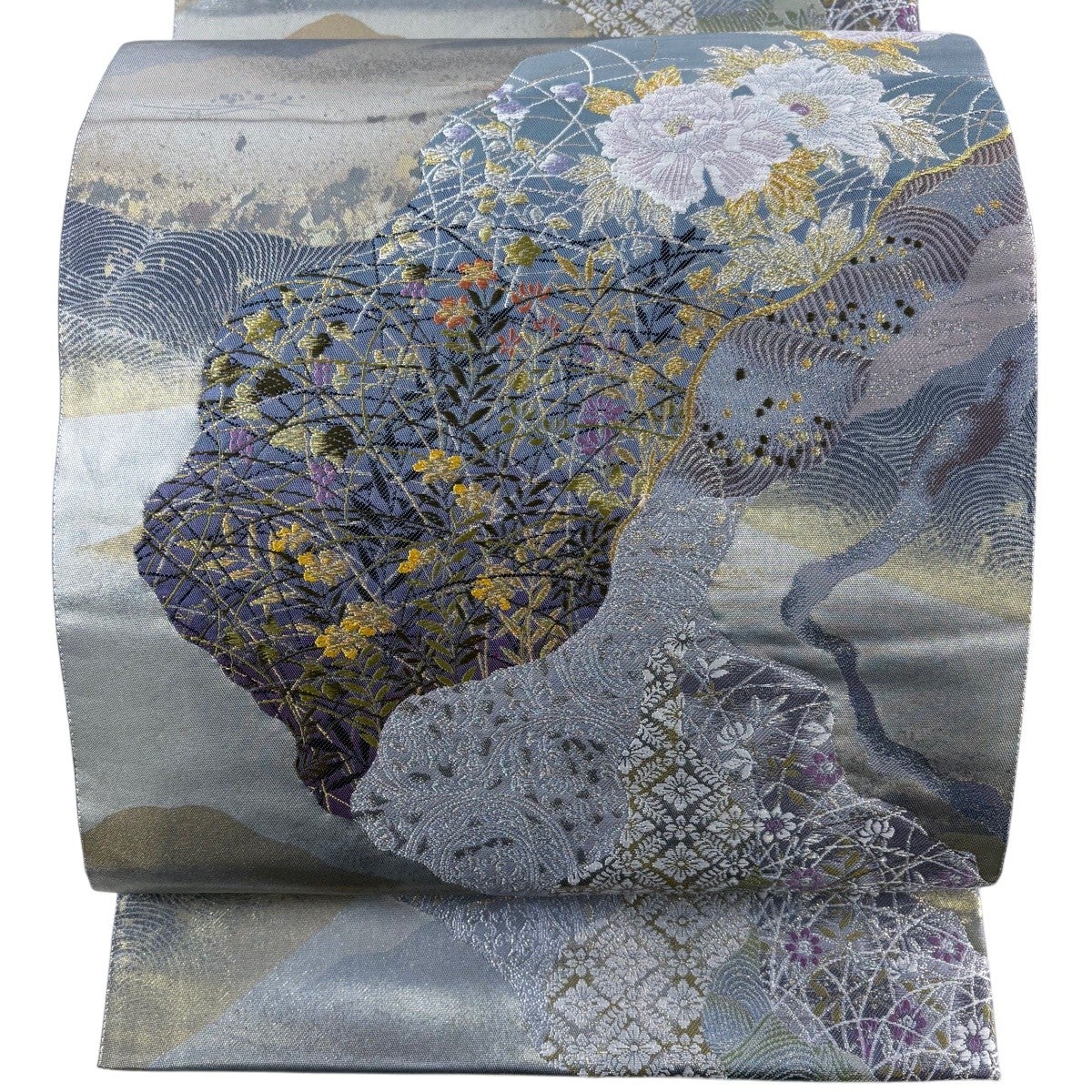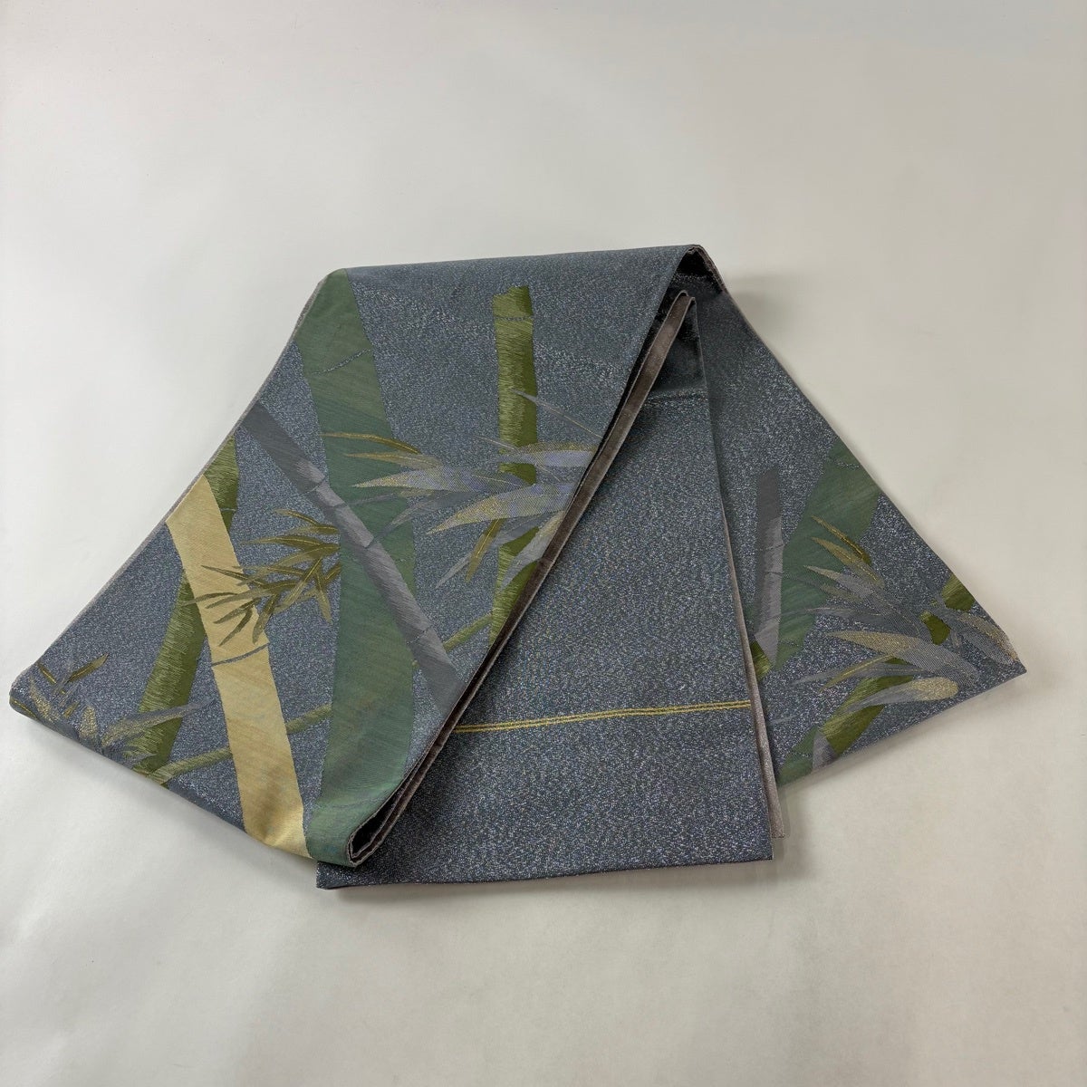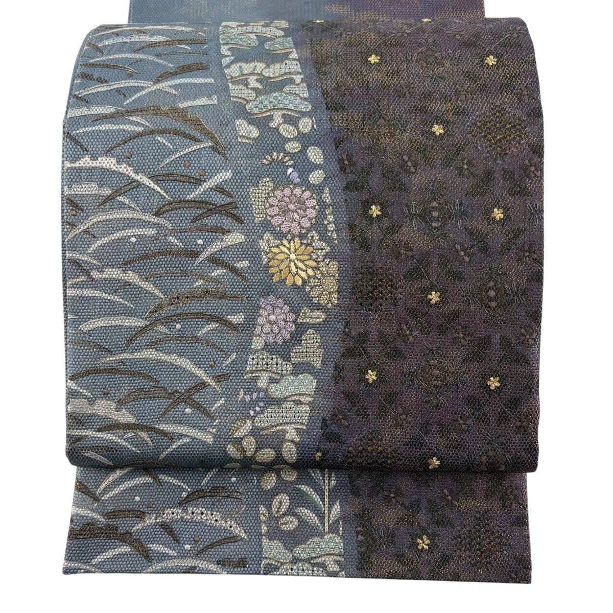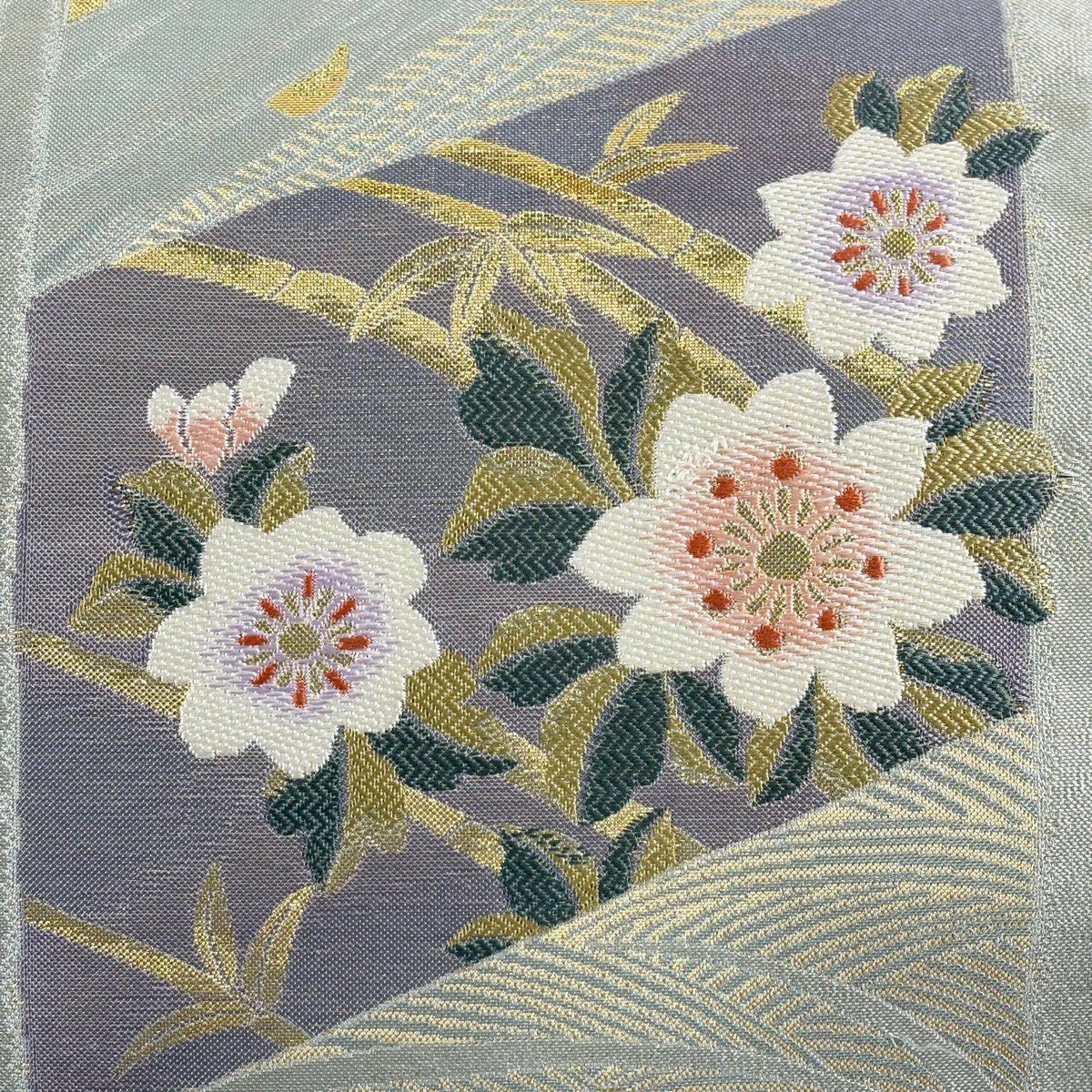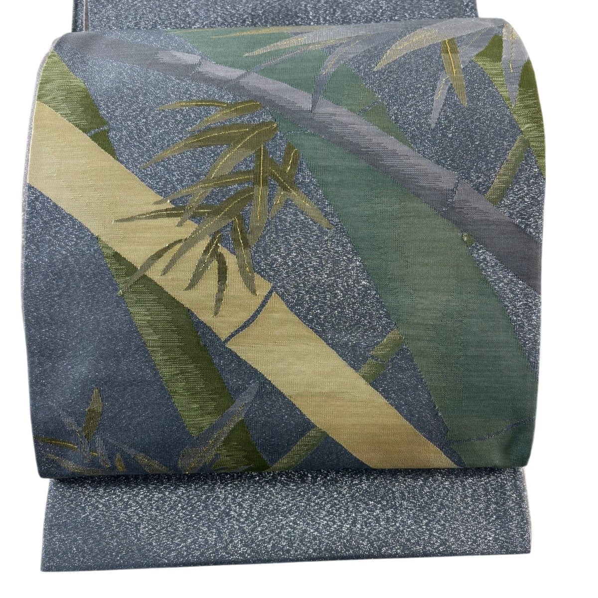 名古屋帯 名品 松葉仕立て 八寸名古屋帯 華文 草花 金銀糸 青灰色 正絹