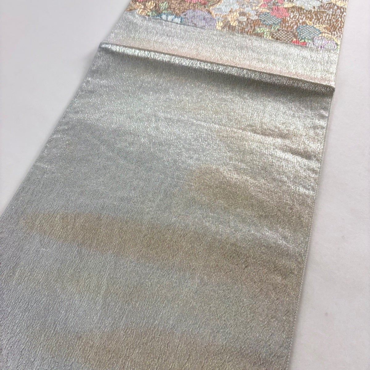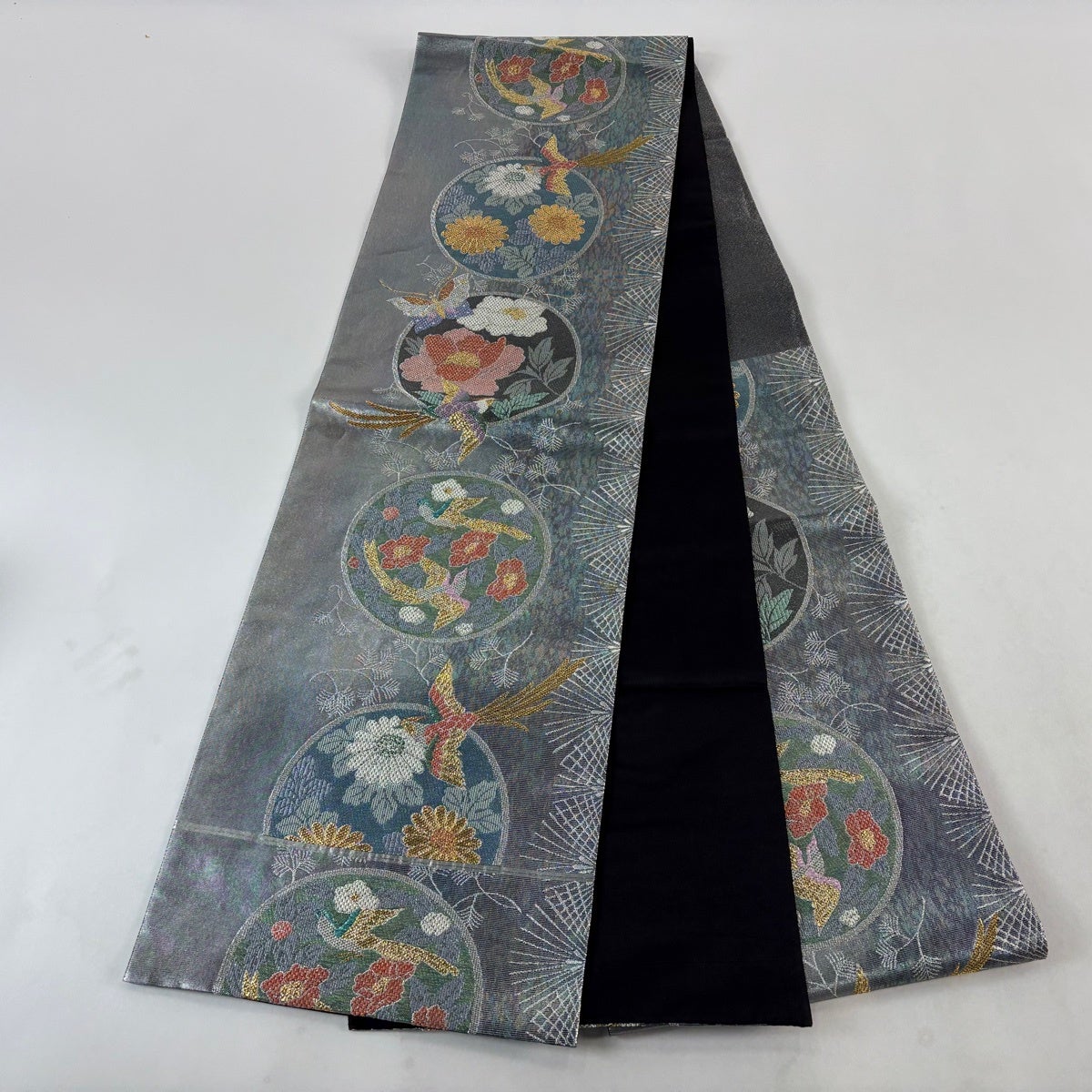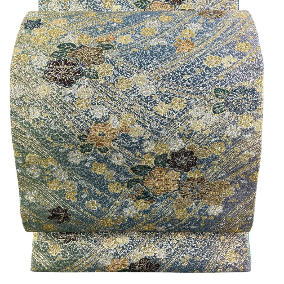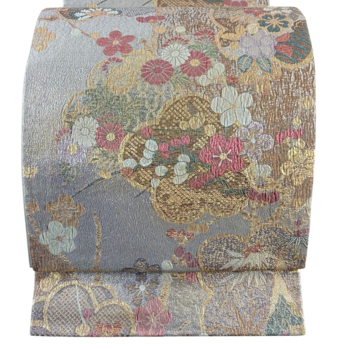 名古屋帯 名品 松葉仕立て 八寸名古屋帯 華文 草花 金銀糸 青灰色 正絹