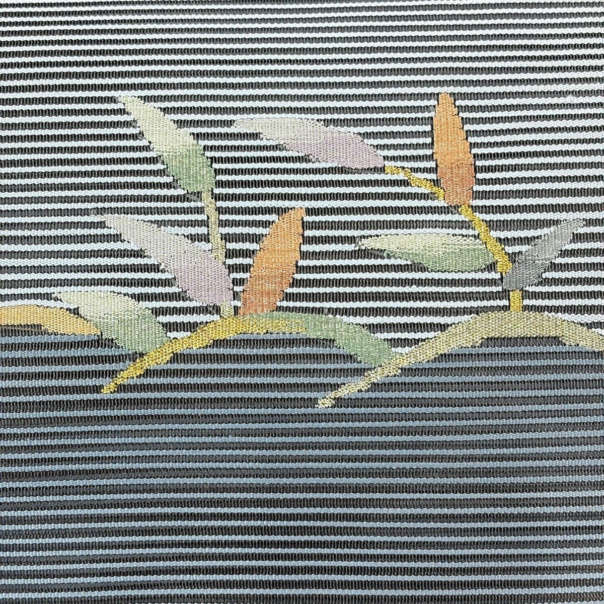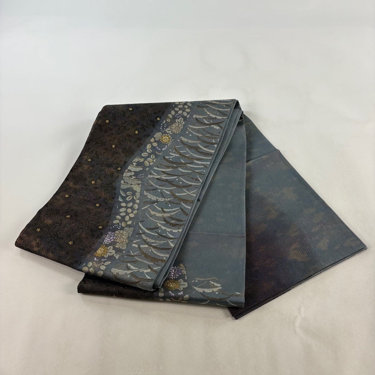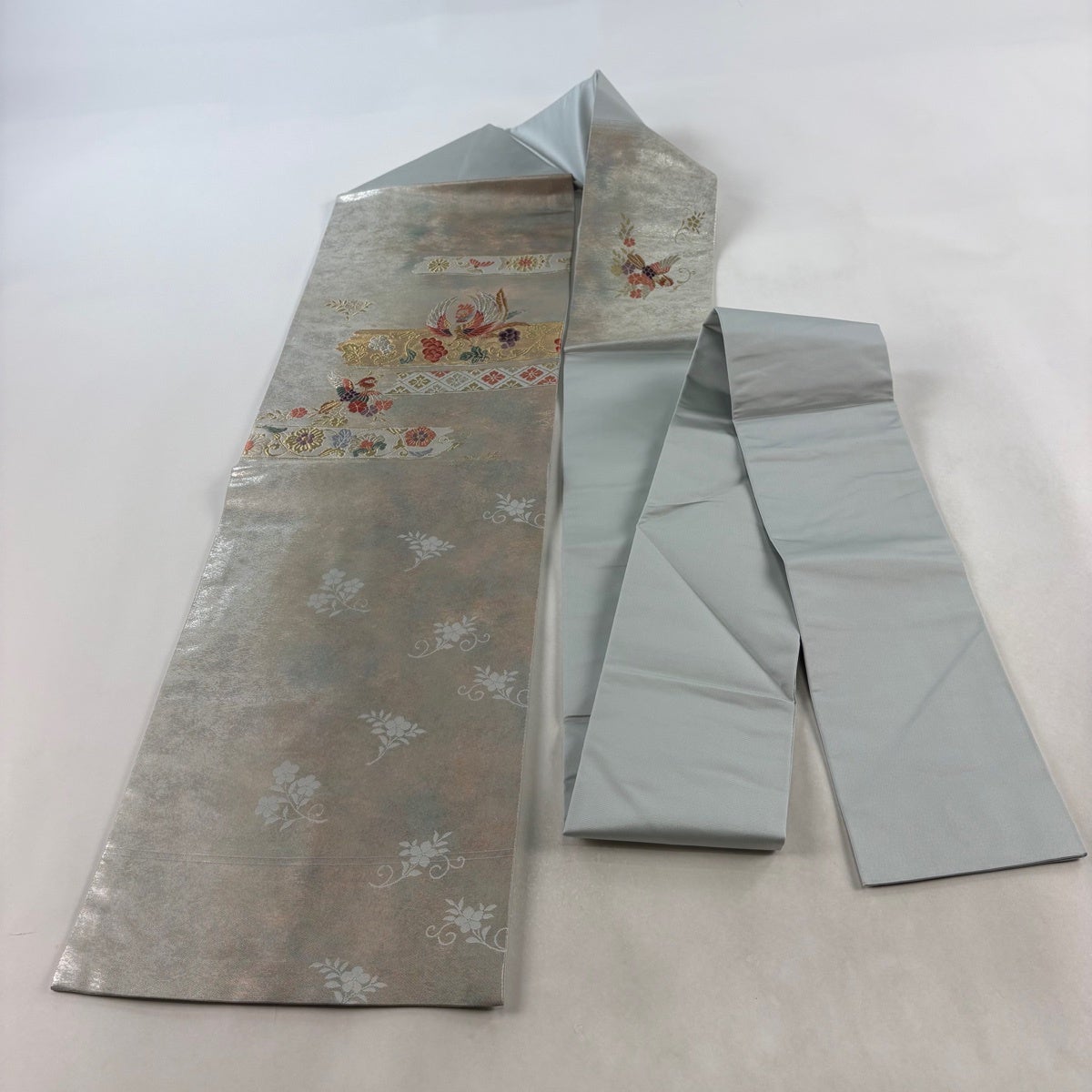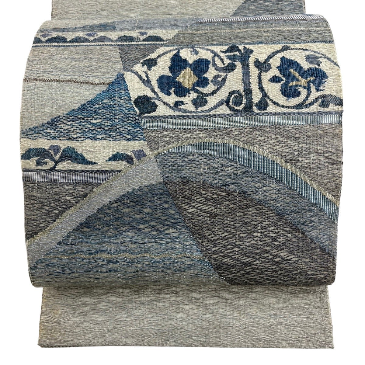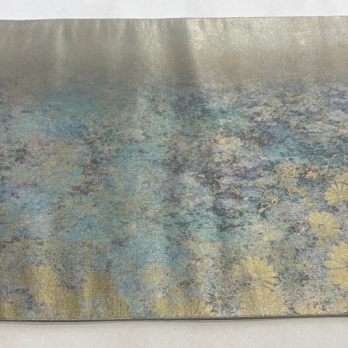 名古屋帯 名品 松葉仕立て 八寸名古屋帯 華文 草花 金銀糸 青灰色 正絹