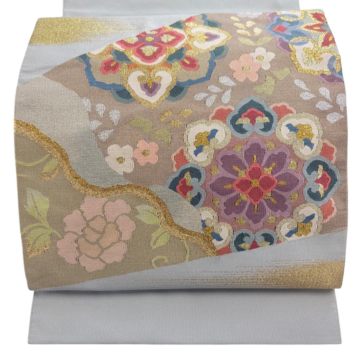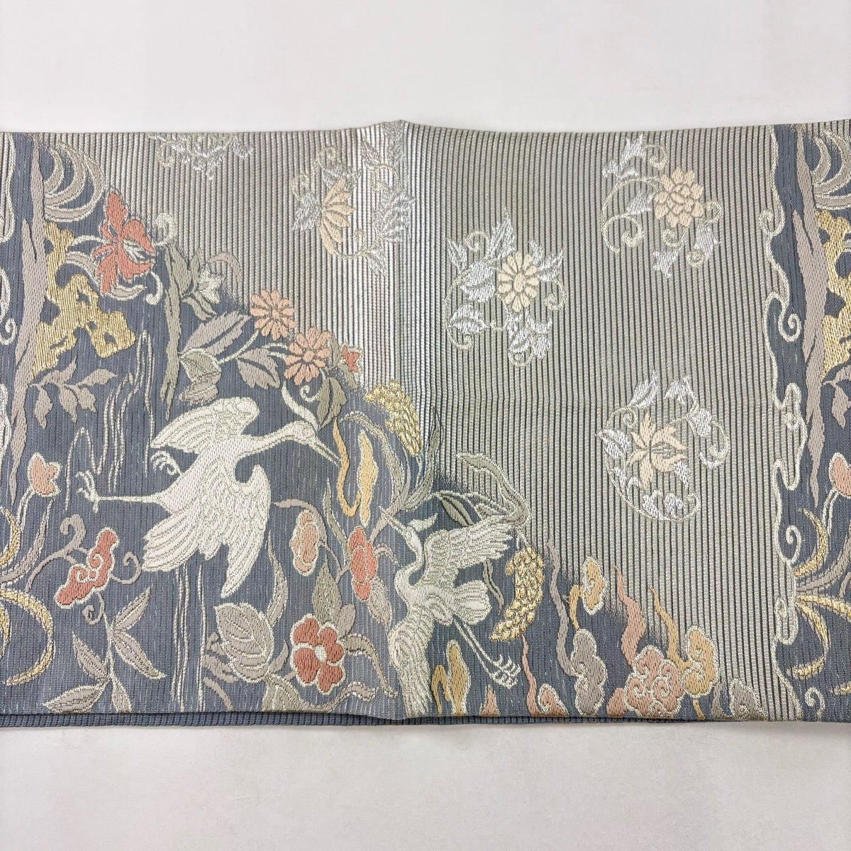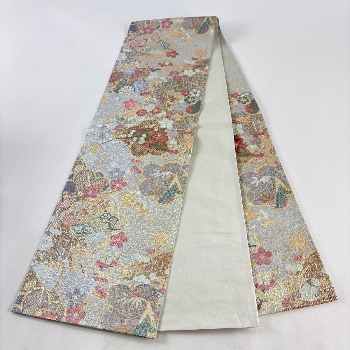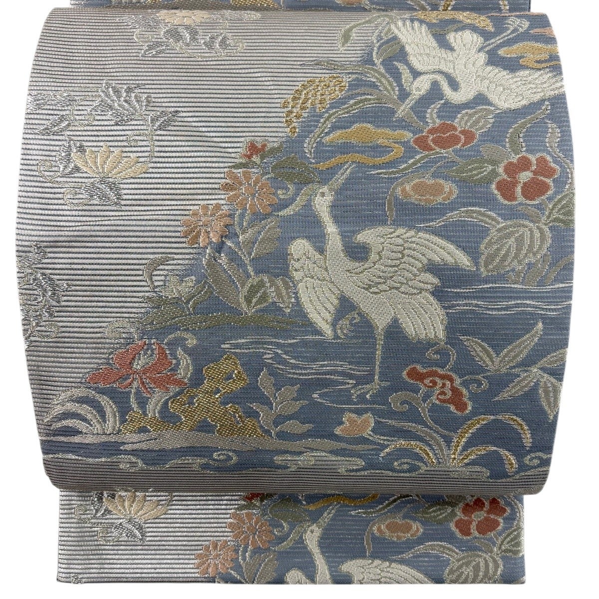 名古屋帯 名品 松葉仕立て 八寸名古屋帯 華文 草花 金銀糸 青灰色 正絹