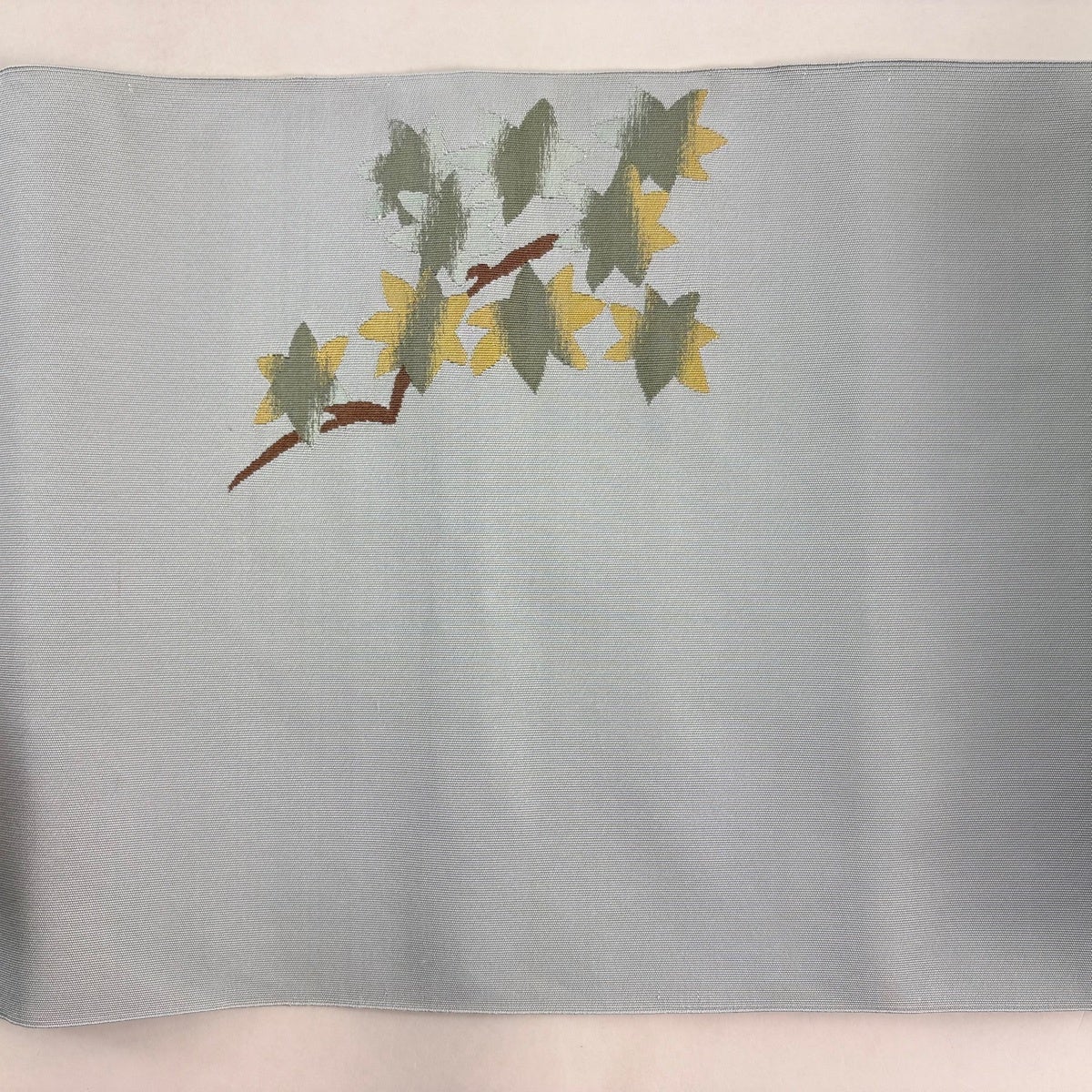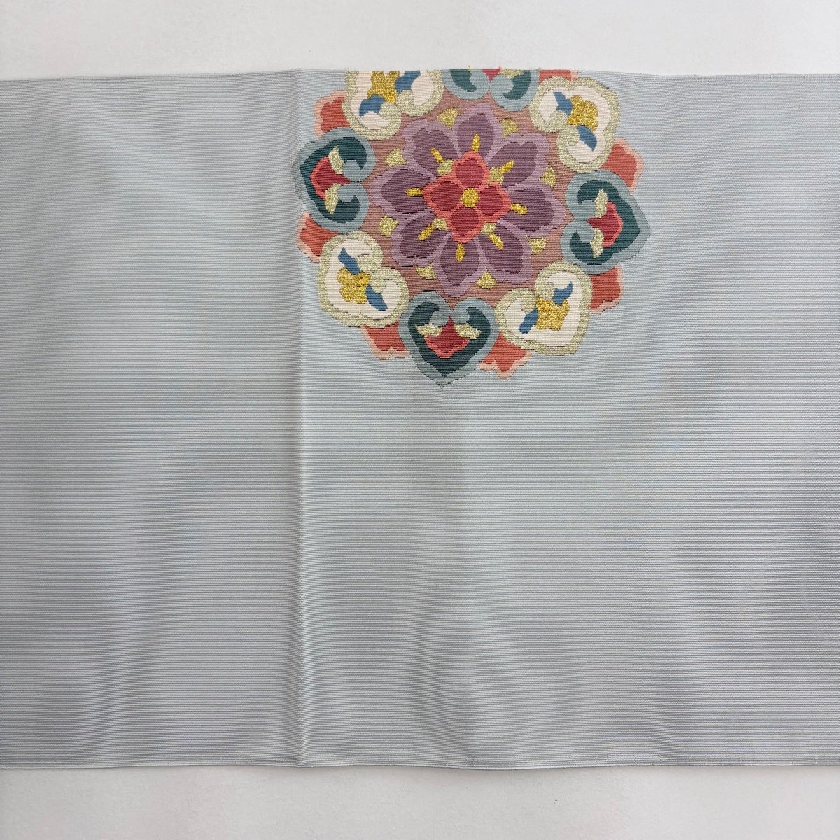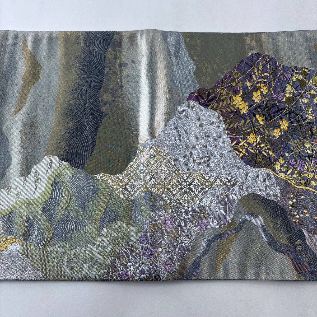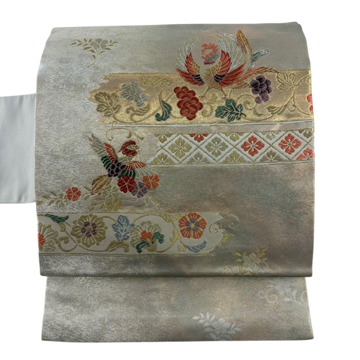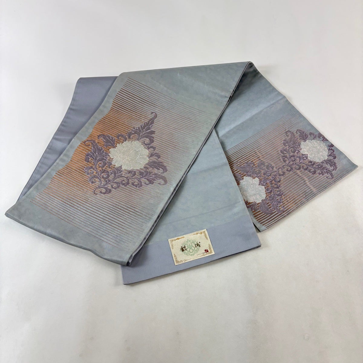 名古屋帯 名品 松葉仕立て 八寸名古屋帯 華文 草花 金銀糸 青灰色 正絹