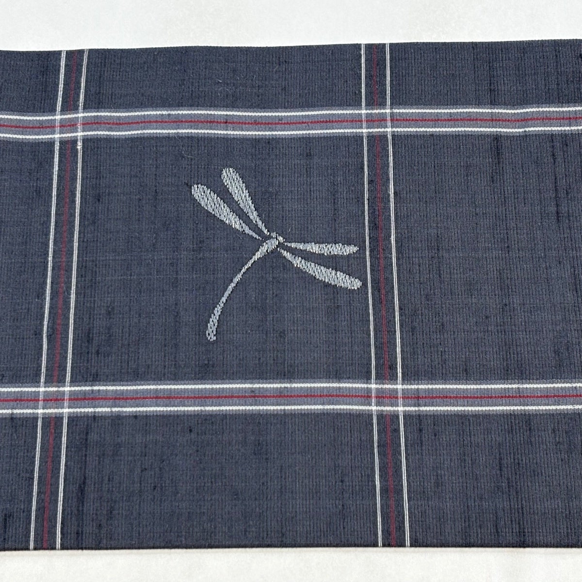 【美品】 名古屋帯 秀品 夏紬地 夏帯 格子 とんぼ 青灰色 正絹