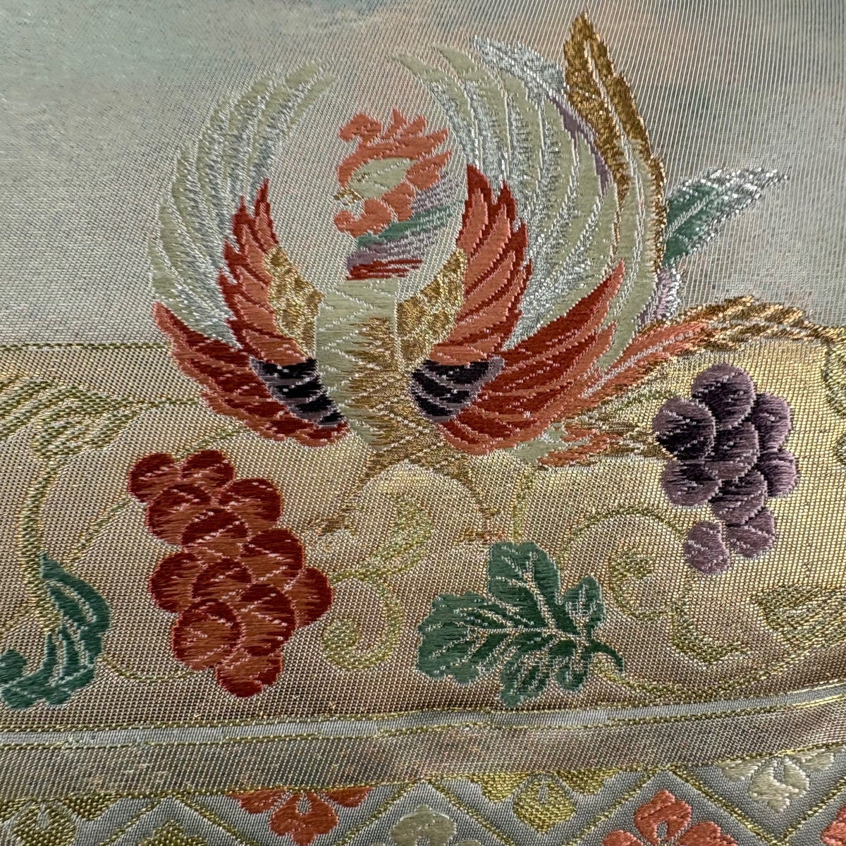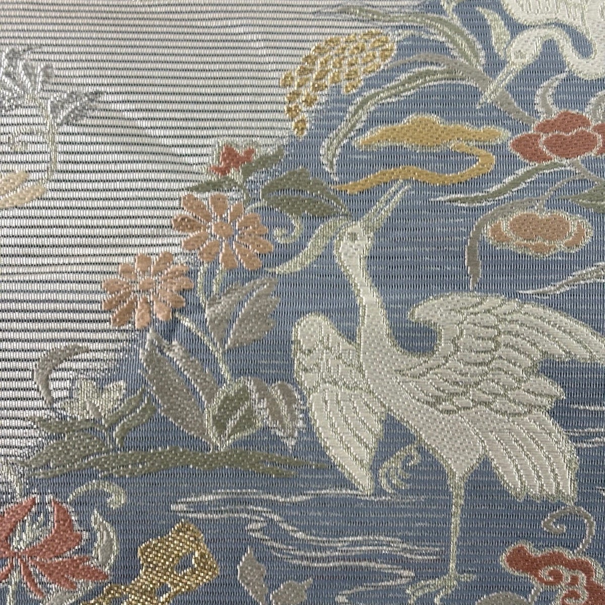 袋帯 秀品 夏帯 絽 鳥 草花 金銀糸 刺繍 青灰色 六通 正絹