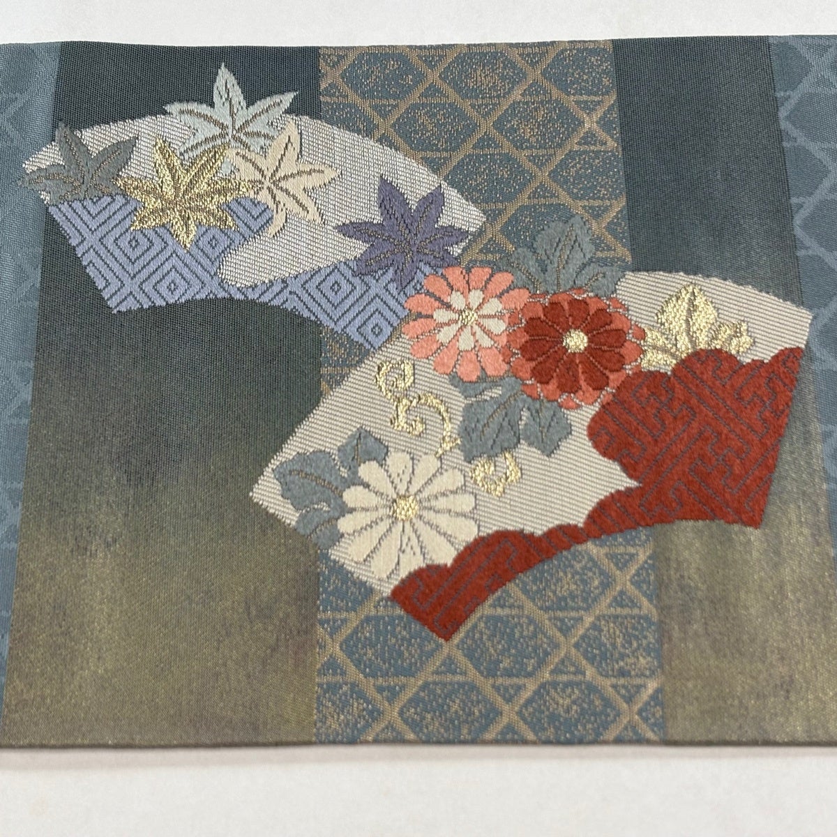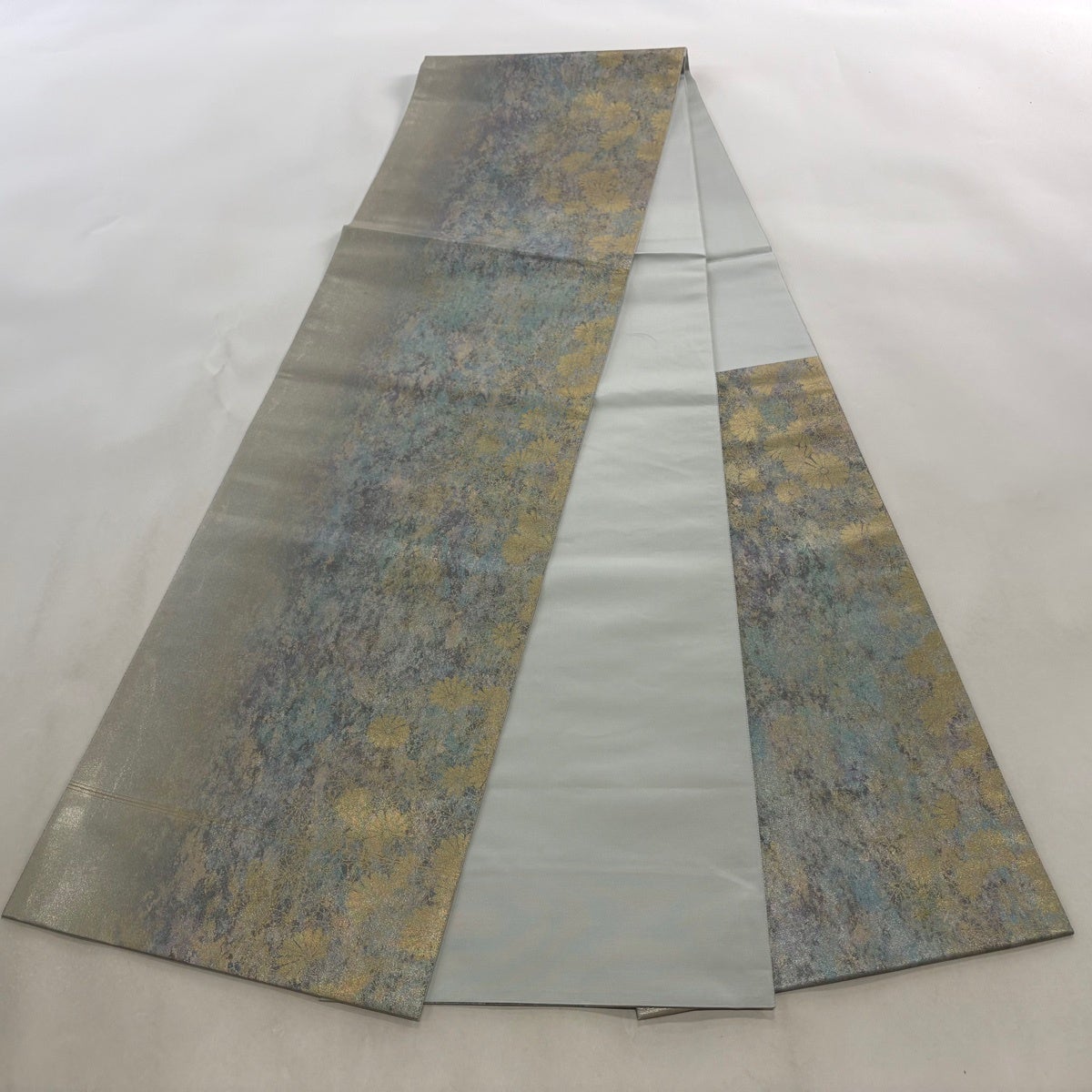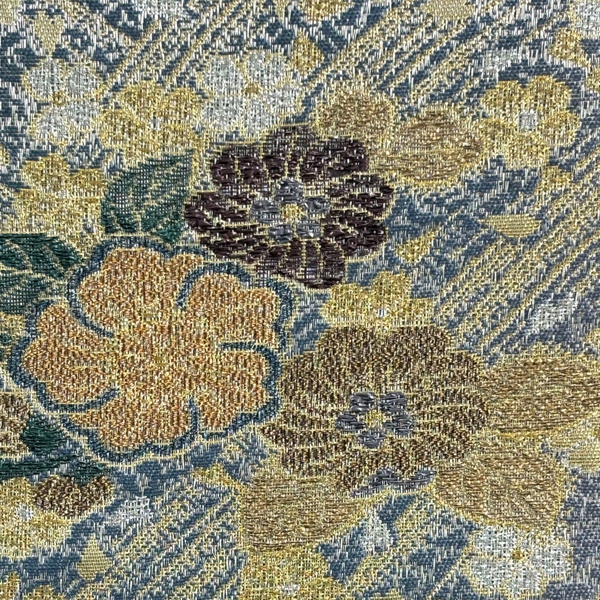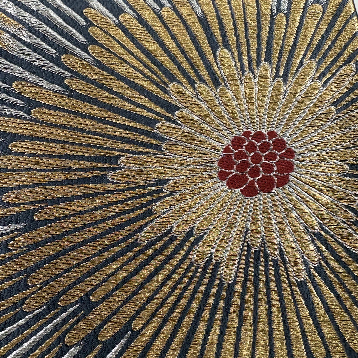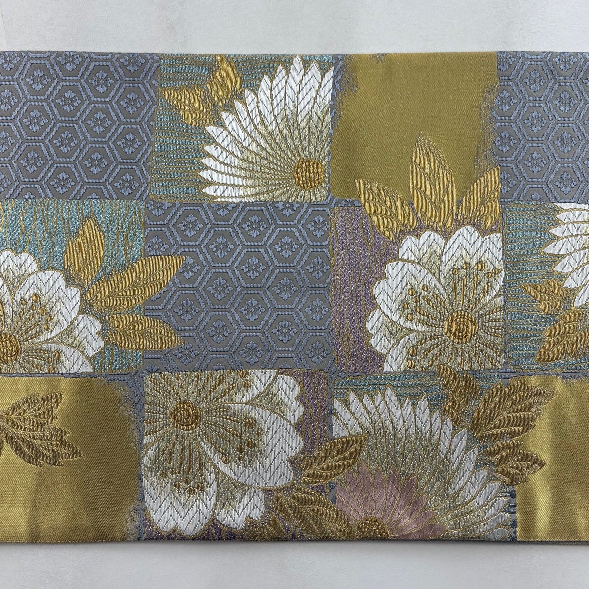 袋帯 名品 落款あり 菊 幾何学模様 金銀彩 青灰色 六通 正絹