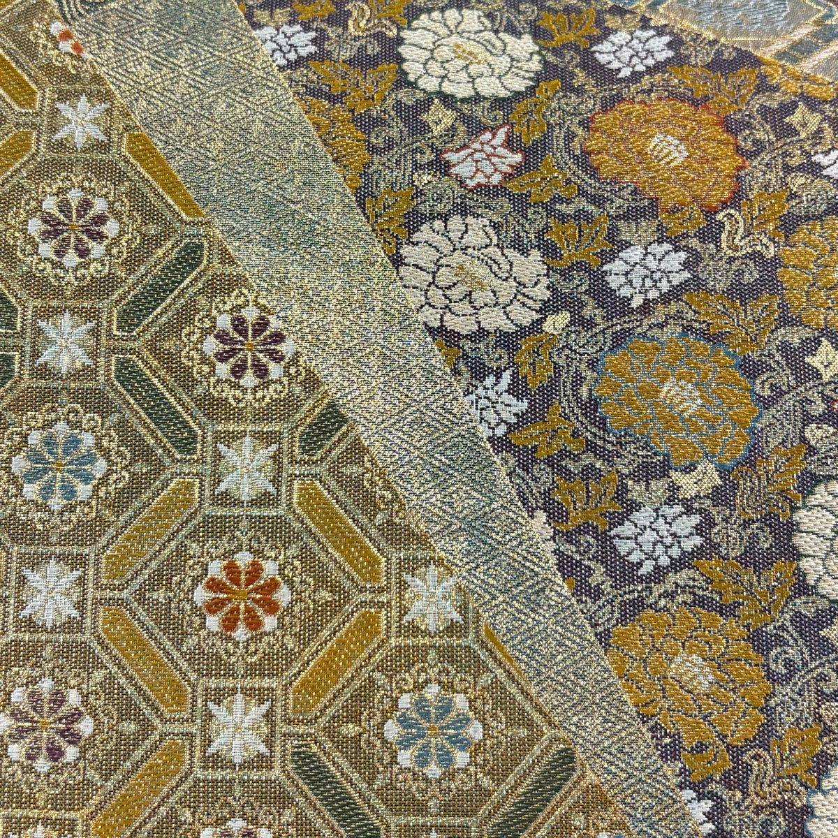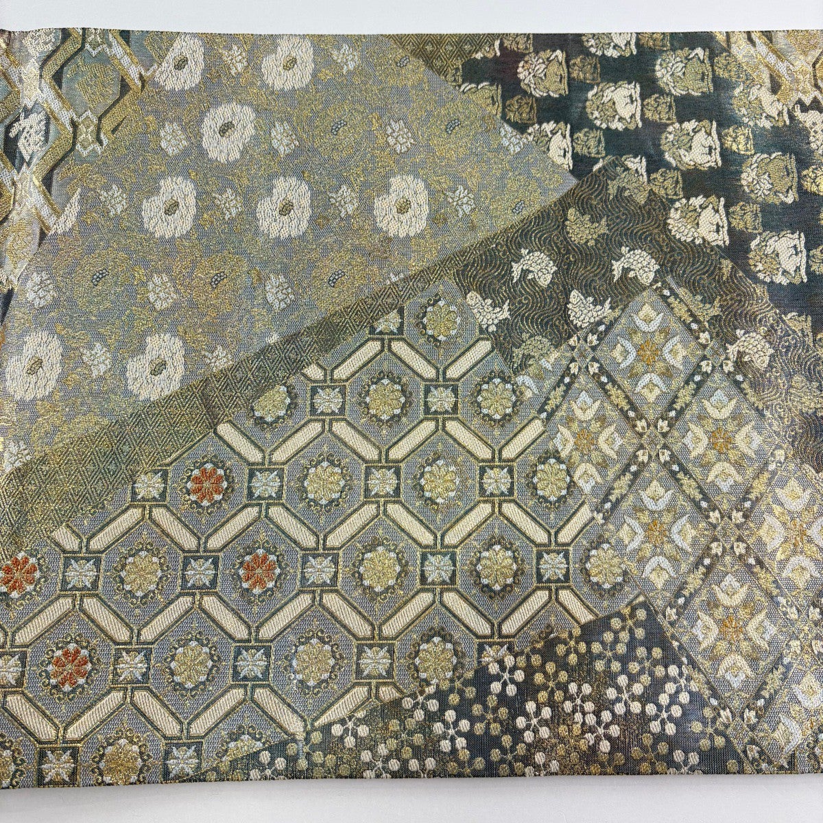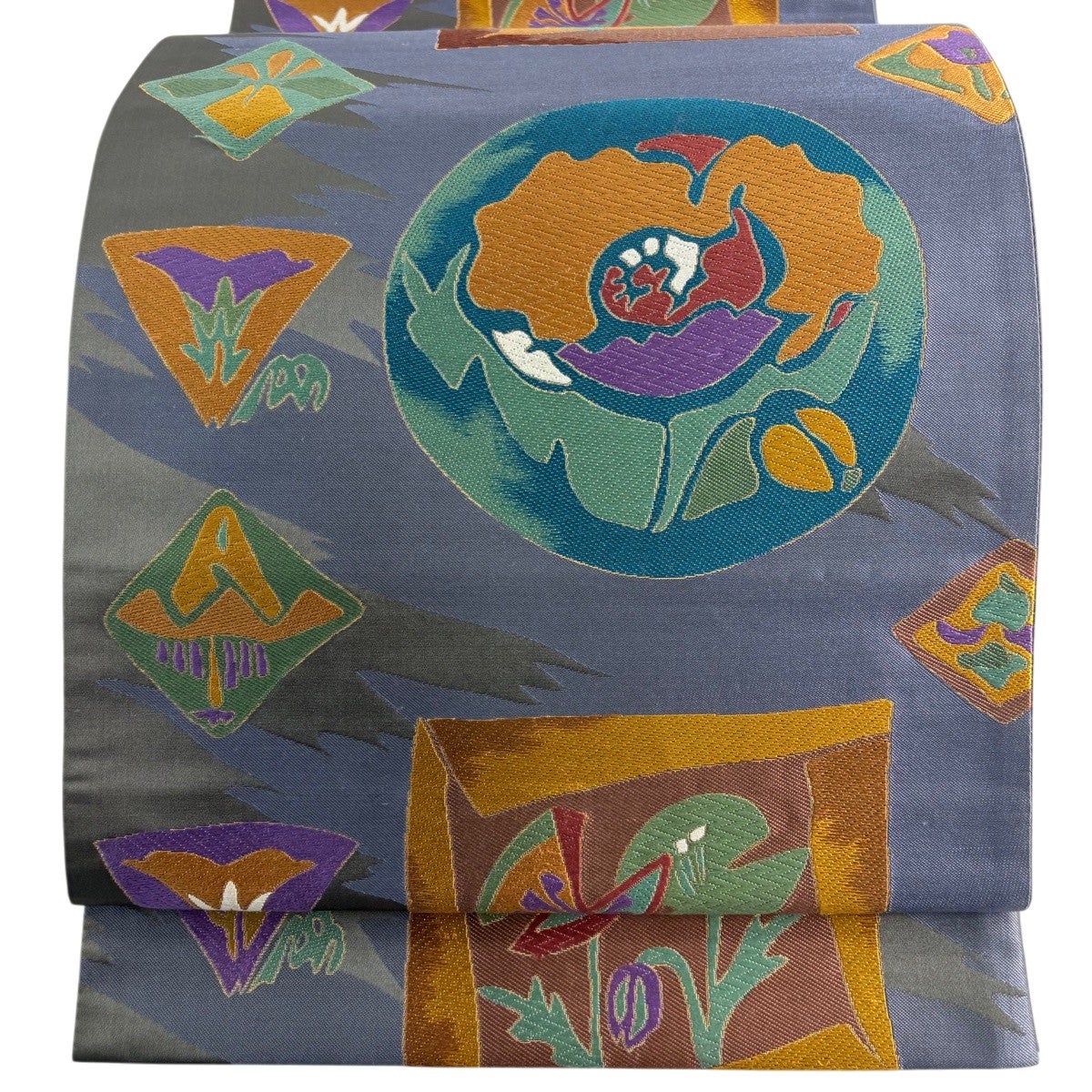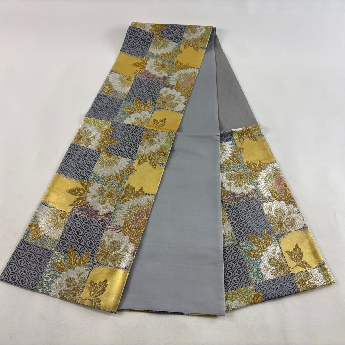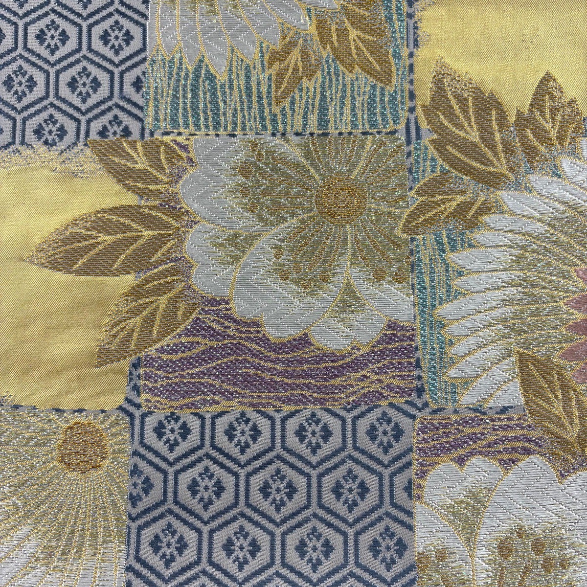 袋帯 名品 落款あり 菊 幾何学模様 金銀彩 青灰色 六通 正絹